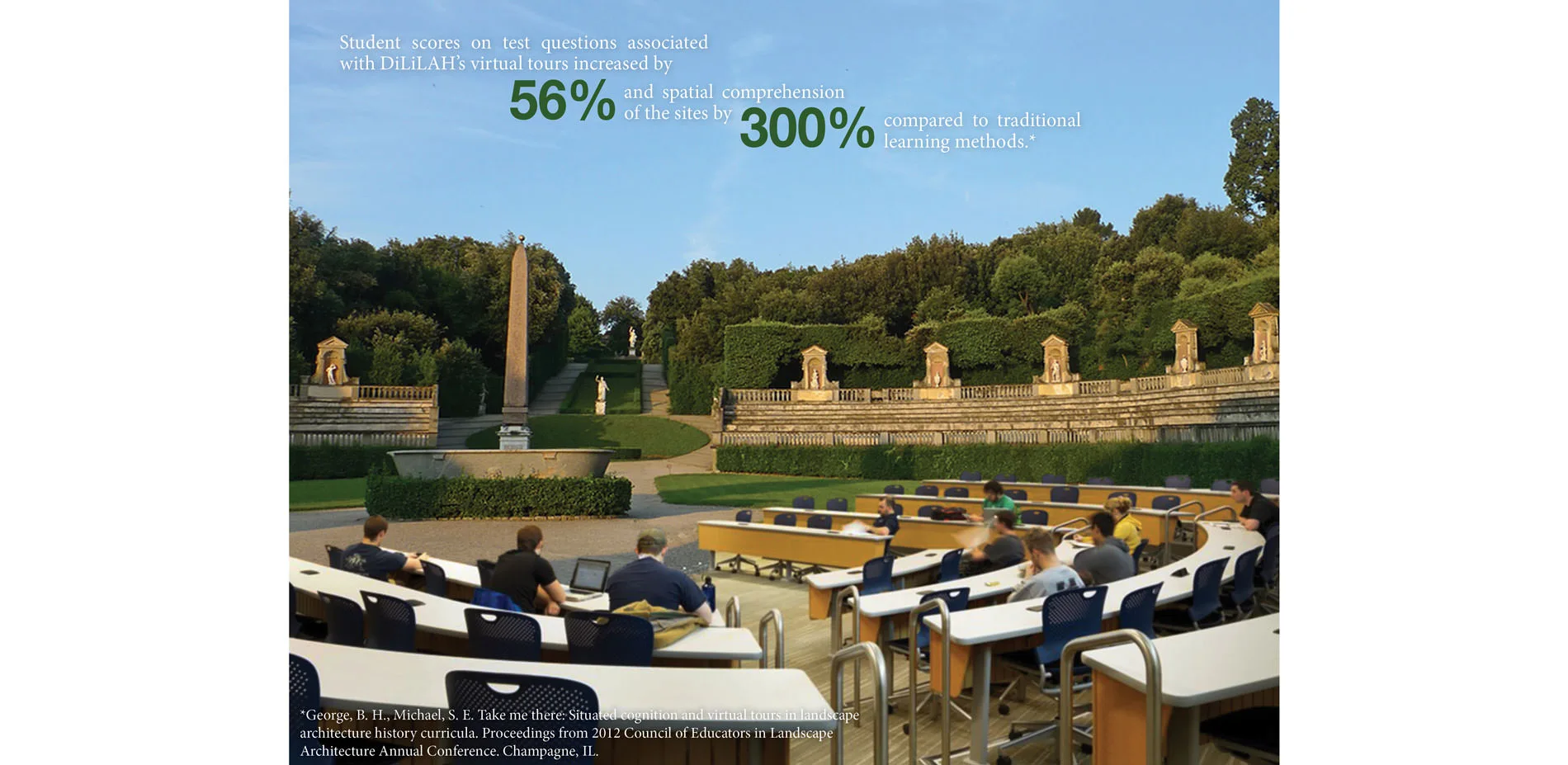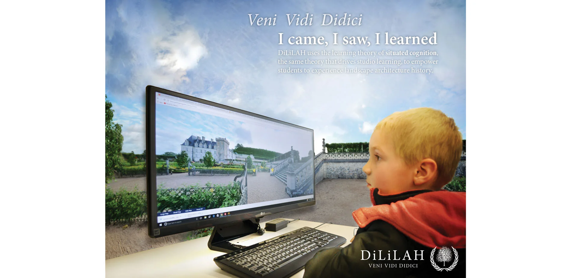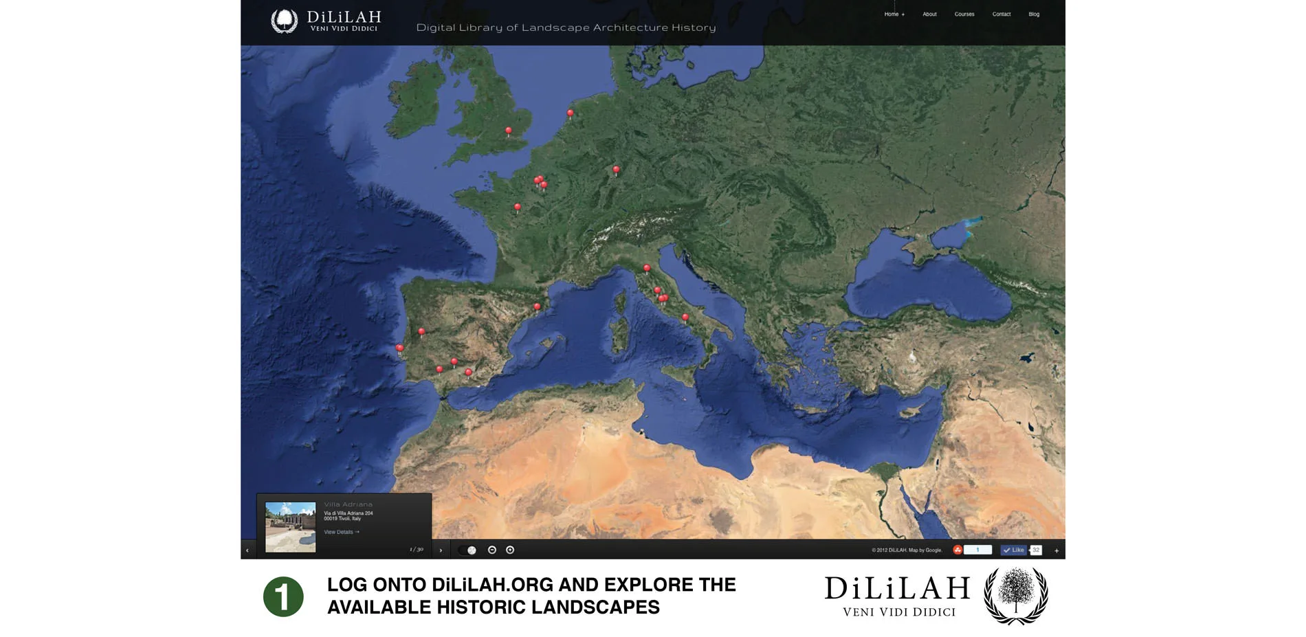 The Digital Library of Landscape Architecture History (DiLiLAH) was created to help bridge the gap of time and place in the subject of landscape architecture history. DiLiLAH is a freely available, online public repository of virtual tours of historical landscapes created for use in education. There are currently 40 virtual tours on DiLiLAH. Using immersive panoramic tours, filled with historic information hotspots, images, sounds, and videos, students are virtually transported to important historical sites across the globe. These sites are no longer just words and pictures on a page, but now they are a place to explore, a site with real structure, form, and meaning. No longer a relic of history, but real landscapes that continue to shape our world.