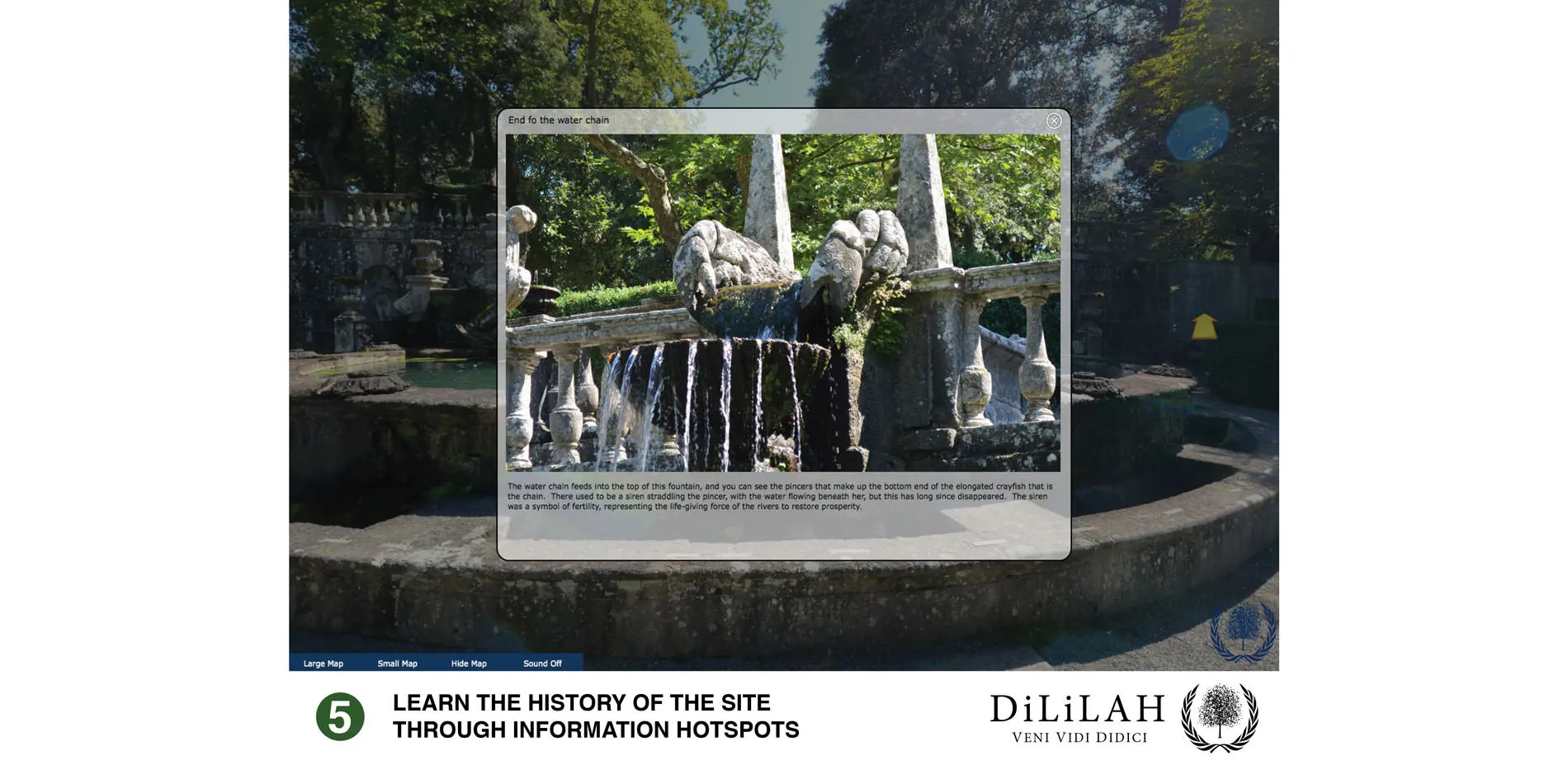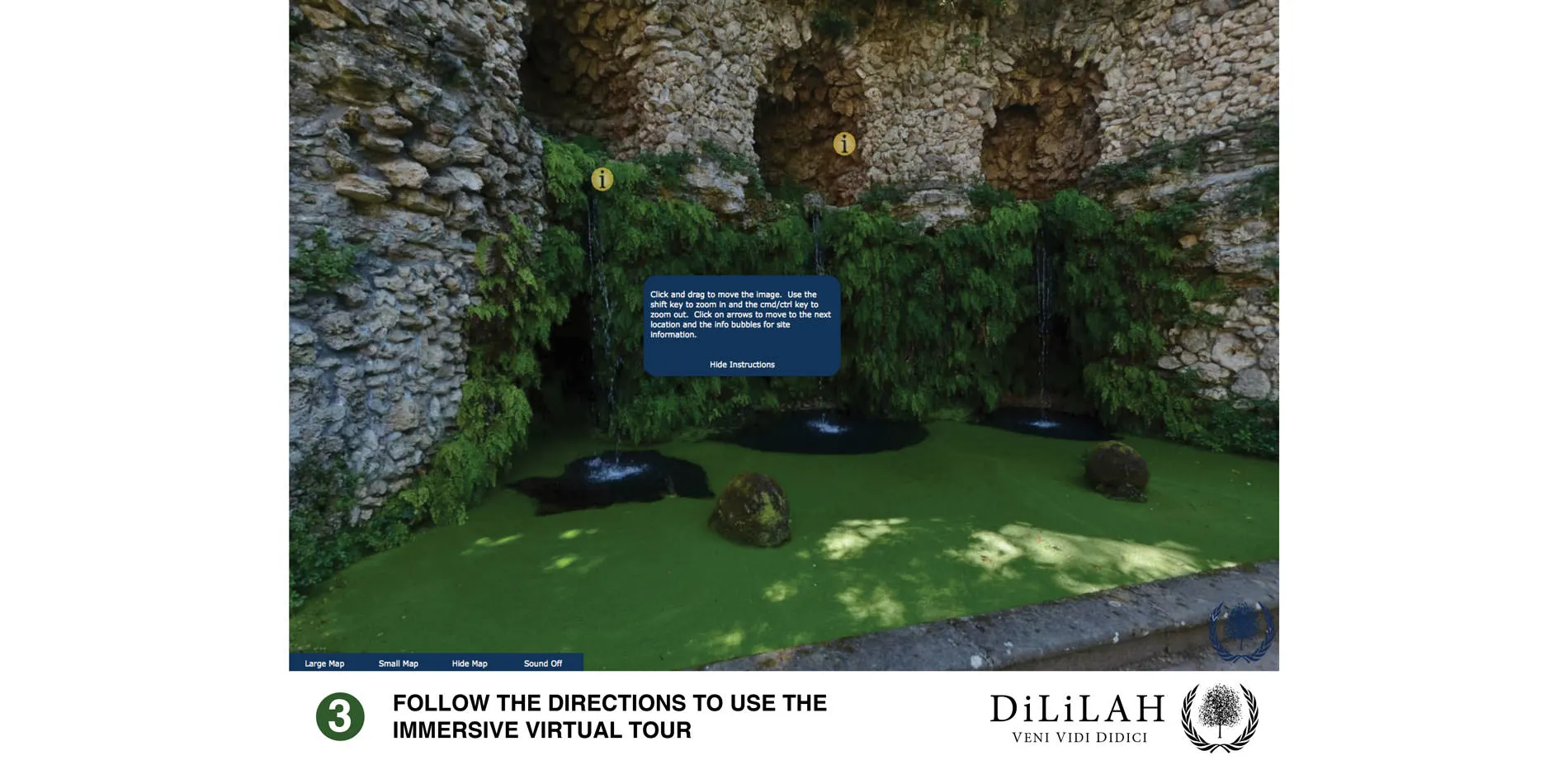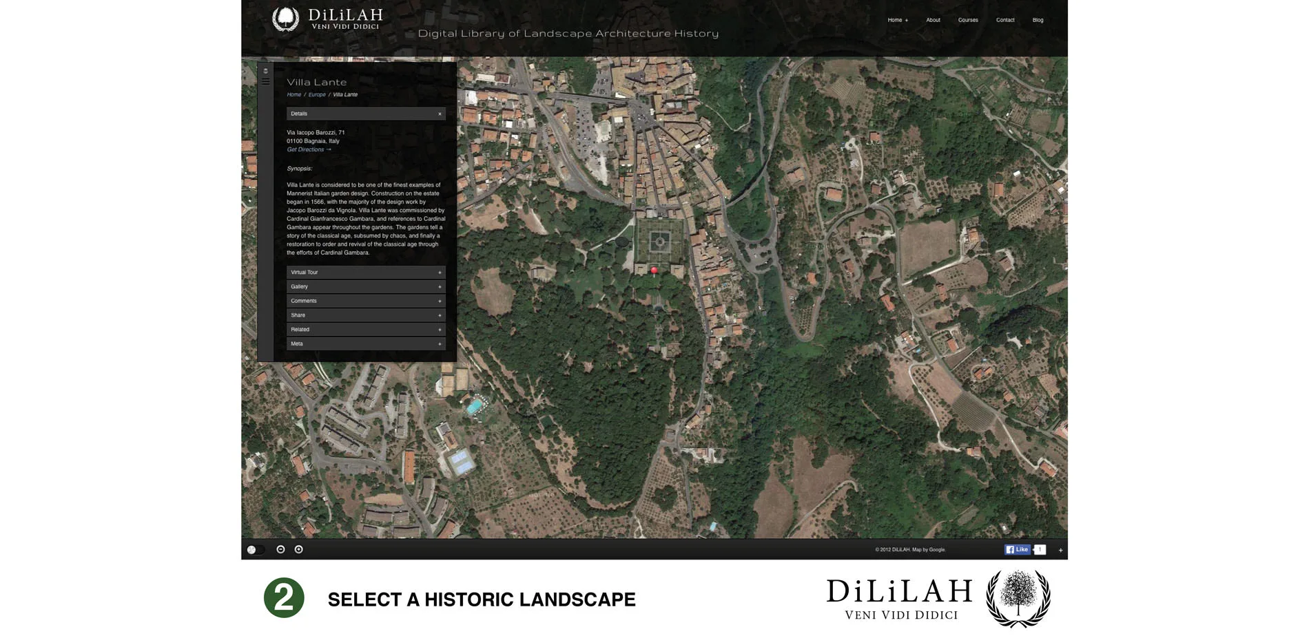The Digital Library of Landscape Architecture History (DiLiLAH) was created to help bridge the gap of time and place in the subject of landscape architecture history. DiLiLAH is a freely available, online public repository of virtual tours of historical landscapes created for use in education. There are currently 40 virtual tours on DiLiLAH. Using immersive panoramic tours, filled with historic information hotspots, images, sounds, and videos, students are virtually transported to important historical sites across the globe. These sites are no longer just words and pictures on a page, but now they are a place to explore, a site with real structure, form, and meaning. No longer a relic of history, but real landscapes that continue to shape our world.