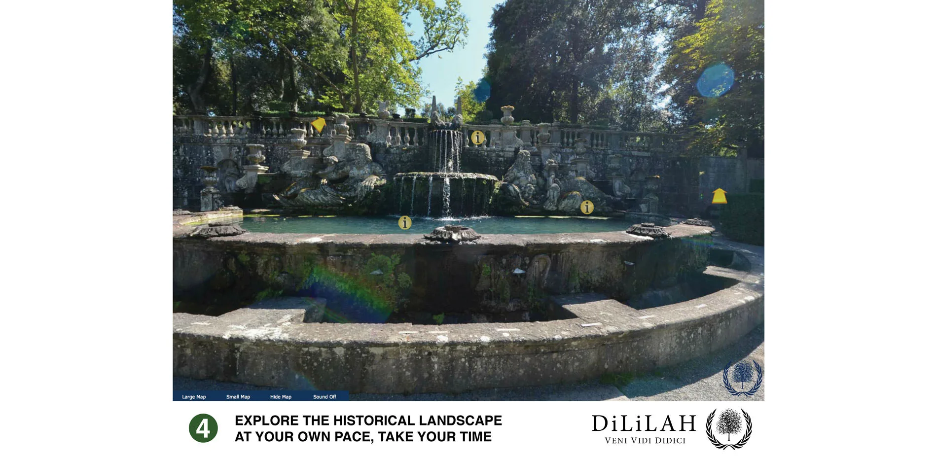 The creation of DiLiLAH began in 2012, with a month-long camping trip to Europe by Dr. Benjamin George, an assistant professor in the Department of Landscape Architecture & Environmental Planning at Utah State University. During this trip, photographs were taken of fifteen landscapes that were subsequently used to create the first virtual tours in what would become DiLiLAH for use in his history of landscape architecture course. Due to their popularity with students and repeated requests from individuals at other universities, they were made available on DiLiLAH for educational use. Over the last several years, additional tours have been added until today, forty tours are available. The tours are made using high-resolution 360-degree panoramic images. Each panoramic image requires the stitching together of 11 to 20 images, before the individual panoramas are connected through the virtual tour interface, which includes navigation elements and information hotspots.