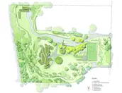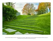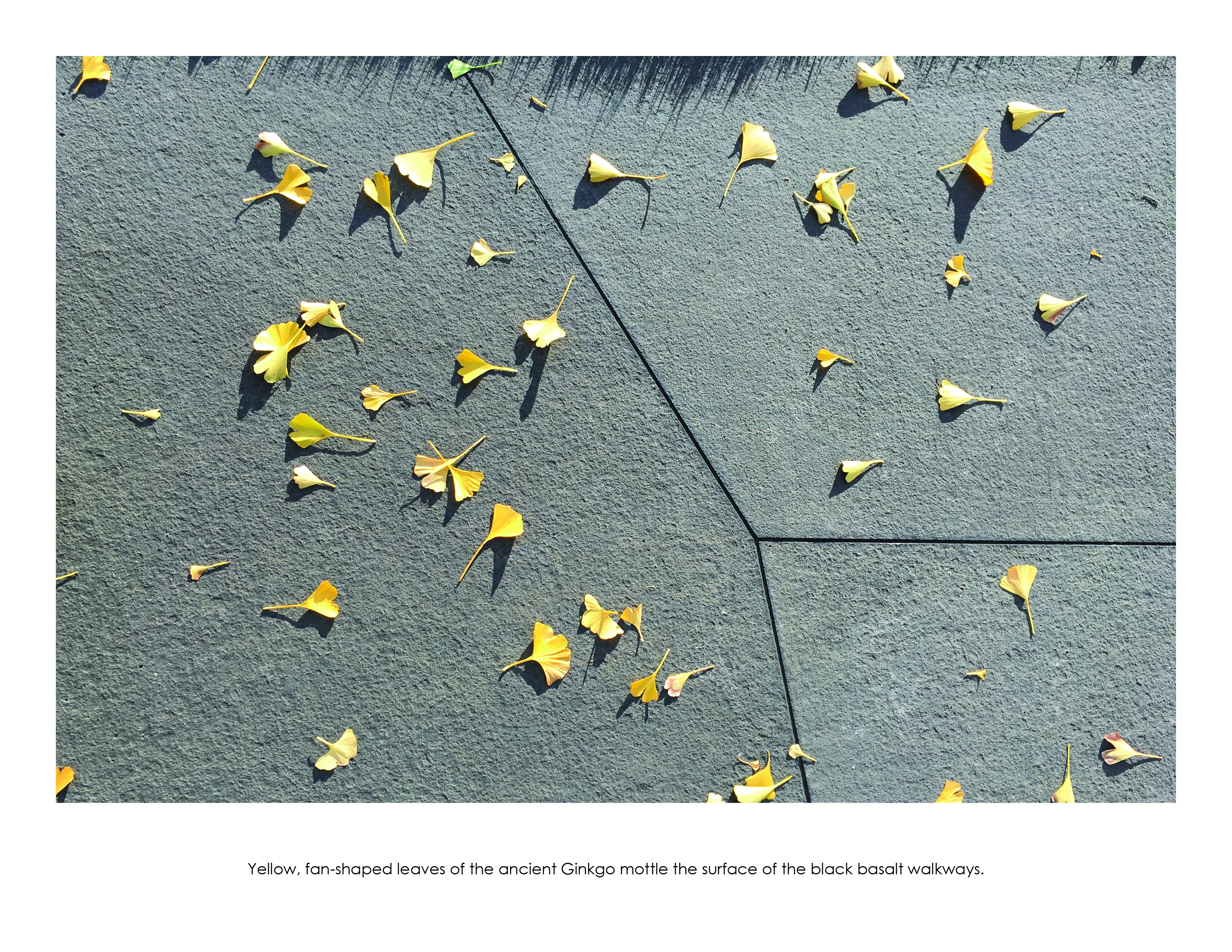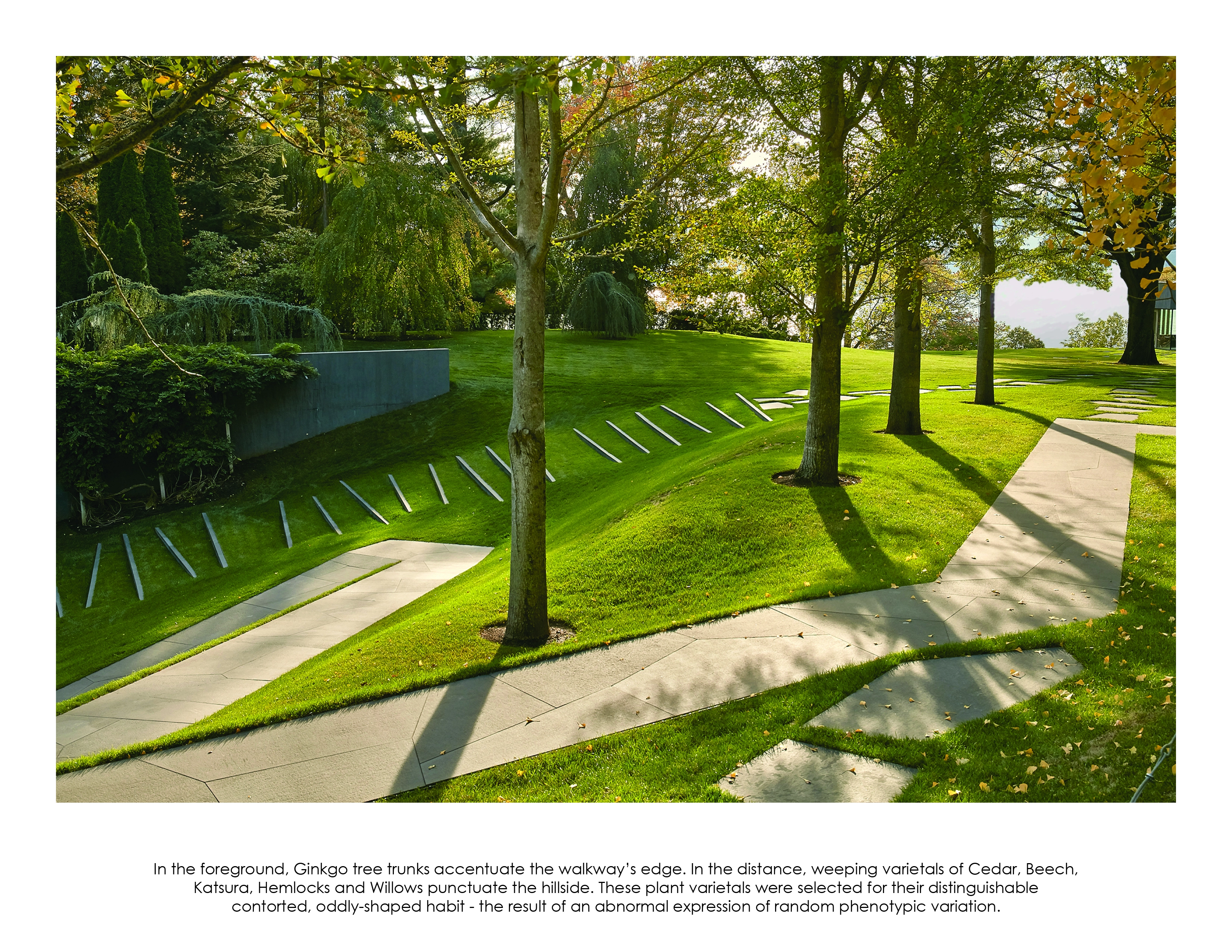 It’s in a grove of gingkoes. Consider how the stone in the path is cut to abstract the falling gingko leaves, giving an Asian feel.