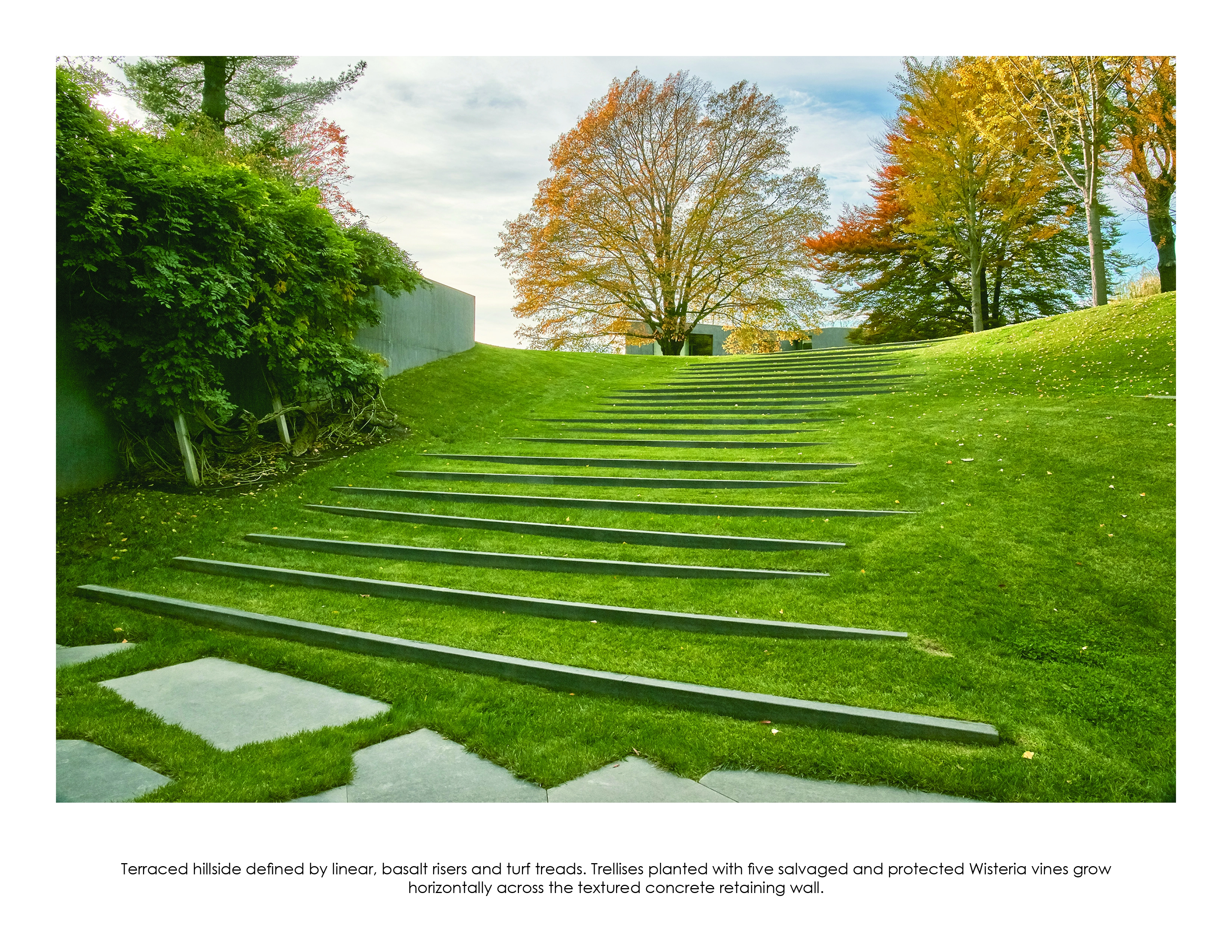 The sheer cliffs that define the unique geologic character of this region, began 200 million years ago with the retreat of the glaciers at the end of the Triassic period. Ice flows melted and fractured, sloughing off the uppermost layer of sedimentary sandstone exposing the underlying diabase sill to a freeze-thaw cycle that ultimately created the escarpment’s vertical crevasses. It is the textured, extruded remnants of this geologic rarity – the grooved basalt cliffs and forested talus slopes – that inspired the design team’s minimalist approach to this modern residential landscape.