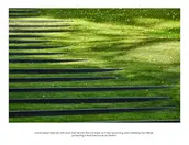 Hardscape elements take the form of irregular polygons and angled lines arranged in a seemingly chaotic configuration to abstractly evoke the concepts of entropy and evolution. Walkways are composed of 4, 5 or 6-sided black basalt pavers laid out in a unique, non-repeating pattern that breaks apart from the whole into erratic fragments beneath the existing trees. No two stones are alike. As the grade drops off toward the pool house, the stone transitions to linear basalt risers set at random angles with ends that tie into the slope as if their purpose is to pin and stabilize the hillside, protecting it from the forces of attrition.
