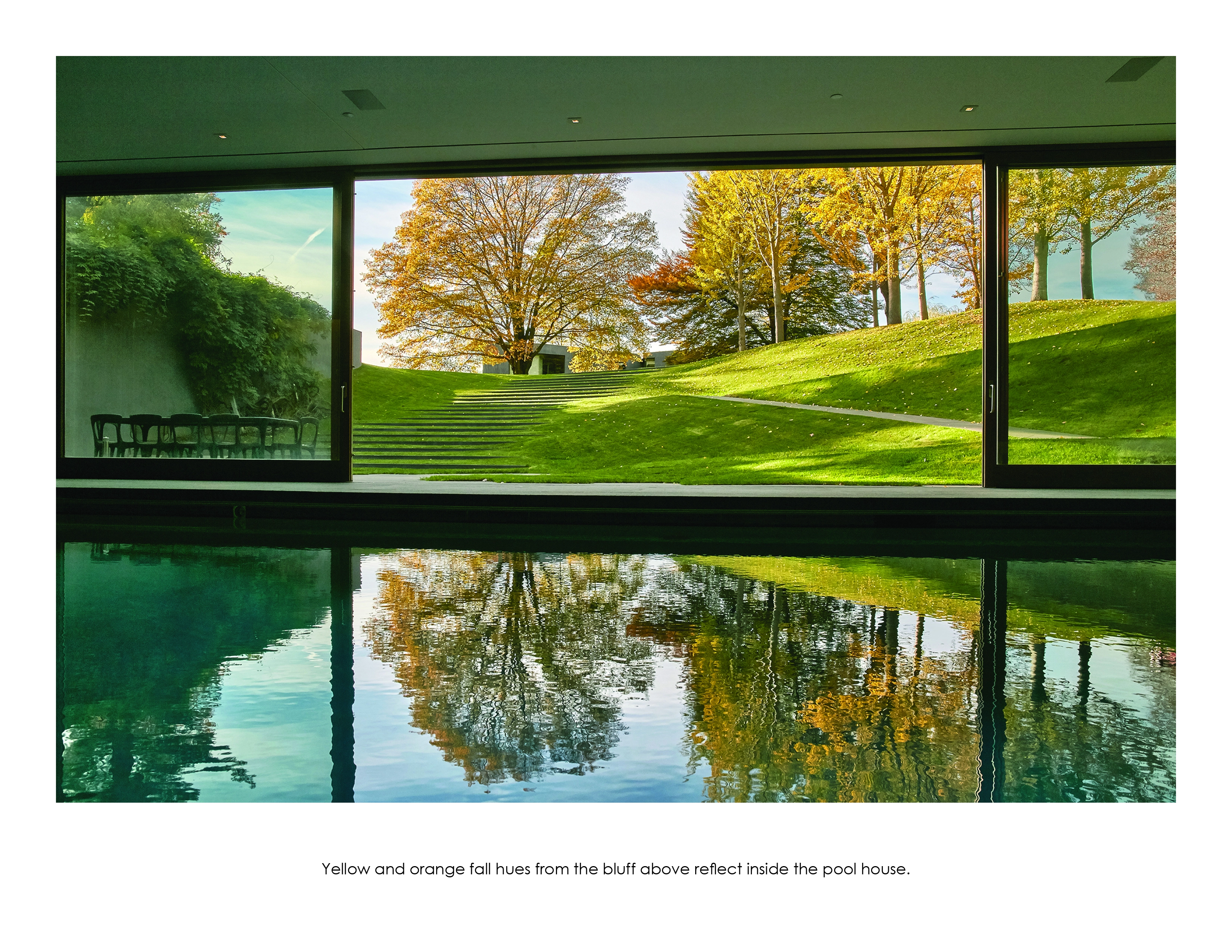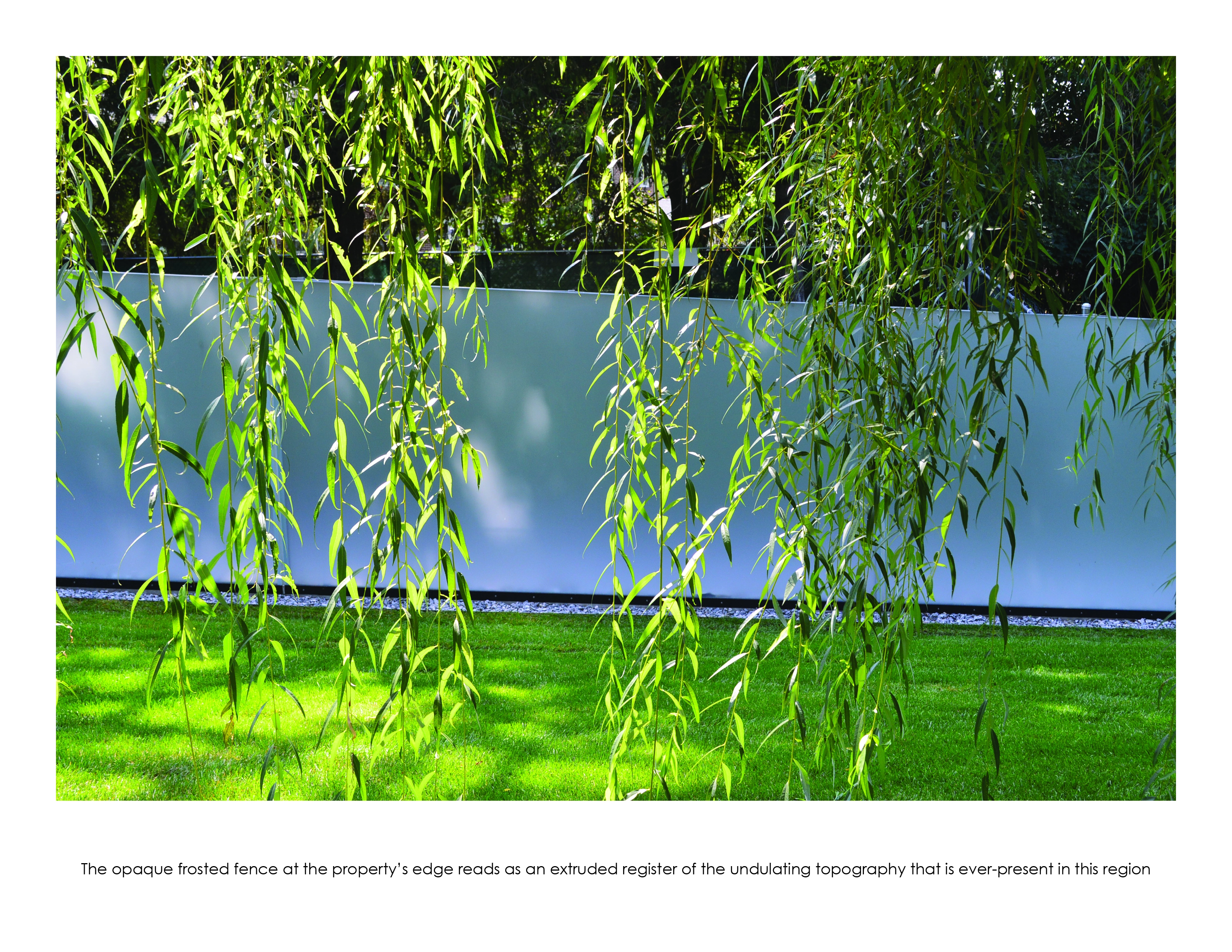 The site’s terrain is also magnified at the property’s edge where a high solid glass fence in a frosted finish undulates continuously with the peaks and valleys. When viewed from a distance, the opaque white line reads as an extruded register of the extreme topography ever-present in this region.