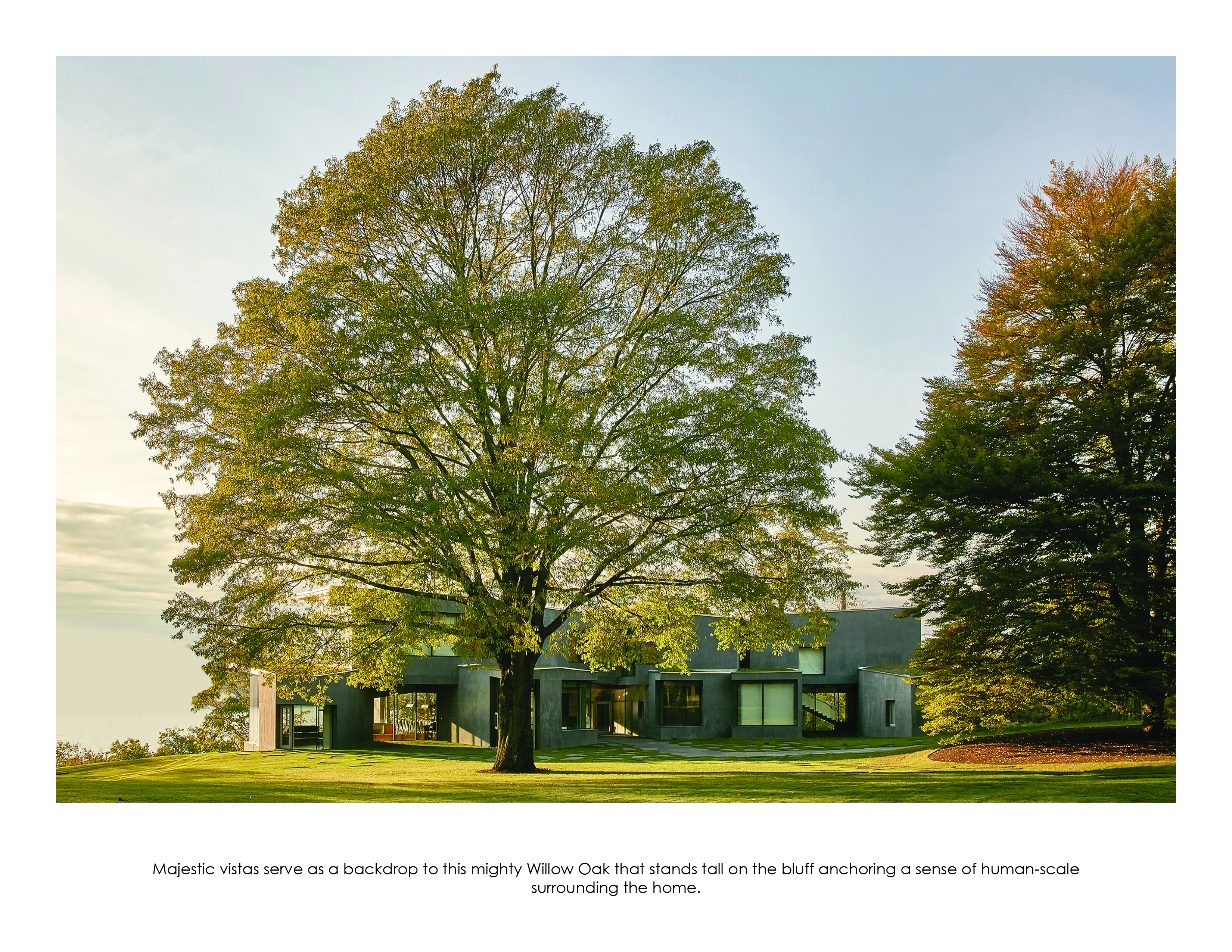 The angled concrete residence sits atop the precipice of a bluff, maximizing views to frame fissured rock faces in the distance. Existing stately deciduous shade trees – a Willow Oak, Fern Leaf Beech and three Ginkgos – were carefully protected throughout construction in a strategic effort to preserve the spirit of place and anchor a sense of human-scale surrounding the home.