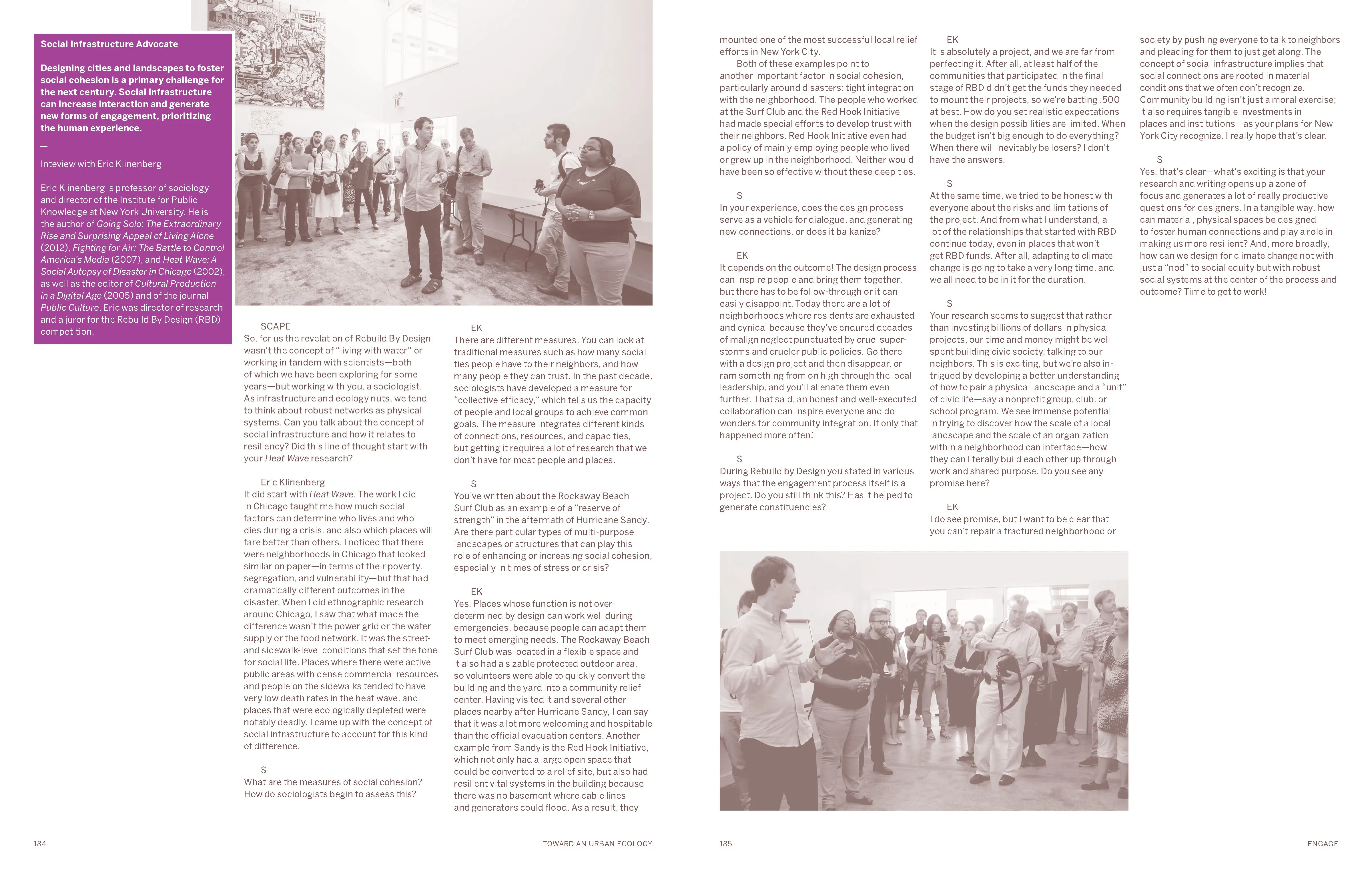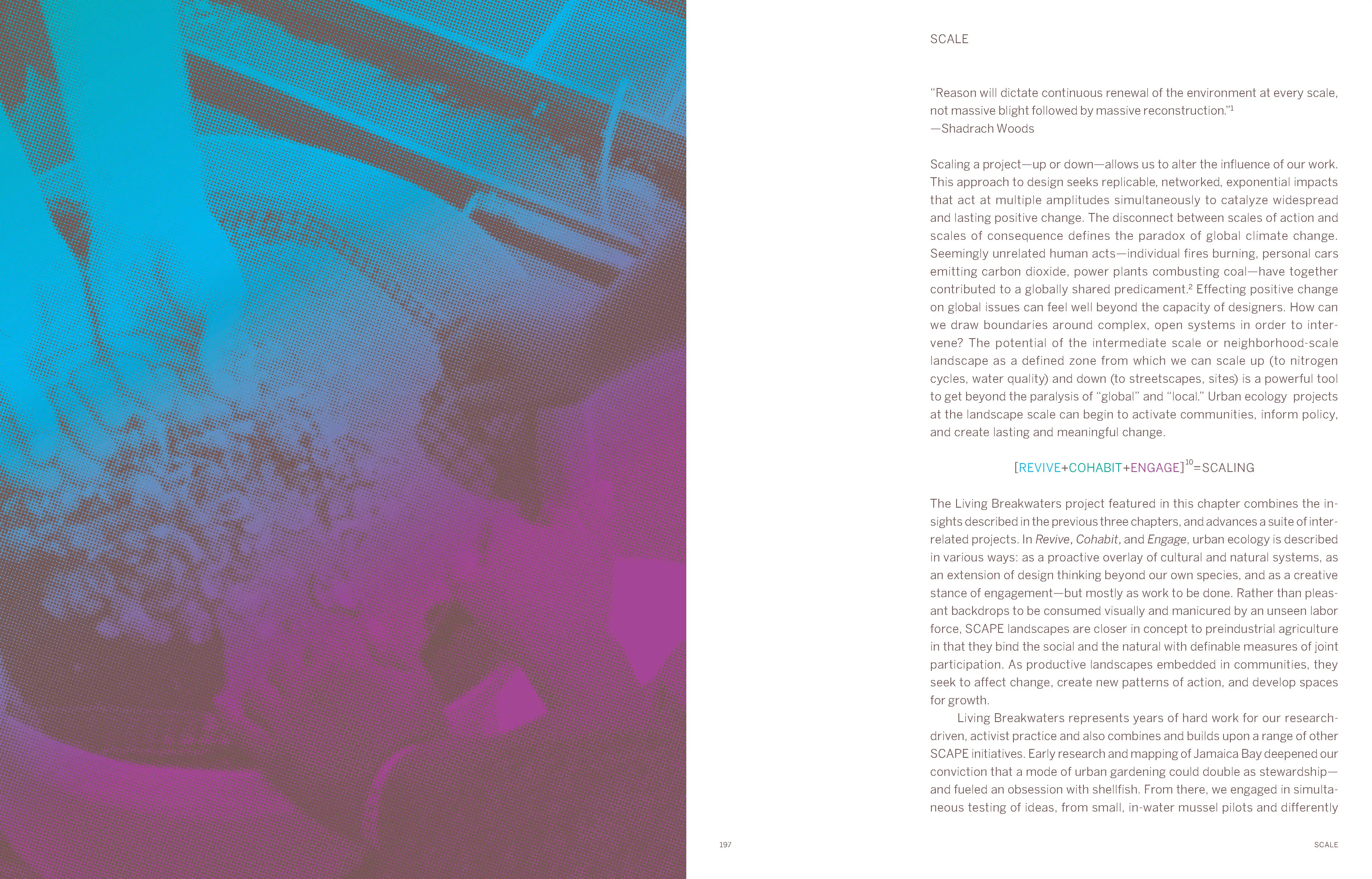 The Chapter titled Revive explores a design ethic that overlays natural and cultural systems toward the common purpose of generating eco-awareness. It features public spaces that hold water, and downtowns that can reclaim and reveal their relationships to rivers and bodies of waters that sparked their formation. Cohabit features projects that extend design thinking beyond our own species and that enliven the public realm to make space for animals and more diverse biology. Engage illustrates how design processes can hybridize community organizing techniques to nest project making within social life. Scale demonstrates the integration and scalability of the ideas and shows the potential for landscape practice to radically span scales from micro-pilots and ecological experiments to macro scales of planning and analysis.