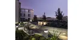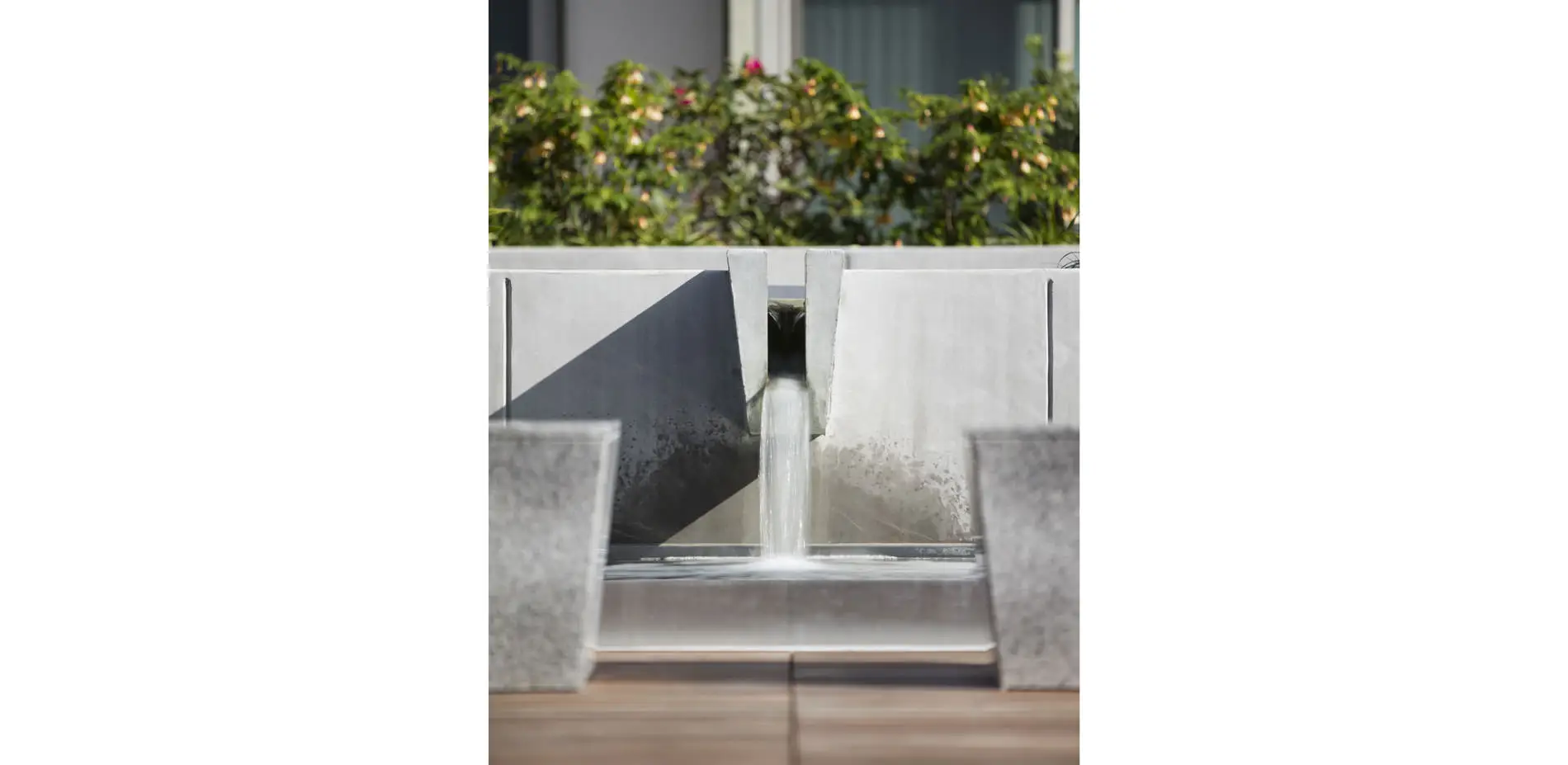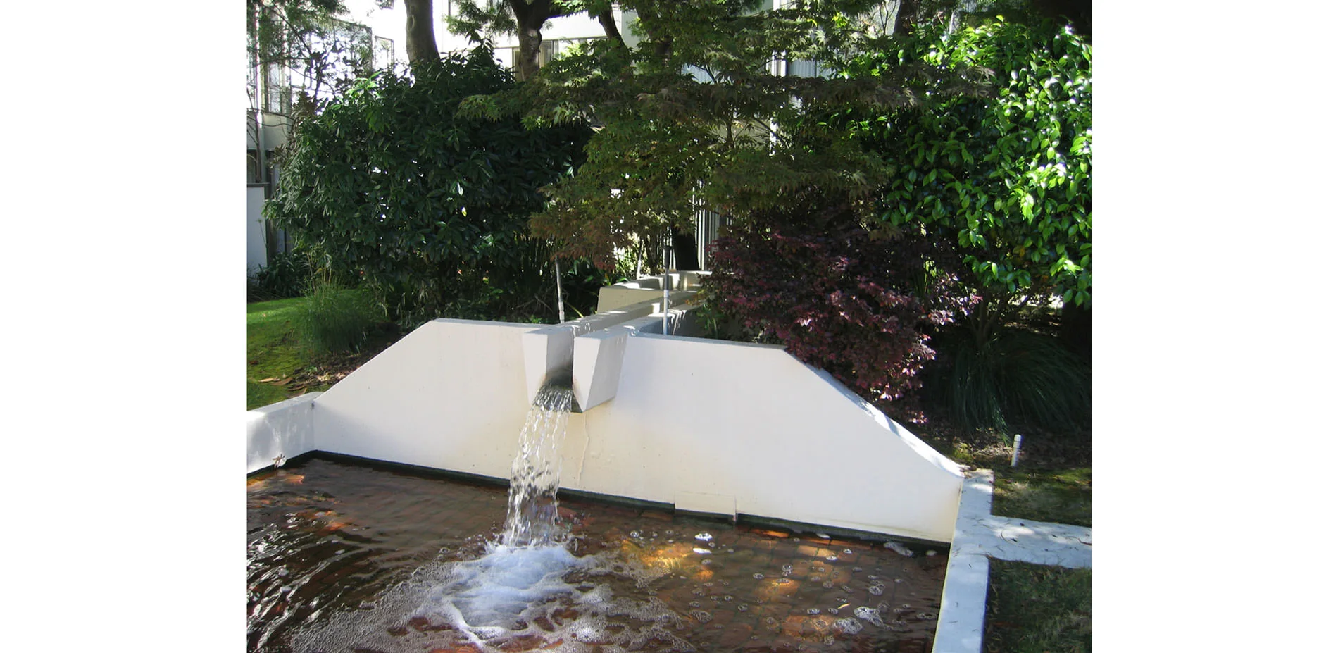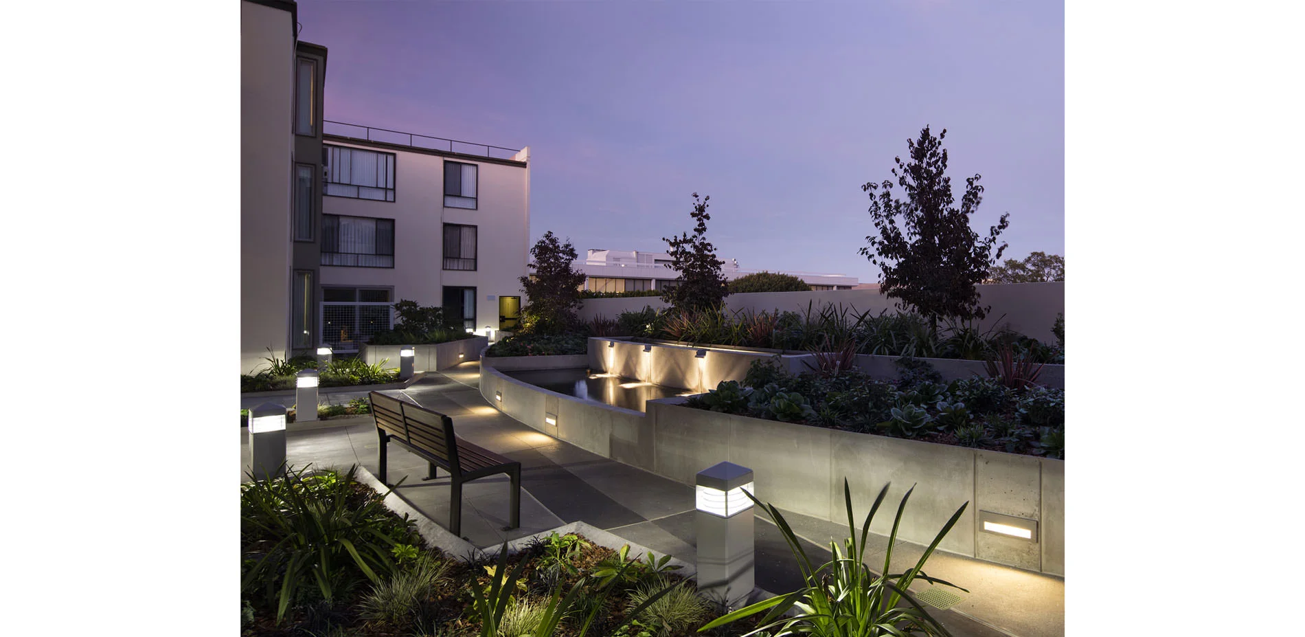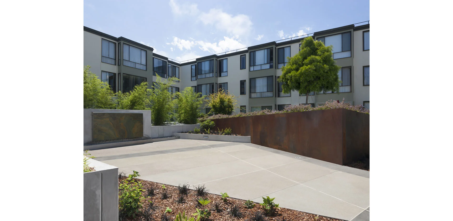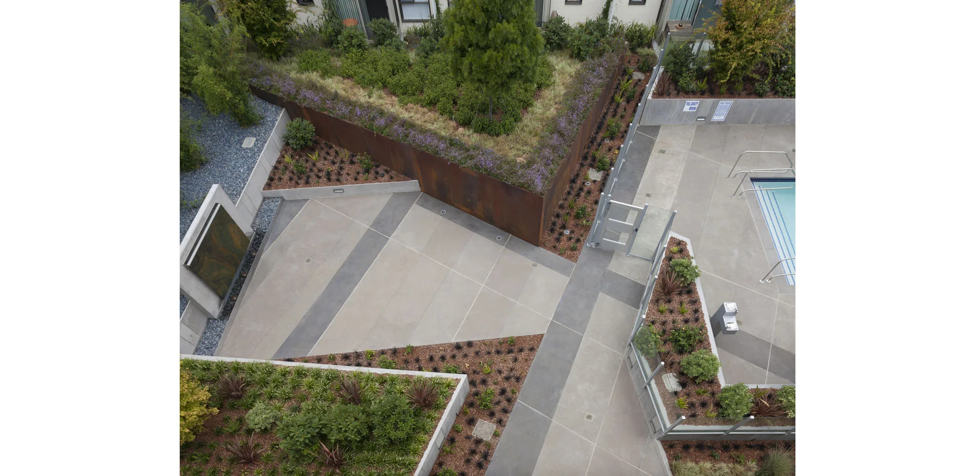 The original courtyard landscapes, designed by the office of Lawrence Halprin, had to be removed because of the failure of the decades-old waterproofing systems, which threatened the building structure as a whole. All five courtyards—four fully internal, the fifth at an adjacent property line—provide both common space and individual patios for first-floor apartments. Two of the principal courtyards have swimming pools; the other two have significant water features. At the client’s request, which corresponded with the designer's philosophy, the new landscapes do not attempt to replicate the original designs by Halprin, but instead are conceived as an homage to him in the elements he combined with such insight: water and stone. As a part of the research undertaken to understand Halprin's original intent, his project manager was invited to review the new scheme, of which he observed, "You have done a splendid job of maintaining the spirit of the original designs while updating them in both feeling and materials." Each of the five courtyards has a distinct character, but they are united by a vocabulary of form, color, and refined detail that picks up on and enriches the language of the buildings designed by Wurster, Bernardi & Emmons. Constrained by the slab from going deeper, both planting and water elements are raised up, providing space for infrastructure and increased soil volume to intercept rainfall and slow runoff. Yet the goal is ultimately spatial: separating more equitably defined private patios from well-proportioned common spaces anchored by focal elements —a sculptural water feature, a massive, sculptural steel planter, a tree.