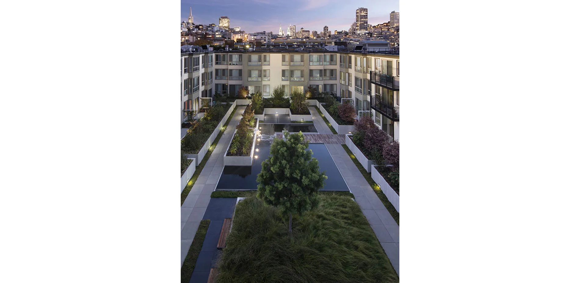 The NorthPoint Apartments, built in 1969 in San Francisco’s North Beach neighborhood, featured five courtyards designed by the office of Lawrence Halprin, located over podium parking. Half a century later, as the courtyard landscapes had to be replaced due to waterproofing failure, the design team successfully reinvented the project while meeting two aggressive challenges: honoring Halprin's legacy in a contemporary fashion; and reapportioning common and private spaces to meet changed expectations, within the tight constraints imposed by the original flat-slab construction. The strategy is one of carefully proportioned spaces, animated by finely detailed abstractions of the natural elements of water and stone: an homage to Halprin in the materials he used with such insight. All five courtyards — four fully interior and one at the adjacent property line — share forms and colors that pick up on the language of the surrounding buildings, but are differentiated from one another in their geometry, palette of plant materials, and focal elements.