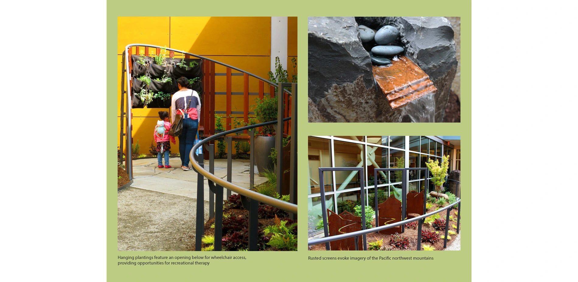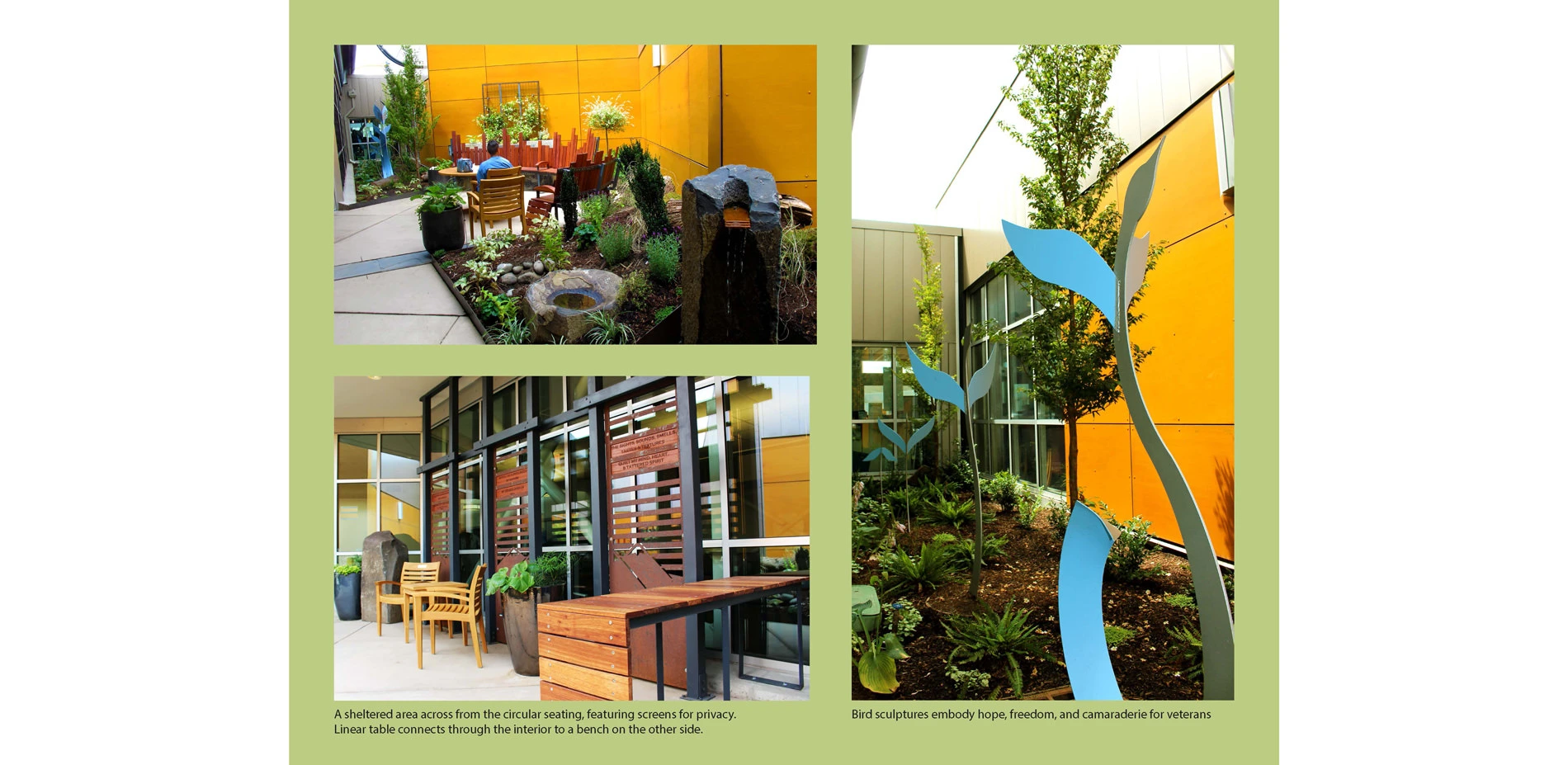 On route to the Earth Room, LED lite screens and path lighting allows for night visitation, and graceful hand rails provide safety for anyone with balance or mobility difficulties. The Earth Room grounds users in this protected space and invokes feelings of connection to soil, stone and vegetation. Densely planted berms enhance the feeling of being immersed within the landscape. Through the initial stakeholder meeting, we learned that there was strong preference to include a green wall, voluntary plant maintenance, and opportunities for interaction with nature and wildlife. We also found through research that therapeutic gardening can be particularly helpful for Veterans with physical and mental health challenges. The Earth Room’s green wall was conceived as an opportunity for physical and occupational therapy in a small space. An opening along the bottom of the wall allows users in wheelchairs to roll under the wall and then reach up and touch the aromatic herbs while directly facing the plants, rather than having to uncomfortably torque their bodies by sitting sideways to the garden, which is typical of most raised bed gardens. Sensitivity to the complex needs of the user group was evident in the inclusion of these universally designed features throughout the garden. The forest room is furnished with sculptural elements representing birds in flight, small trees, bushes, and low perennial plantings. Designed as a viewing garden, it is visible from the interior corridors and through floor to ceiling windows in the emergency department.