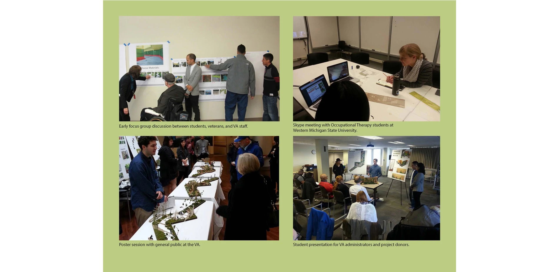 At the onset of the project, we recognized that the experiences of veterans were profound and varied, producing a complex range of physical, sensory, and mental health diagnoses that we as a design group had little understanding of. In order to determine and better understand how the garden could help to ameliorate these complex issues, we gathered information on multiple levels. First, we disseminated a survey with questions about specific needs, challenges and activities potential users would desire and prepared visual preference boards for stakeholders to rank. Focus groups were held with veterans and staff from the hospital who responded to queries about their aesthetic preferences (e.g., lighting, water, paving, seating) for design elements, as well as shared their views of meaning and symbols that should be incorporated into the garden. From the surveys, visual preference boards, and focus groups, we discovered that there was a strong desire for including running water, lush plantings regionally appropriate materials, specific imagery, and opportunities for both privacy and gathering within the garden. The same participants evaluated the design proposals and gave direction for the preferred alternative.