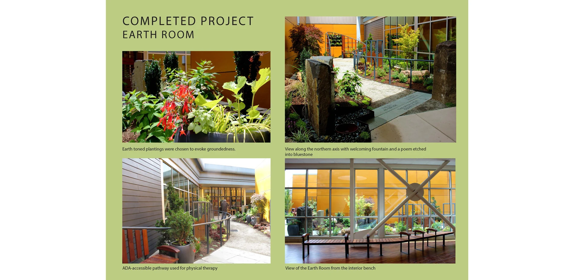 Programmatic goals include providing a calming refuge and place of respite, place to increase social interaction, spaces for meditation and a green counterpoint to the institutional quality of the hospital environment. The site is an enclosed courtyard space flanked by floor-to ceiling windows along its border, and a secondary goal was to incorporate privacy screening for garden users while simultaneously offering a pleasant, meaningful view from those indoors.