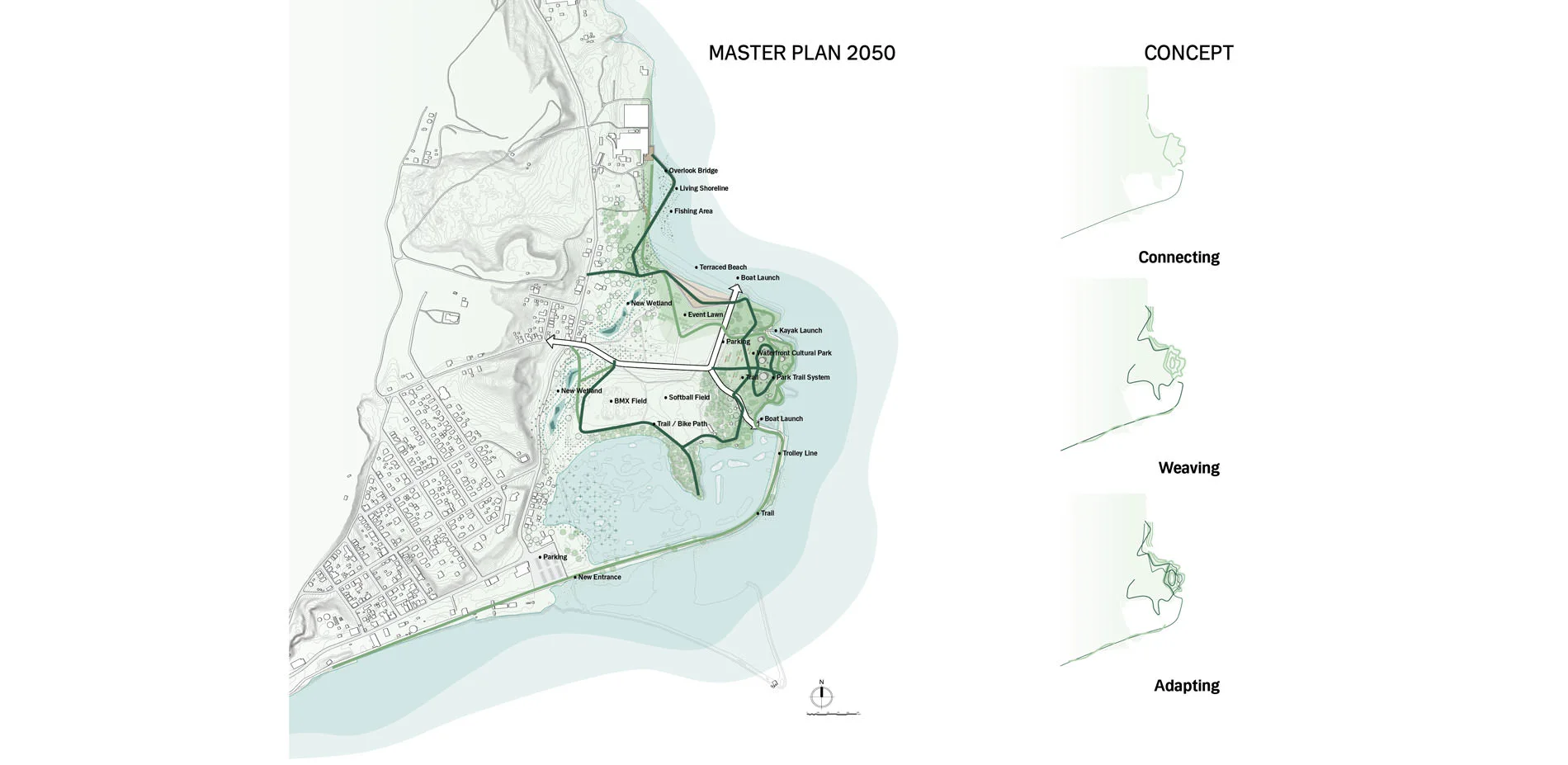The Weaving the Waterfront proposal revitalizes a 38.3-acre site along the Kingston Point by introducing original ideas of ADAPT, REINFORCE and RETURE. Focusing on the issues of climate resilient strategies, public spaces, and wetland restoration, this proposal coordinate nature, human and climate change with dynamic process and minimized earthwork.