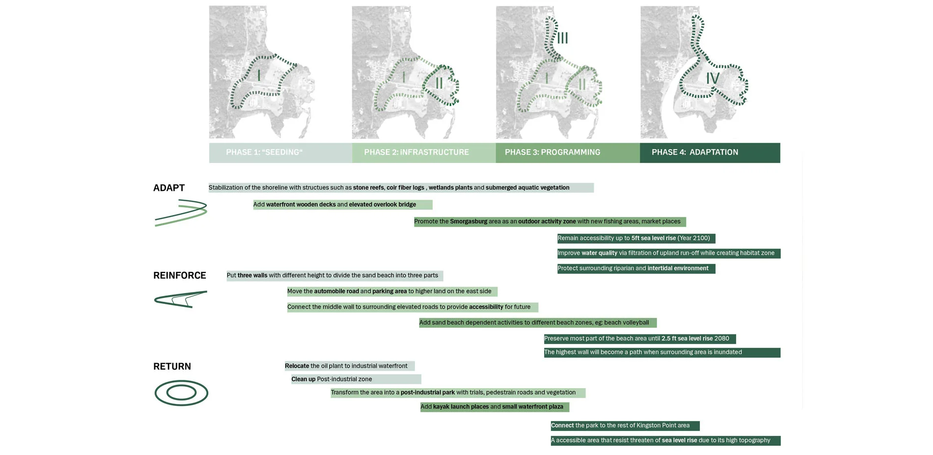 For over four century, waterfront of Kingston Point have experienced vicissitude of both nature and culture providing spectacular beauty, rich history, and ecological resources. Today, however, these values are threatened by changing climate and will end up in decrement and fragmentation. It is the major task to make the waterfront vibrant and active through the next hundred years and beyond for generations.