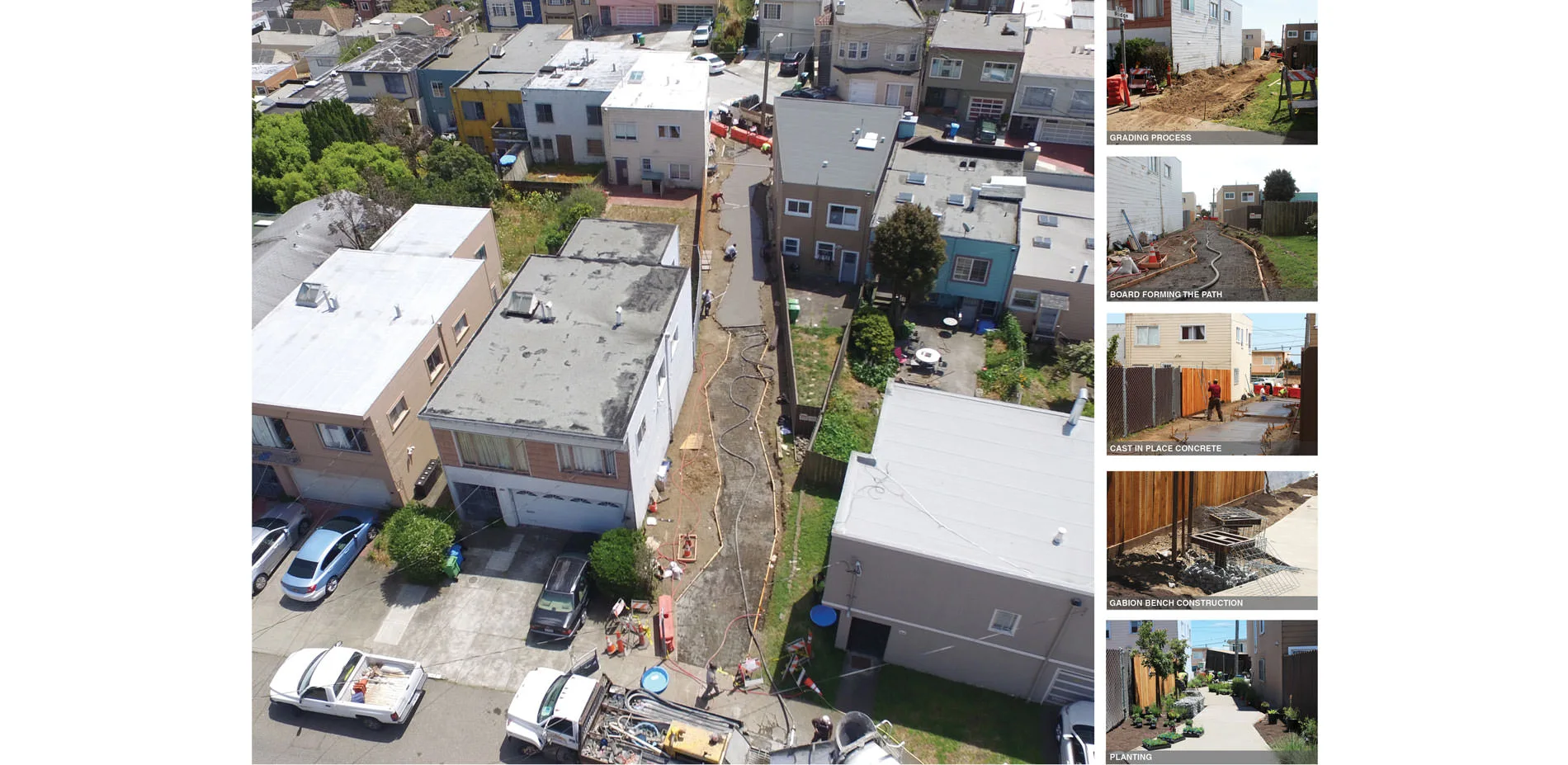 The design of the remaining parcels has been coordinated with the in-house landscape architects and structural engineers of the San Francisco Department of Public Works to ensure its compatibility with city codes and standards. Due to its size and current hazardous conditions, Parcel 4 was chosen to be developed next. Thanks to the finalized plans and conceptual imagery, Ridge Lane Neighbors have acquired a government grant to fund the construction of Parcels 3 and 4.
