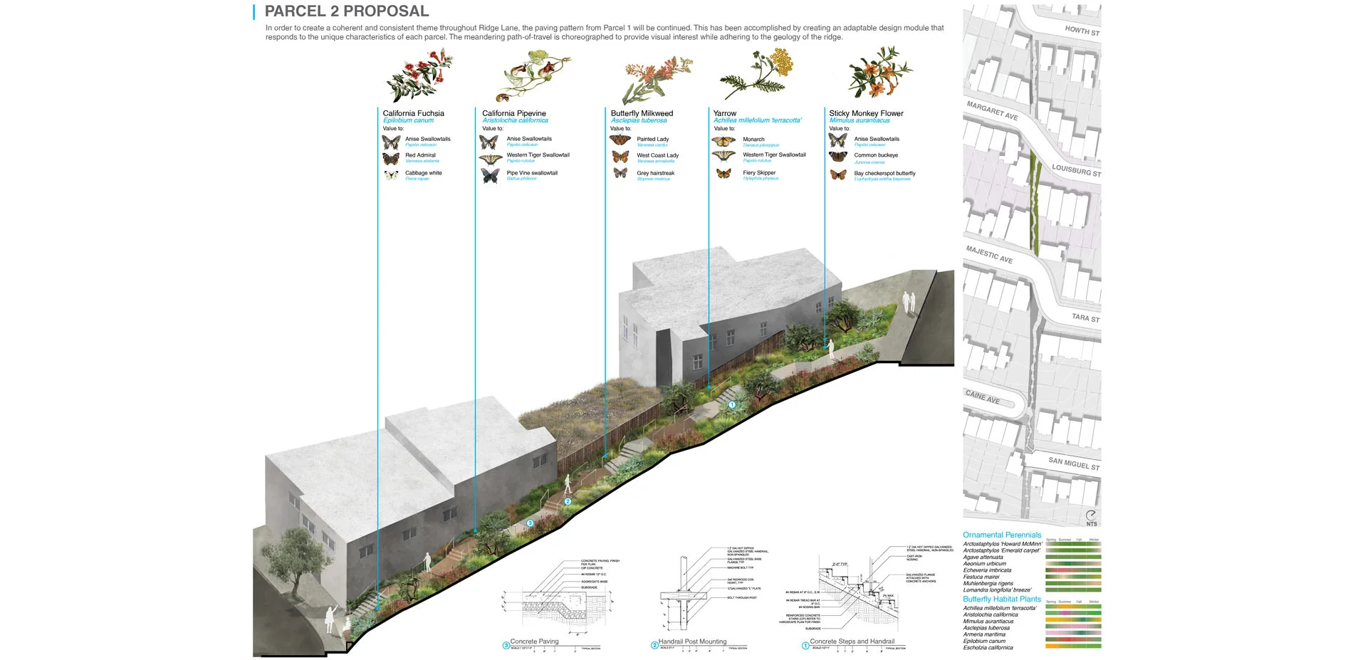 Located in the Ingleside neighborhood of San Francisco, Ridge Lane is one of 1,500 vacant public spaces owned by the City. The site is 15 feet wide and approximately a quarter mile in length. It is composed of five individual parcels separated by city streets.