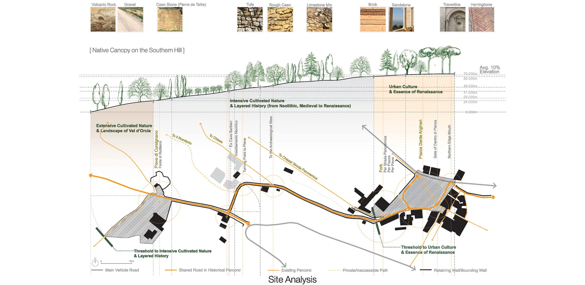 The latest UNESCO reports of world heritage have highlighted the preservation of Pienza in a crucial relationship with its surrounding multi-layered landscape. The project site is situated on the limestone platform of Pienza, with a transitional landscape between the urban hill top and the agrarian valley. This landscape through the percorsi demonstrates a humanistic variety extending from urban artifacts, intensively cultivated hill, to the vast agrarian valley in Val d'Orcia. However, the multi-layered history of Pienza is only preserved within every historical site boundaries, and the existing percorsi are used as a shared asphalt road, which overlooks the continuity and legibility among the historical sites. Therefore, I argue a need to conserve and articulate the historical percorsi as a walkable transect through the multi-layered landscape and history in Pienza.