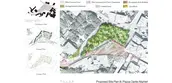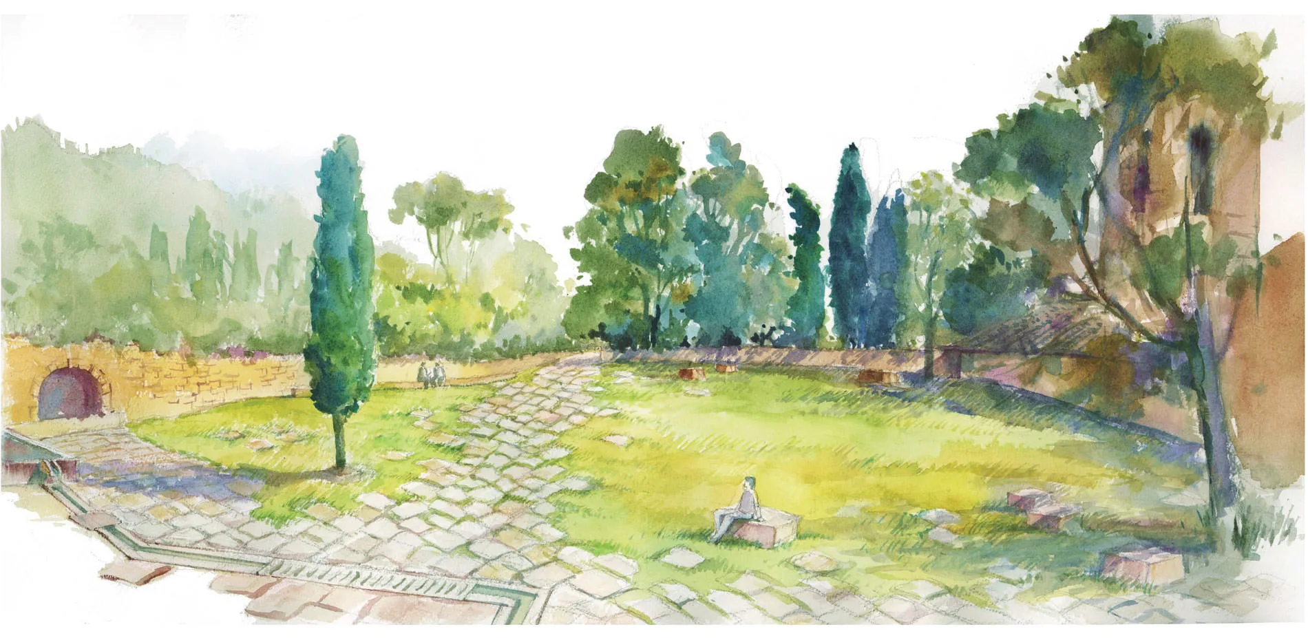 On the park side, the plantations are designed with a variety of strategies. Firstly, the canopies consist of deciduous oak trees and local almond trees, with stone pines placed on the hint points and the existing chestnut trees preserved. Moreover, a row of Morello cherry trees is planted o hold the axis aligned to the gate. Secondly, two systems of hedges are provided with the higher cypress fence to block the street traffics and the lower citrus hedge to guard the sitting areas. On the ground plan, crushed gravel and oak-leave-shaped grass patches are designed to form the park side. The paving composition of herringbone bricks and limestone pavers on the piazza is derived from the texture of the local sandstone.