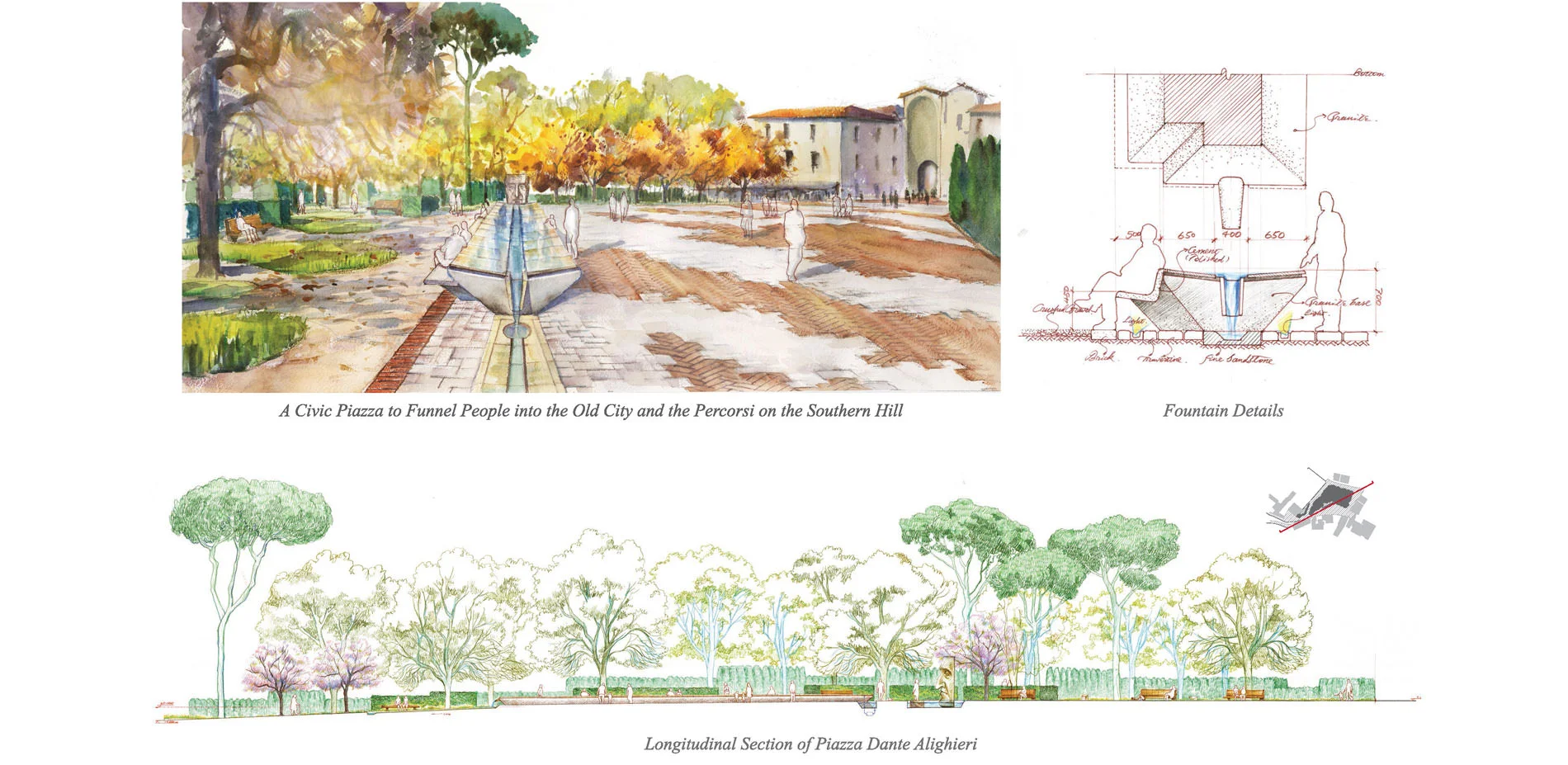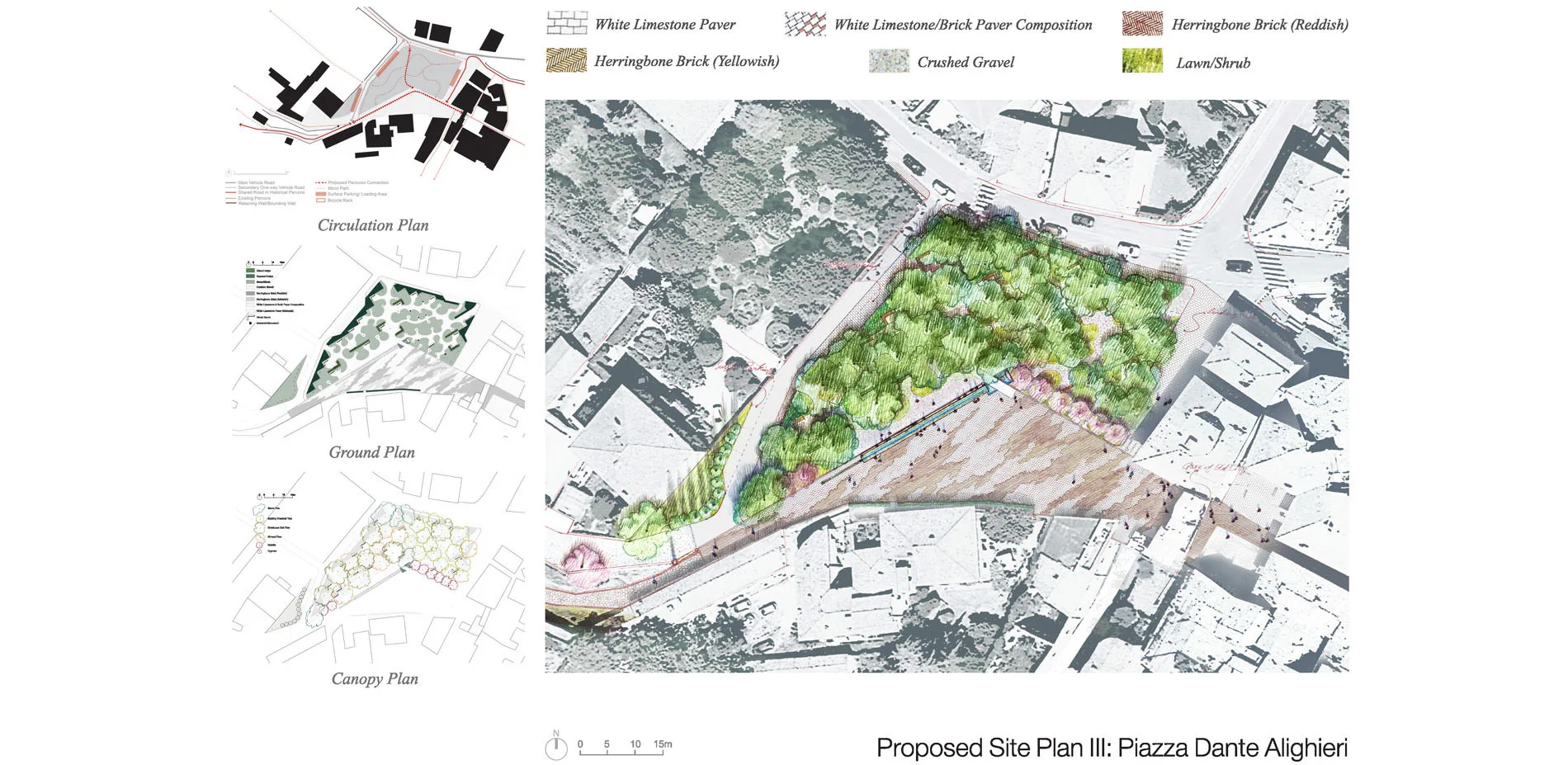The Piazza Dante Alighieri is situated at the threshold of urban hill top, right in front of the main gate of old city of Pienza (Centro di Pienza). With the poorly organized surface parking and unclear signage to other historical sites, the City of Pienza is seeking a civic space to hold annual event and a legible guidance to both the old city and other historical sites on the southern hill. The idea is to employ landscape plantations as urban artifacts (fatti urbani), which are based on the extensions of axis from the old city of Pienza and the direction to the percorsi. This landscape implementation with its canopy mass and a void of civic space sets up a simple and legible connection between the old city and the historical percorsi to funnel people into both directions.