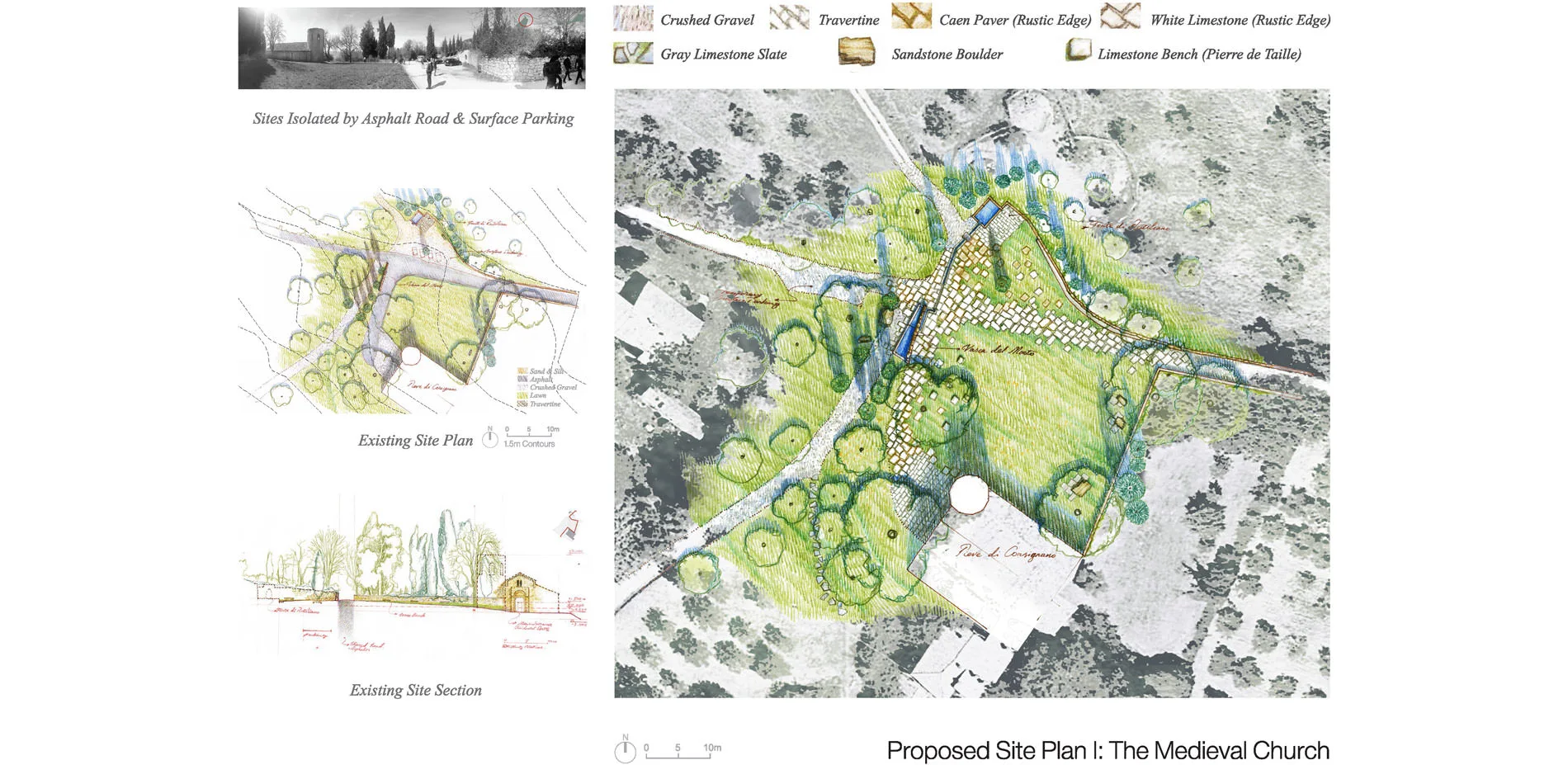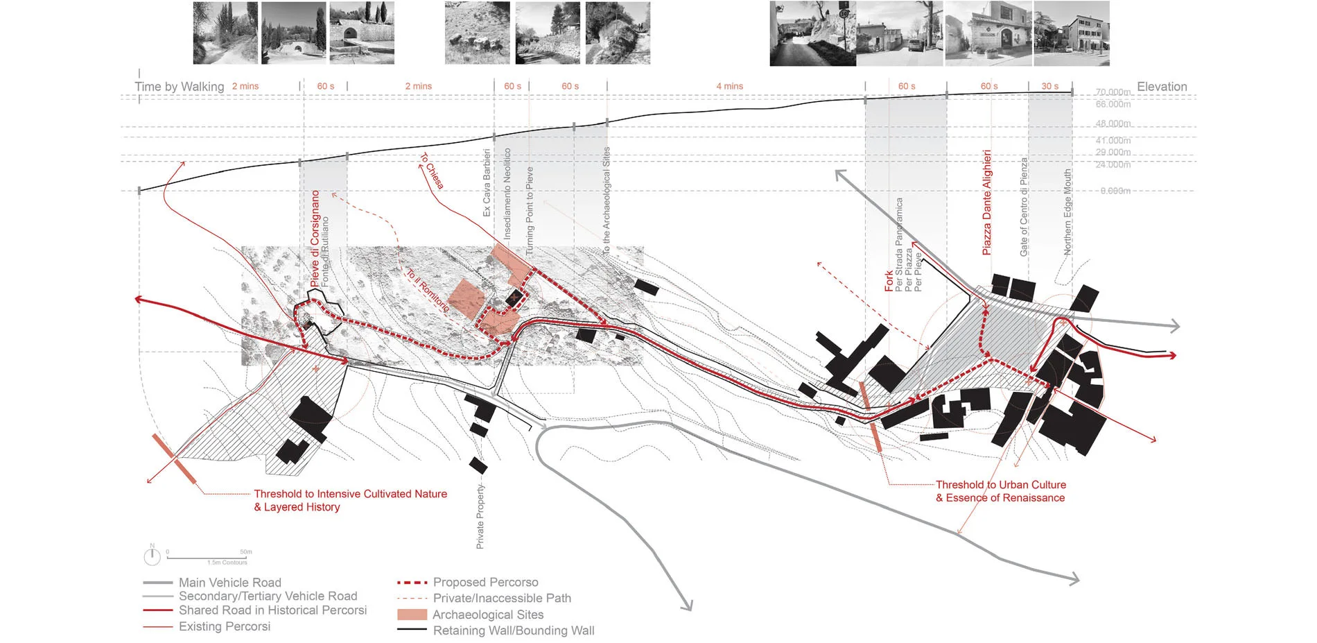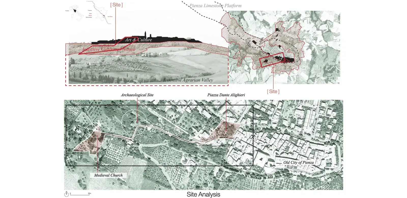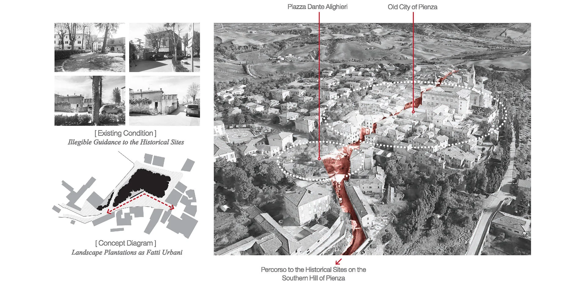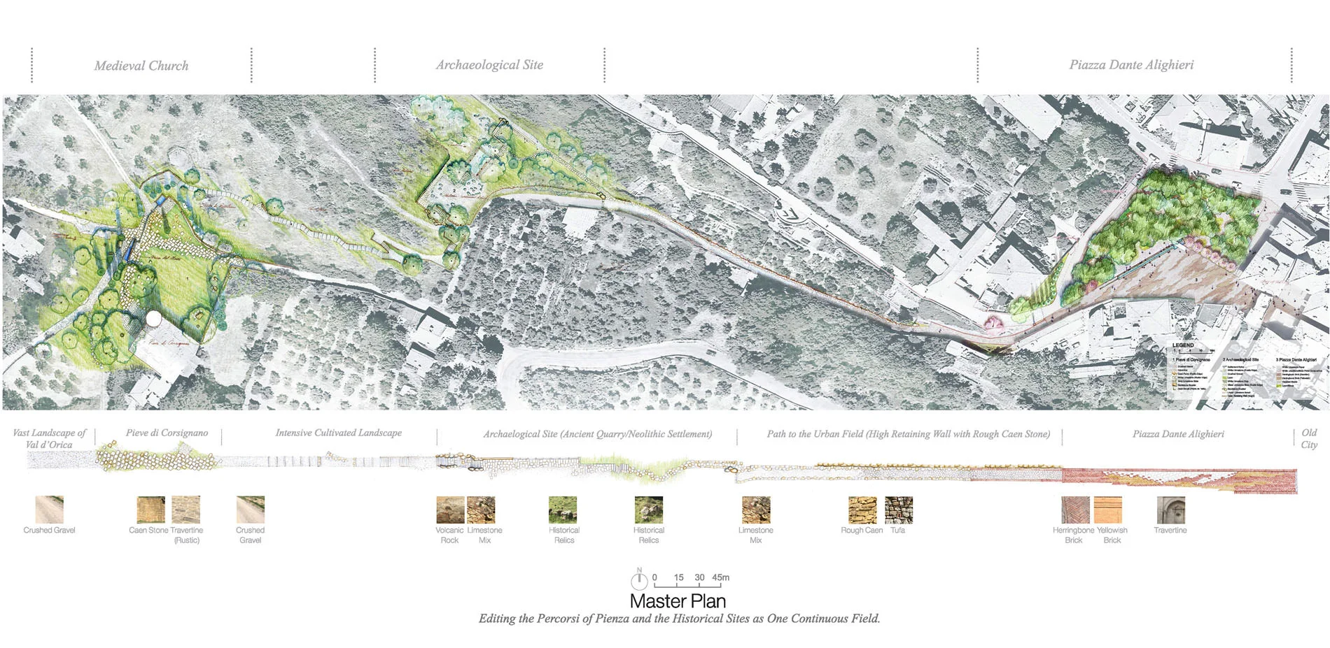Today, as we are operating place identity of small towns with cultural and historical heritages, the biggest challenge is not so much of preserving the old as about conserving the historical values and collective memories in a continuous transition from the past, the present, to the future. This project aims at providing a hermeneutic landscape approach in balancing the historical conservation, local public life and tourism development by editing a part of historical percorsi1 (local trails) of Pienza, which stretch from a medieval church (Pieve di Corsignano), an archaeological quarry site to an urban piazza (Piazza Dante Alighieri) and the old city (Centro di Pienza).