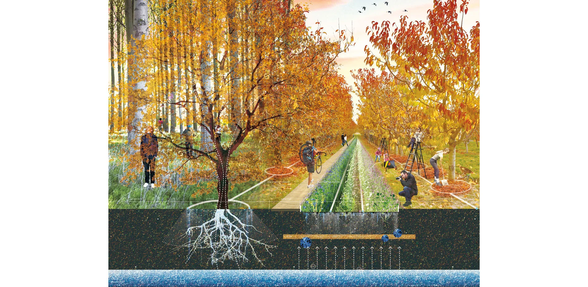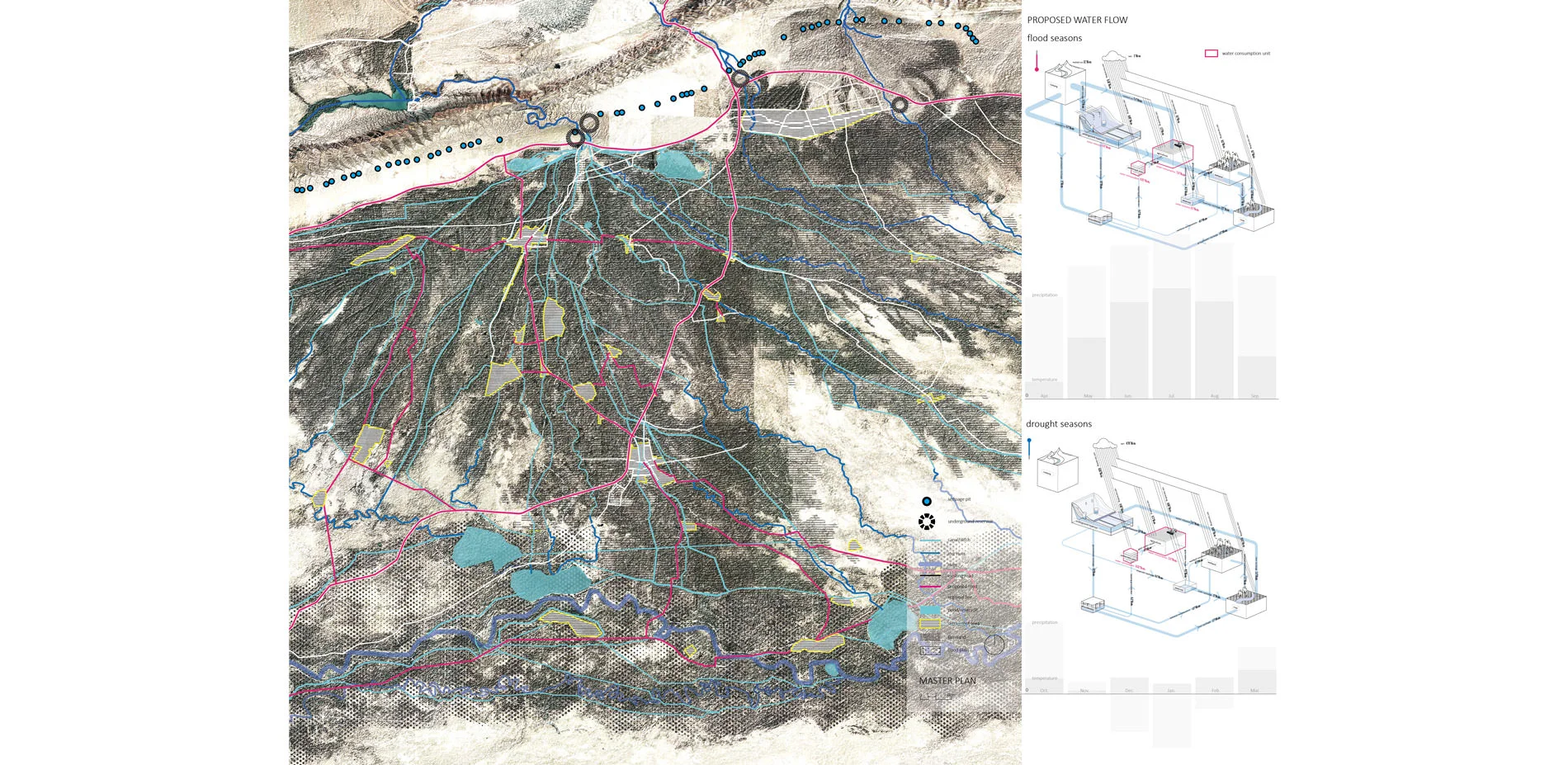 For the planning strategies, the 1st one is to build a store-release system. A series of underground reservoirs will be built along the seepage zones near the mountain. Working with reservoirs along the river, they’ll store extra water in flood seasons to recharge the riparian ecosystems and irrigate farmland in drought seasons. The 2nd one is to build a water-saving system. Grey water reuse strategies will be applied in settlement areas, and water-saving and high productive agriculture will be applied in large farmland matrix to save water and promote economy. The planning makes possibilities to connect the tributary to the river again.