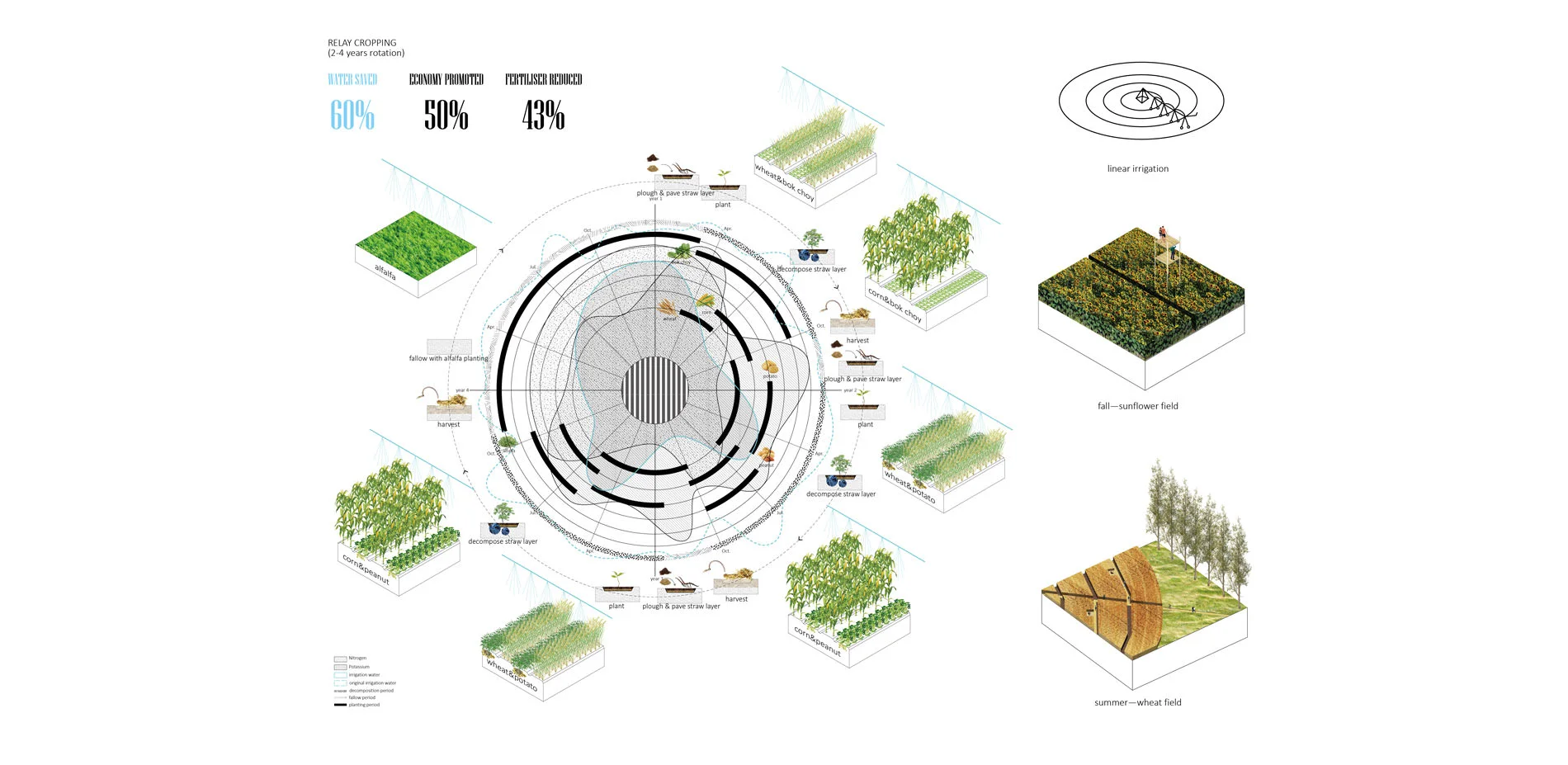 One of relay cropping designed on the site is wheat, corn, peanut, potato and bok choy intercropped in a 4-year crop rotation. The straw layer is paved and then decomposed on the field in the rotation. In the 4th year the farm will be in fallow period with alfalfa. And the Potassium and Nitrogen nutrition levels will also change with the help of peanuts and potatoes. Linear irrigation is applied here. There’re various programs for residents as well. This planting pattern helps to save about 60% of water, economy can be promoted 50% and fertilizers can be reduced 43%.