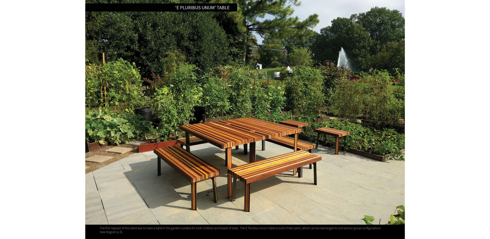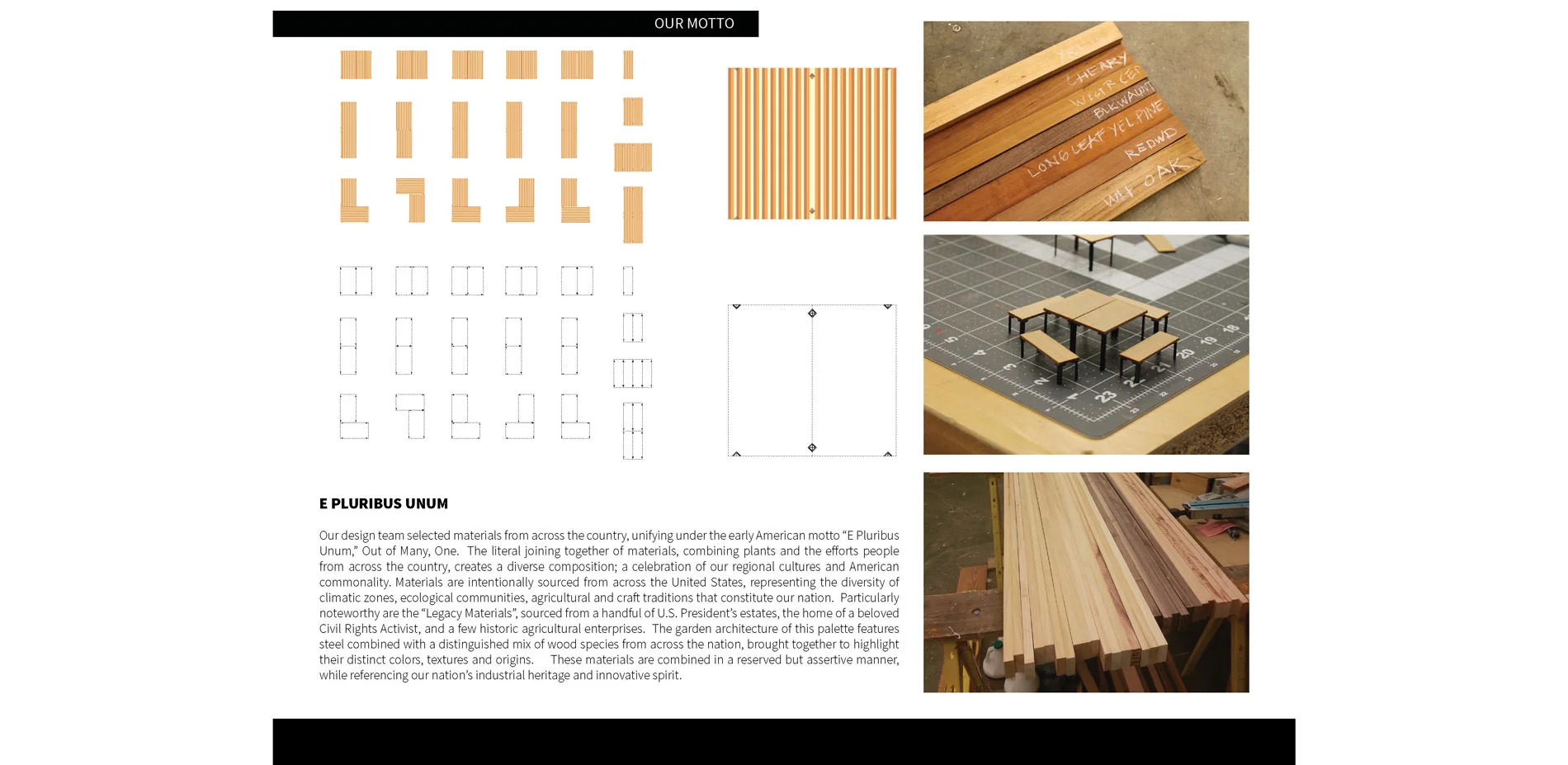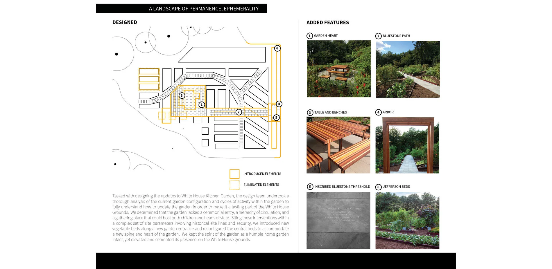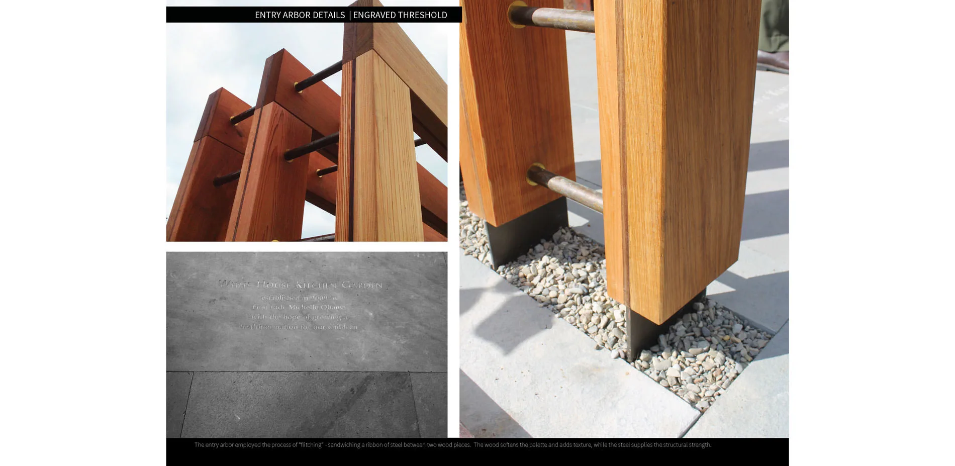 The motto of our project, ‘E Pluribus Unum,’ or ‘Out of Many, One,’ guided the design process. Materials, plants, and the efforts of many people from across the country are assembled within the garden as a diverse composition: a celebration of American uniqueness and commonality. We sourced materials from across the country, representing the diversity of climatic zones, ecological communities, and agricultural traditions that constitute the nation. We combined those materials to highlight their textures, colors and origins. The material richness and aesthetic simplicity of the designs highlight the updated White House Kitchen Garden.