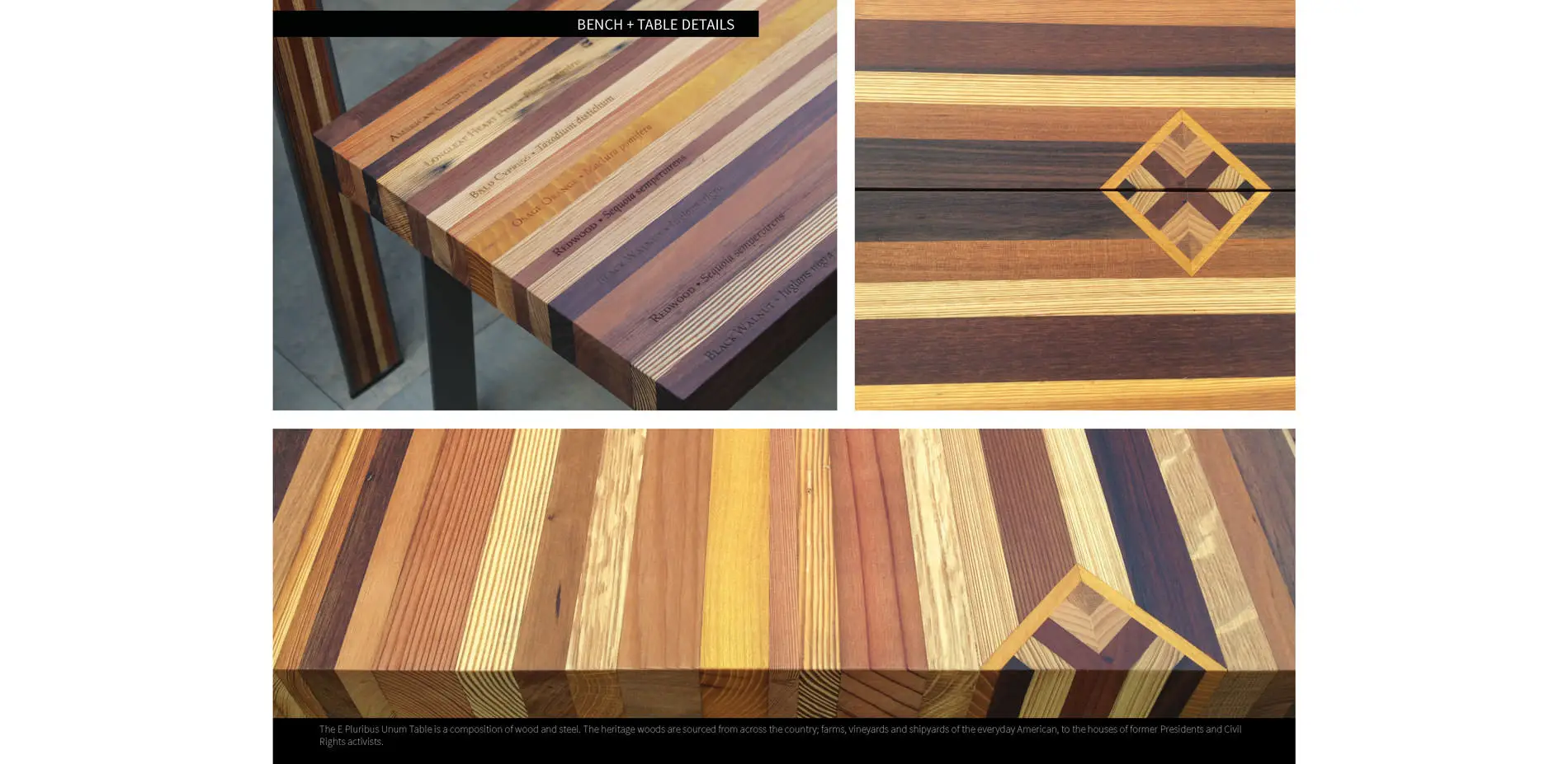 The garden architecture of this palette features a distinguished mix of wood species from across the nation, brought together to highlight their distinct colors, textures and origins, while referencing our nation’s industrial heritage and innovative spirit. Each material tells a different story about the history of social influence and labor in early America, from Virginia to California and New York to Georgia, tying together many narratives into a cohesive design. Agriculture was once integrated into urban communities and academic institutions. For instance, Thomas Jefferson’s Academical Village was not only a construction of marble steps, brick and slate but also included adjacent farmland that revealed a very different narrative about those who inhabited early Charlottesville. Washington D.C. also once an agricultural center is now a landscape of monuments built of marble and precious stones. This material palette exploration includes the use slate shingles from Pavilions that are as old as the University, and also reclaimed oak beams harvested from a local barn. An old growth pine from Dr. Martin Luther King Jr’s home in Georgia is used in the table, as well as Black Walnut from James Madison’s home, and pine from James Monroe’s home in Highland, Virginia.