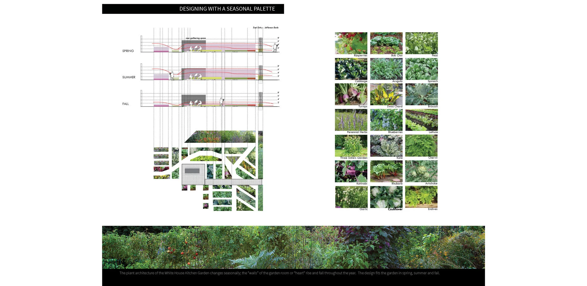 Because food gardens are seasonal, the plant architecture of the White House Kitchen Garden changes throughout the year. The design considers the garden parameters in the spring, summer, fall, and winter.