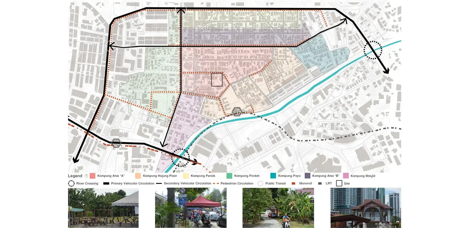 Through an analysis of the current and historic issues, along with the aspirations of the city through various master plans and schemes, the projects posits a new form of micro-infrastructures that would encourage community participation and counter the towering developments that are constricting Kampung Baru. Lacking a public space, this project aims to address the need of public space by utilizing the vacant lots and green spaces with each village of the community. These public spaces could host the meetings of each village and allow for an intimate neighborhood-scale space where residents could rest during the day, gather at night, and adapt to the everyday needs of the users. Each village would have an opportunity to make their potential public spaces into bespoke and unique anchors of the community. These spaces would help to capitalize on the distinct cultural identities of the people, their houses, and the the surrounding landscape.