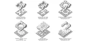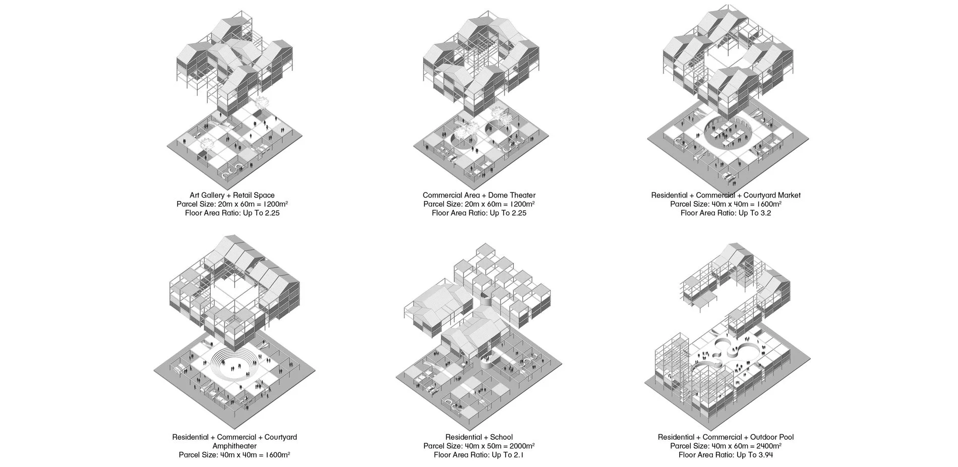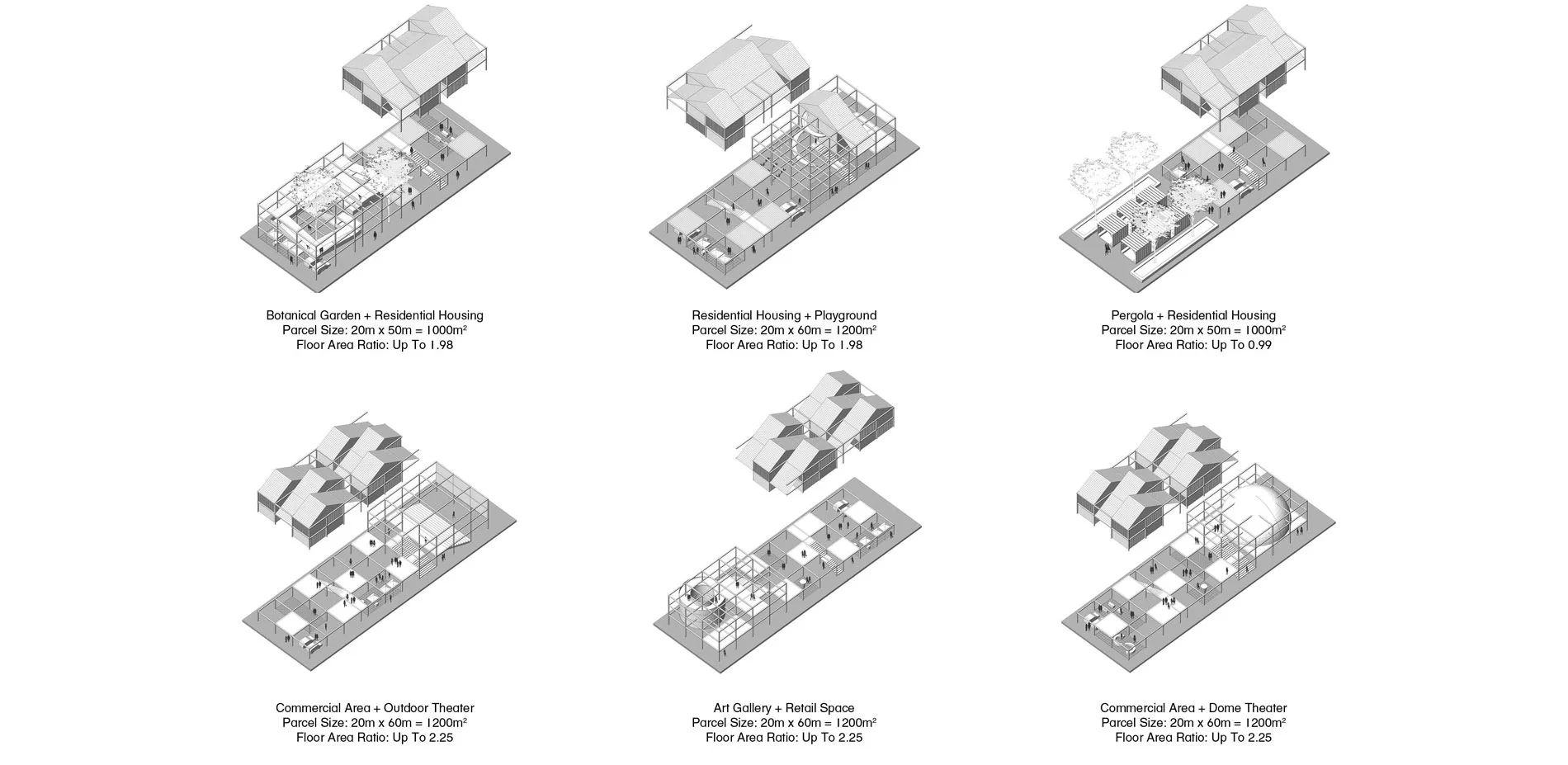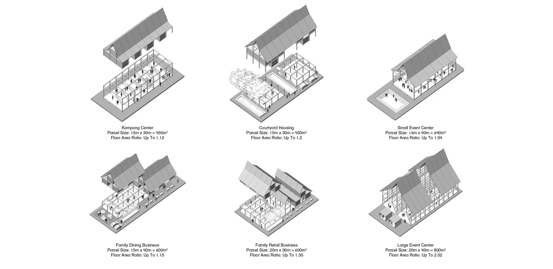 From those public spaces, the project has developed a language of development typologies that could be implemented on the parcel scale. These typologies are ordered into three main categories: small, medium, and large parcels. We posit that the landowners could implement these different typologies that are an increase from the 1-2 floor existing buildings to something from 3-7 floors. Both typologies are set on grids of 5 x 5 x 3 meters, allowing for flexibility and modularity over time. Wall units, balconies, and more are all modular as well, allowing for the landowners to work with in the given parameters, but maintain a uniqueness that is so critical to Kampung Baru’s identity. Over time, the parcels could also be connected to one another through sky bridges, creating another layer of pedestrian circulation to the lots. Maintaining the same zoning throughout Kampung Baru as well would also ensure the variety of experiences that is already found in the community as well.