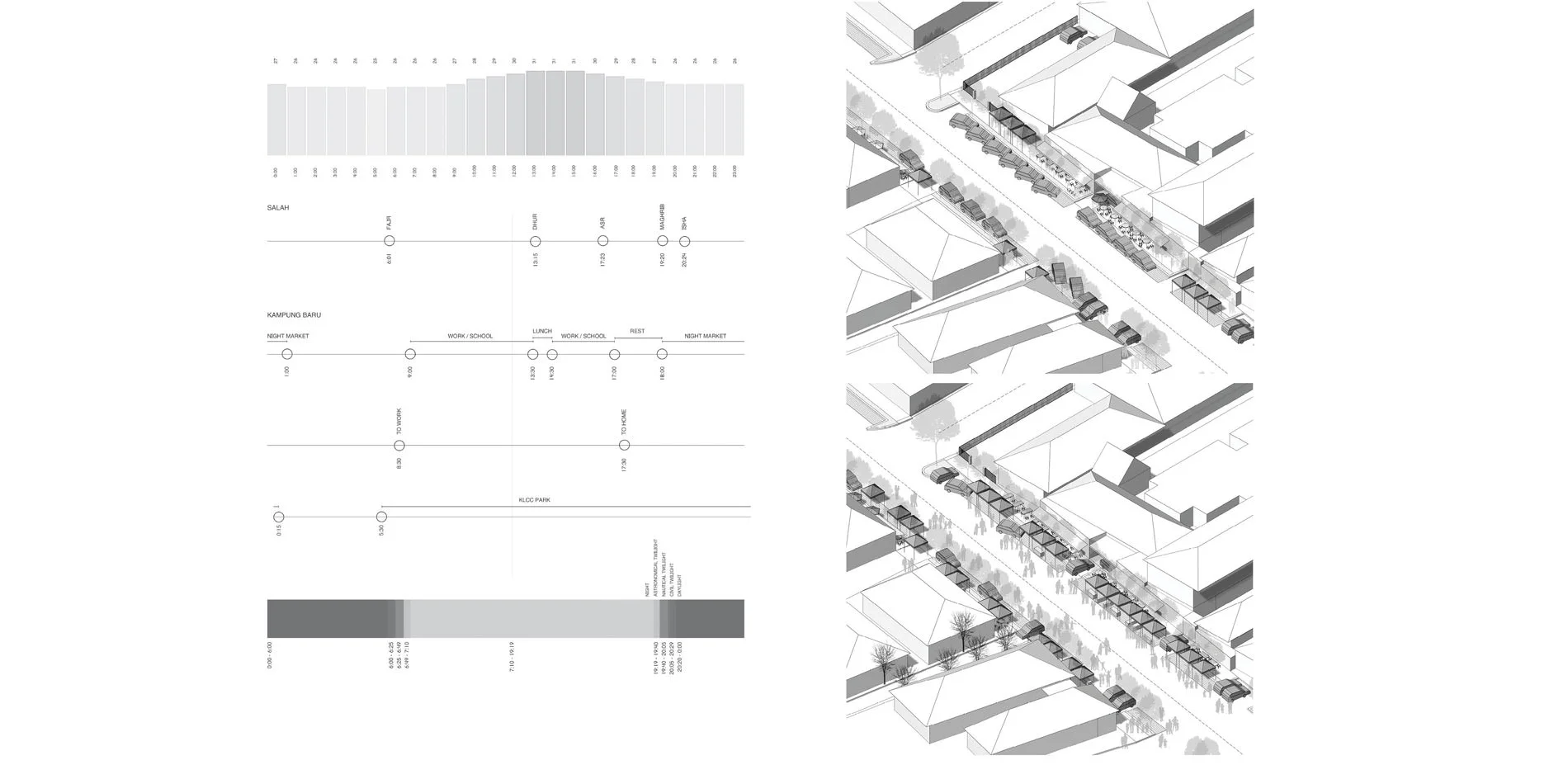 However, one of the main cultural cornerstones of Kampung Baru, the night markets, remain key aspects of daily life in the community and the city. The night markets are a variety of food, clothing, and other goods stalls that overtake the city streets. Opening past 8 pm and closing around 1 am, the night markets occur at the darkest and coolest part of the day, and after the daily prayers have ended. It is within this darkness, illuminated by the lights of the city, that Kampung Baru comes alive. The nocturnal is not a temporal feature, but a spatial and socio-cultural force. Amidst the tropical heat and humidity, the role of the night is integral into how the community and city operates.