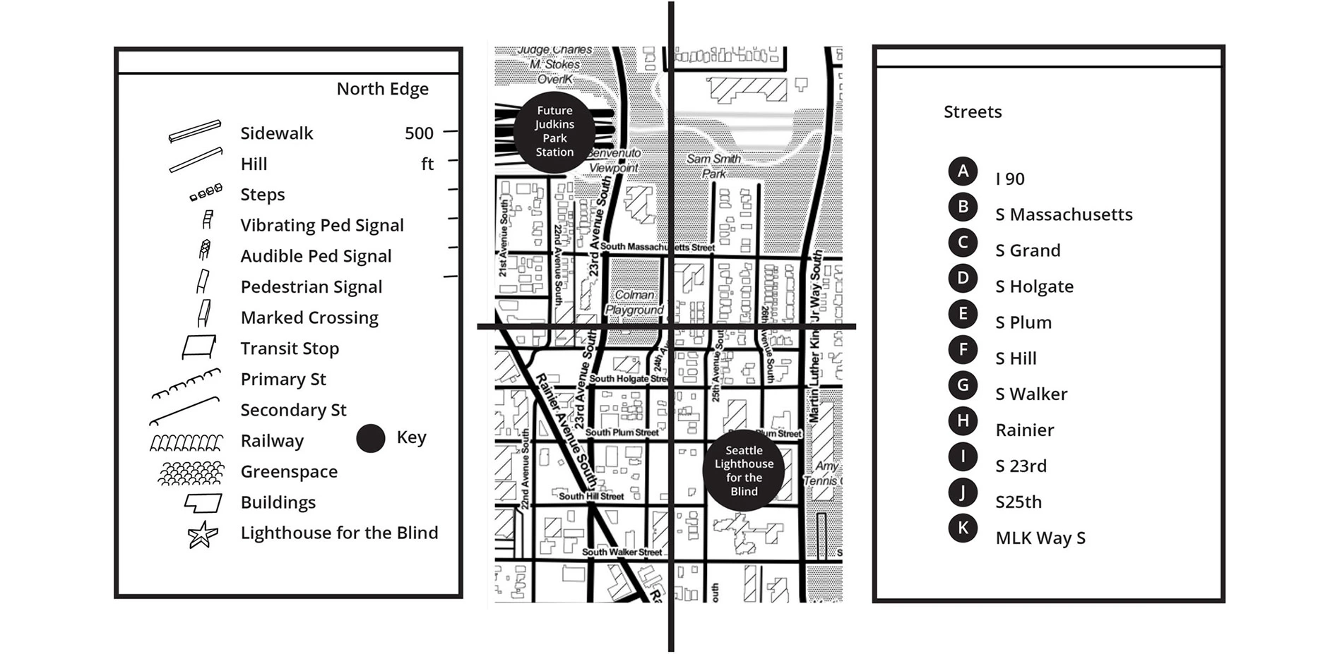 Illustrative documentation of both the process and analysis that went into making these maps is directed more squarely at the design community. This project re-examines the pedestrian environment, with a focus on the specific needs of the low vision and blind communities. The goal of this work is to persuade designers to consider a broader spectrum of experience, and engage more critically in what it means to be designing inclusive cities.