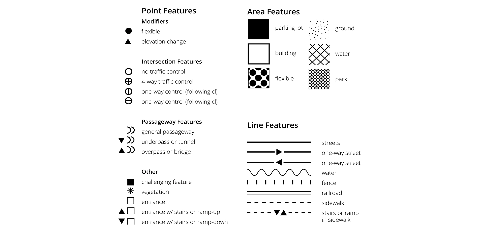 This work was directed towards establishing critical pedestrian information that should be included in a base map, and designing a set of associated atomic symbols for that critical information. In order to facilitate the end goal, this project focused on employing open source, crowd contributed, geospatial data from OpenStreetMap.