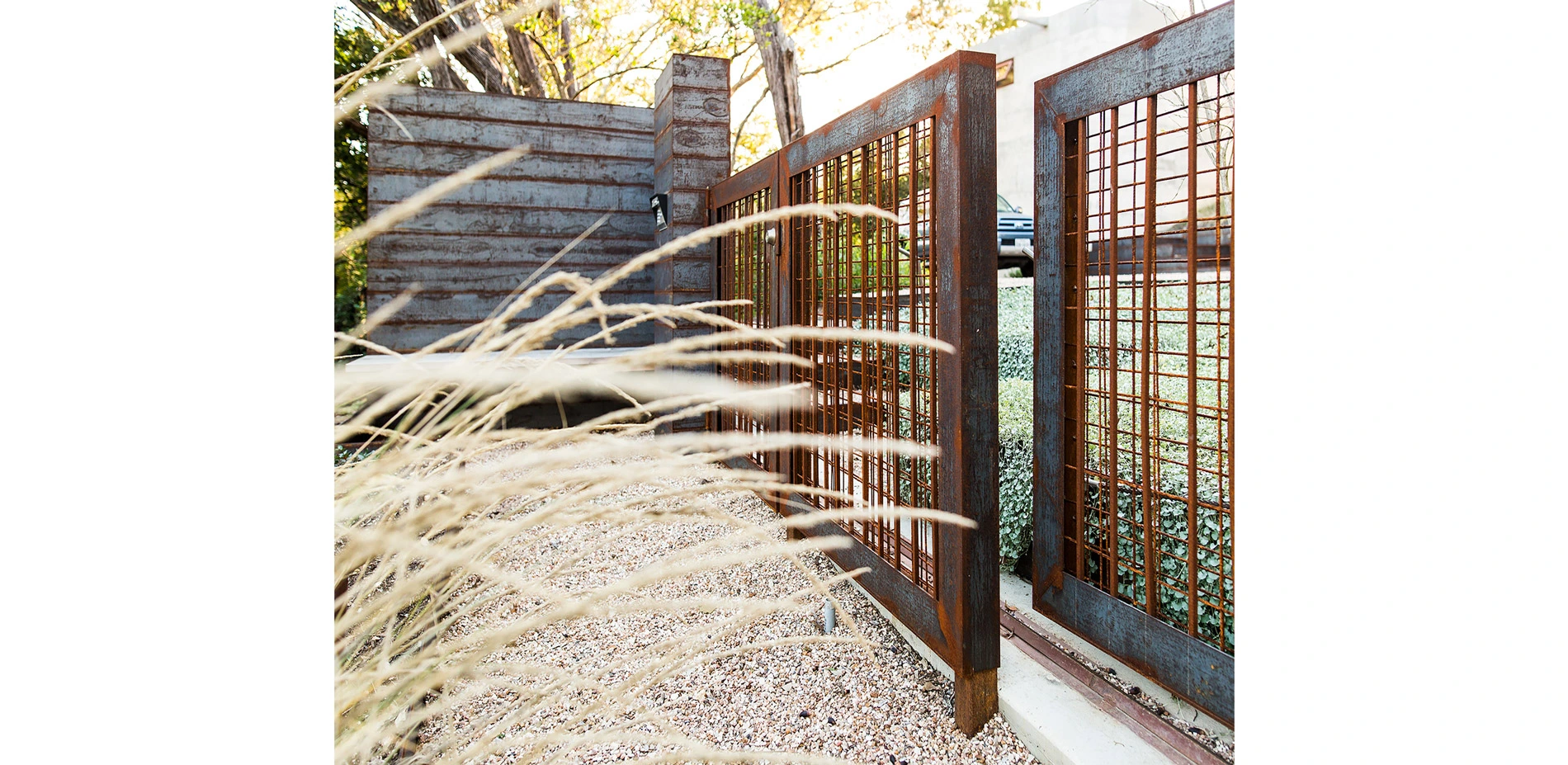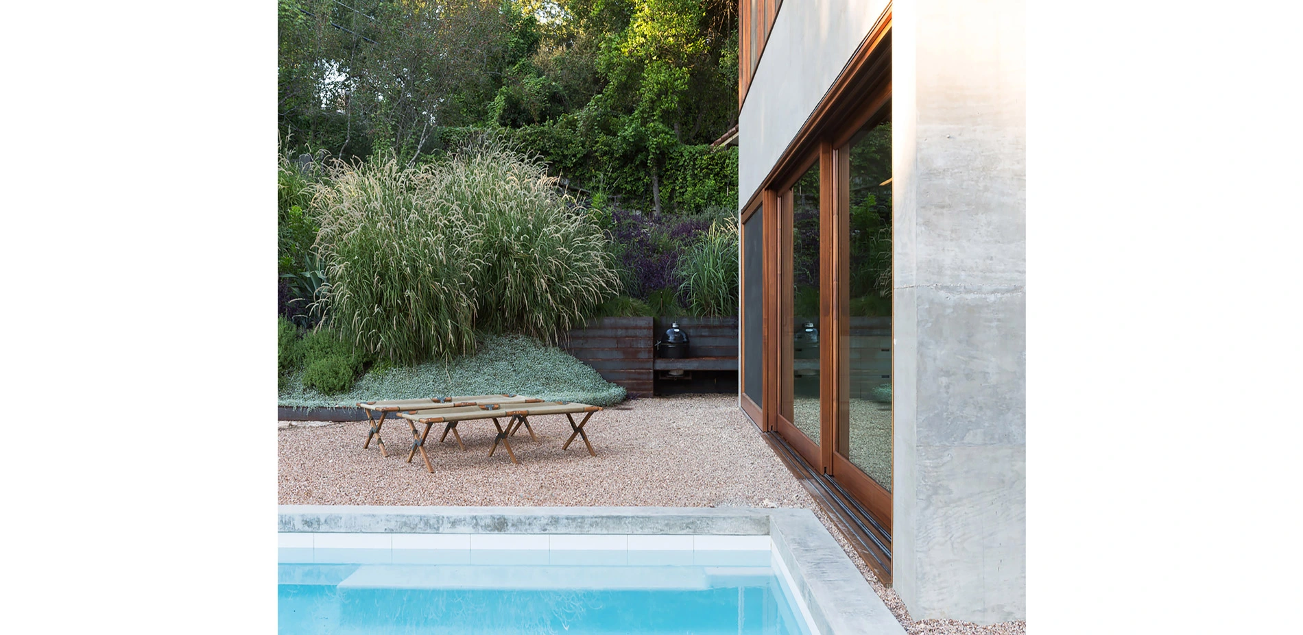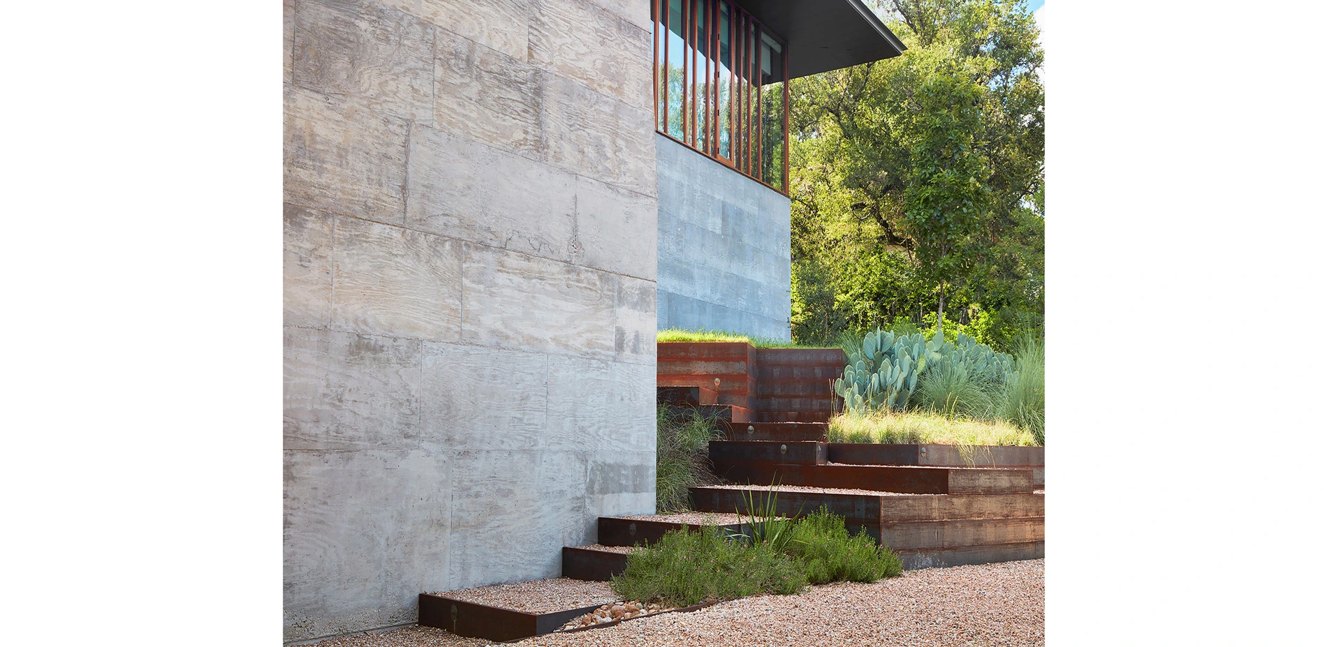 Materials for the site were carefully chosen for their subtlety to blend seamlessly with the architecture and surrounding landscape. Steel, gravel, board-form concrete, and a host of unique native grasses and succulents bring a tactile texture. In particular, the design team worked with one grower to cultivate a new Pennisetum hybrid called, "Kick Ass Grass". Its tall, billowy foliage gave the hillside a delicate and sumptuous movement from the ever-present gentle breezes. These plants capture the light and maximize the drama in the landscape that had been lost.