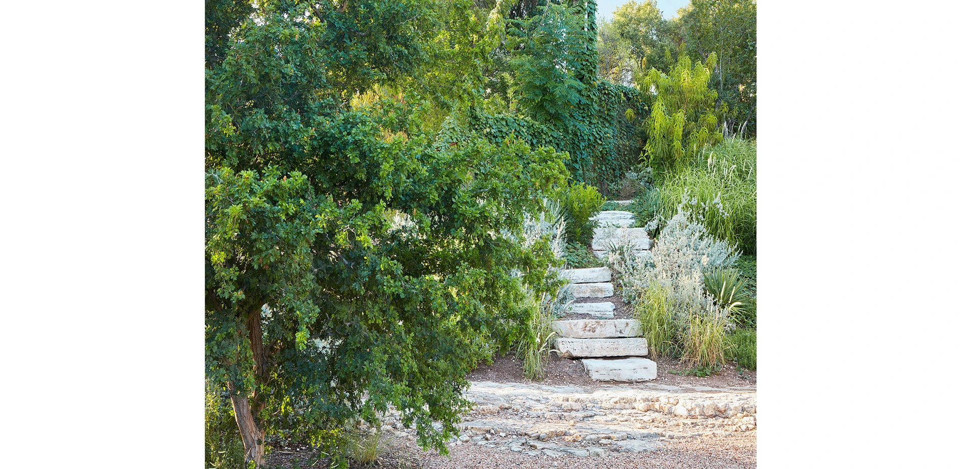 Mitigation and excavation of invasive ligustrum, morning glory, and jasmine with air spading revealed sinuous limestone strata. These newly-exposed edges were incorporated into the plan and underscore the site's sensitive redevelopment.