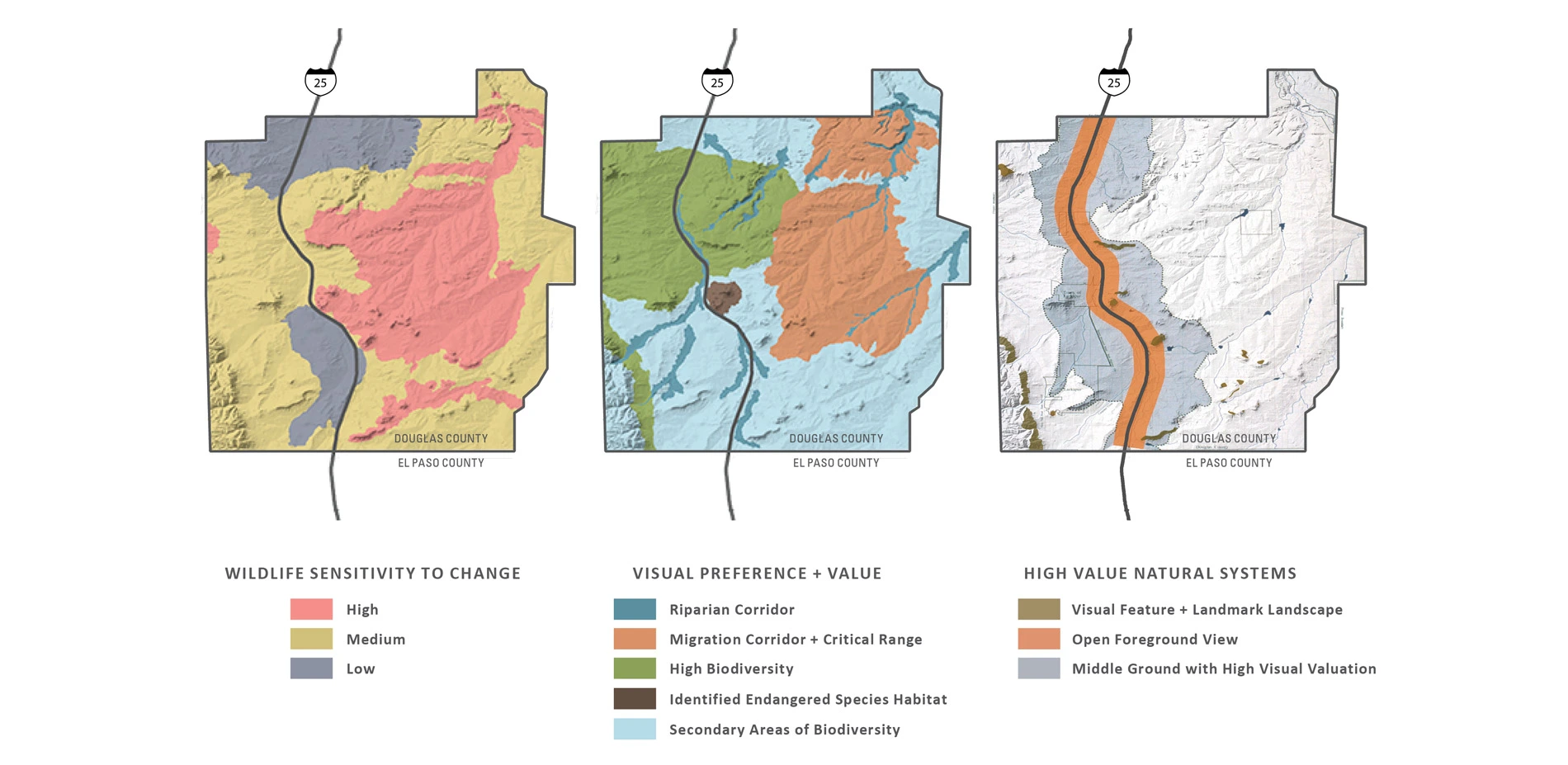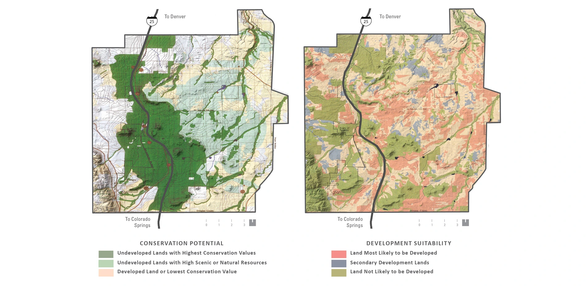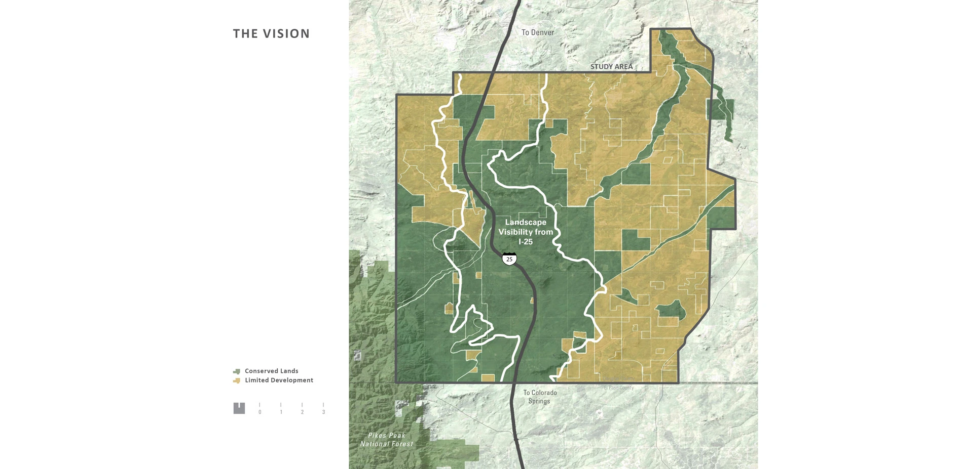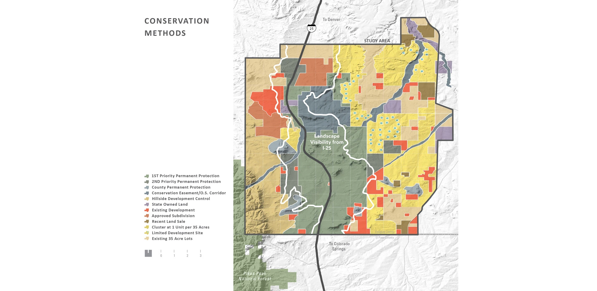 Prompted into action by record and uncontrolledgrowth along the I-25 Corridor, environmental groups, land trusts, local communities, Douglas County, and state agencies formed an unusual coalition to create a regional conservation vision. A multi-disciplinary planning team, under the leadership of the landscape architect, worked with limited resources to create a unique set of analysis tools to identify areas of significant natural and scenic resources most vulnerable to development. Critical attributes of the landscape were analyzed, including scenic view corridors, topography, land cover, natural hazards, land value, zoning, land ownership, view characteristics, wildlife habitat and migrations, ground water availability, recreational trends, heritage sites and the status of development commitments. Once these attributes were analyzed and the significant resources understood, the team developed an initial vision for the permanent preservation of an area of significant open space marking a large-scale transition from prairie to peak between the expanding cities of Denver and Colorado Springs.