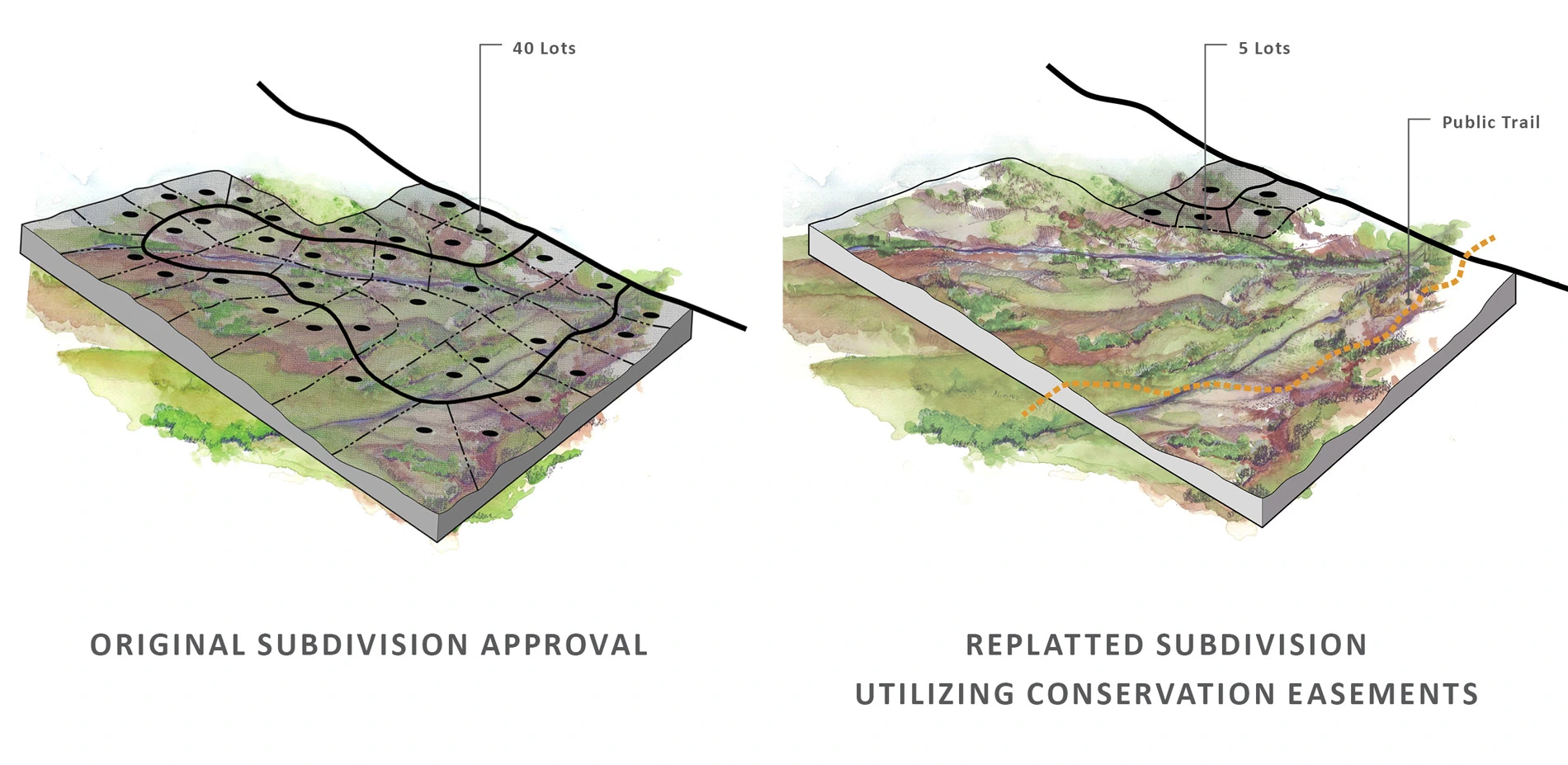 The complexities inherent in land transactions increased as the planning team transitioned from "vision planning" to implementation. In a final push to complete the vision, The Conservation Fund intervened to secure a 1,300-acre property that provided the best public view of Pikes Peak along the corridor. The urgency of the conservation effort was highlighted by the fact that roads and infrastructure construction for 40 houses was already underway. Using napkin sketches created by the landscape architect illustrating sensitively clustered residential lots, the developer was convinced to replat the property, effectively removing all residential lots from public view. This eleventh hour change ultimately proved the extraordinary conservation success of the Corridor Master Plan.