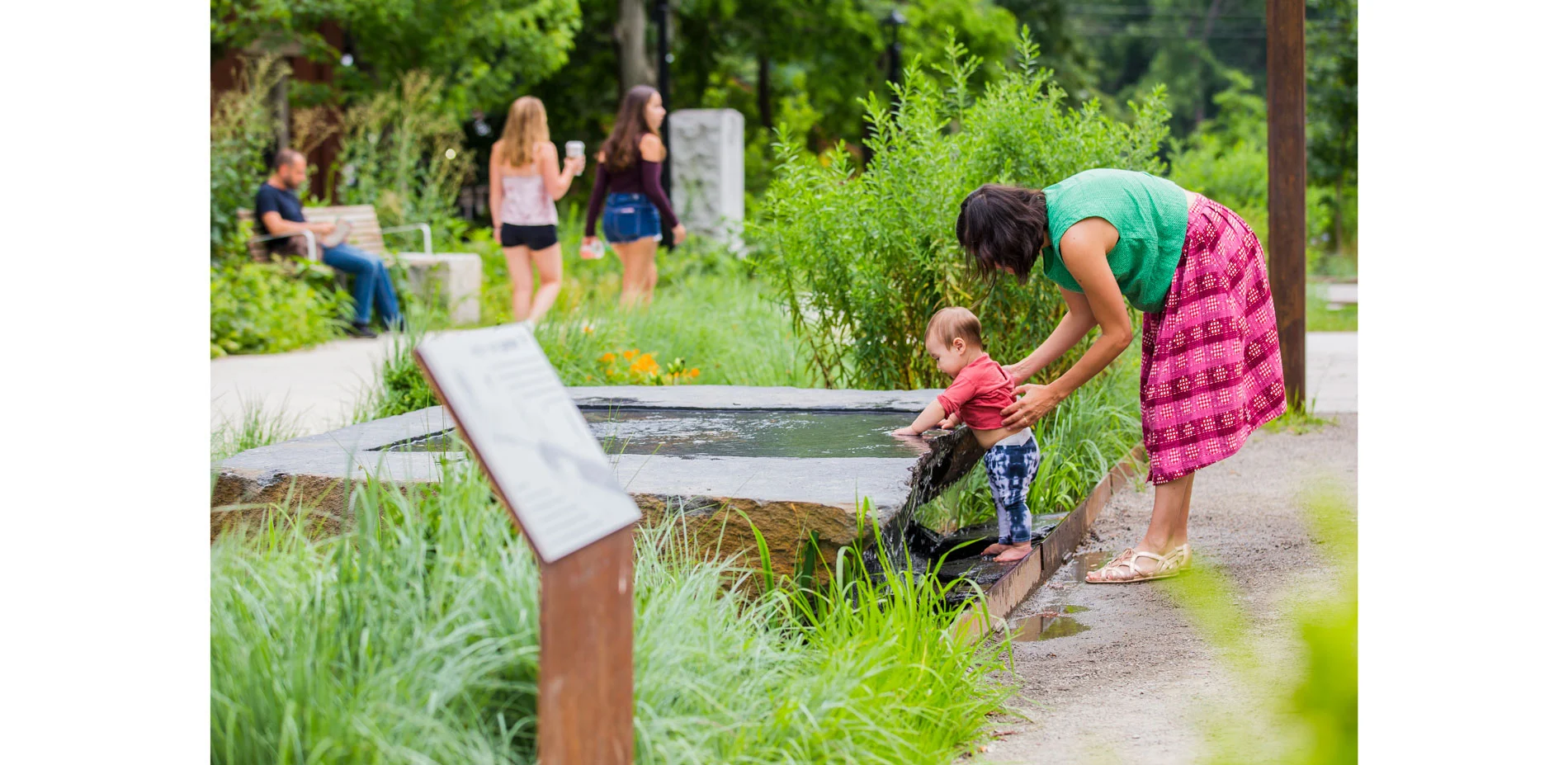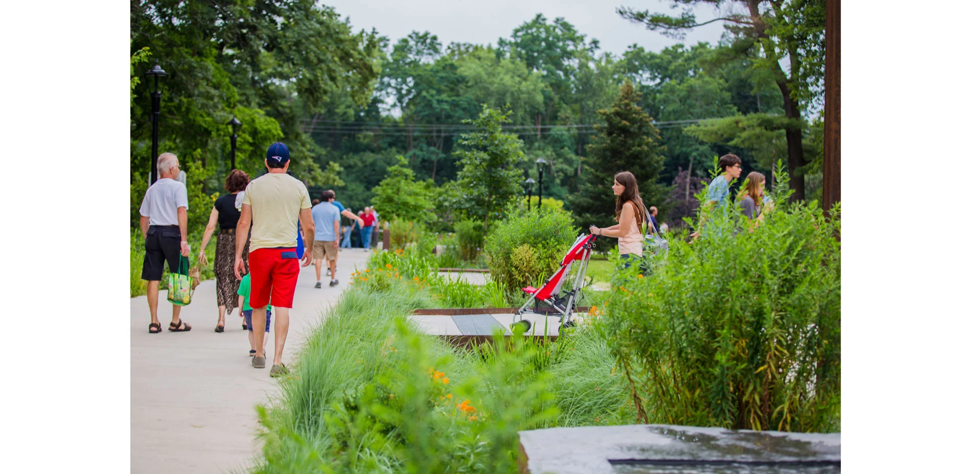 As the only substantial open green space in the heart of the City, an expansive south-facing lawn acts as a village green, providing a flexible, central open space for informal gathering, play and cultural events. At the west edge, a stage bridges over the stormwater garden and extends into the woodland garden for seasonal events. A new iconic holiday tree was sited at the southern edge with ample gathering space around it for festivities.