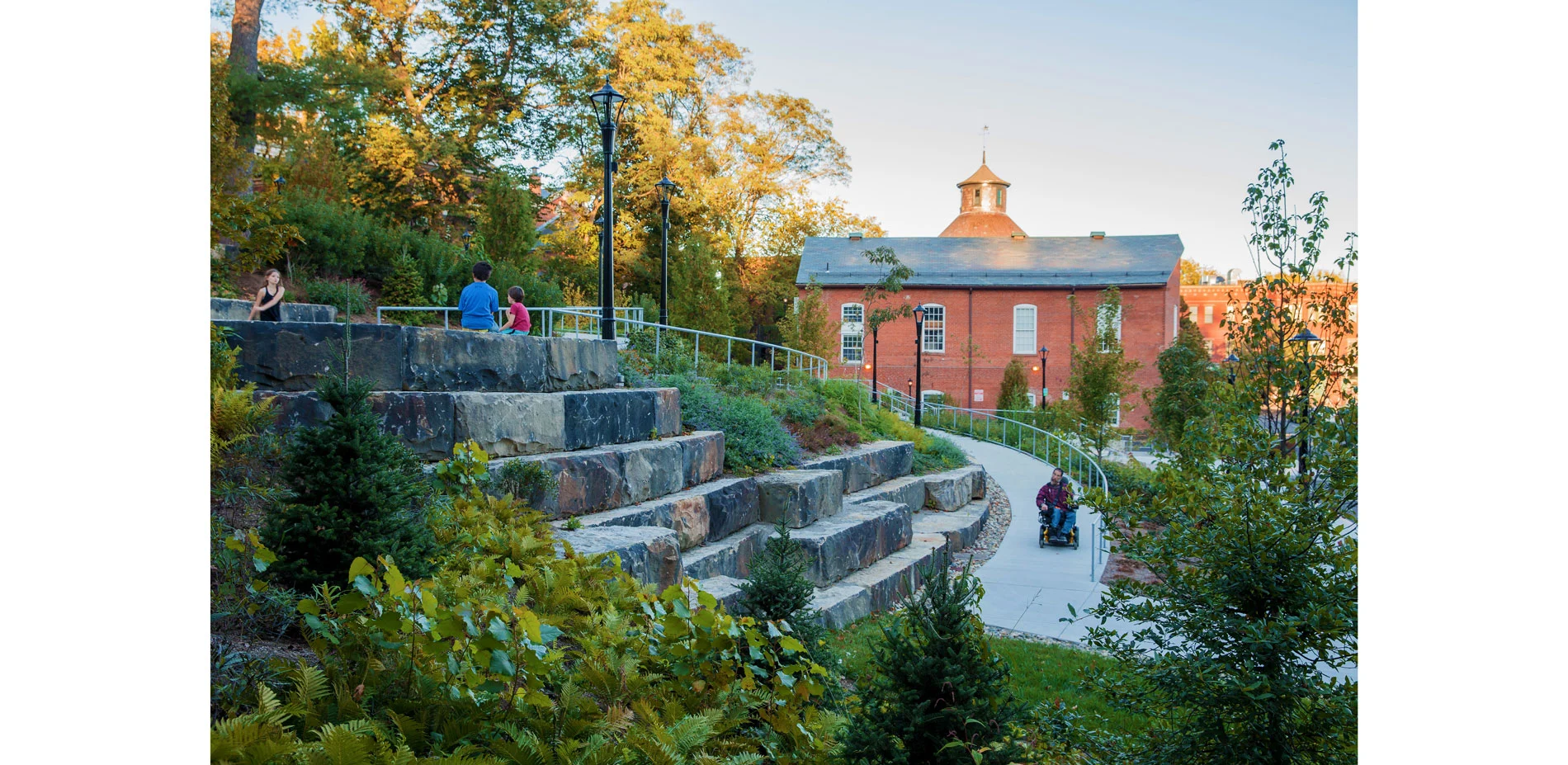 Over thirty feet of grade change occurs on the previously overgrown south slope of the Park. The design reclaims this landscape, extending the Park into the parking lot below, allowing for an occupiable hillside. A series of accessible walkways, a stairway and gathering spaces for amphitheater-style events now offers historic views to the Holyoke Range, and the slope is restored with indigenous river plants. The main thoroughfare re-connects the Park, and downtown, directly to the Norwottuck Rail Trail and the Mill River Ghost Walk.