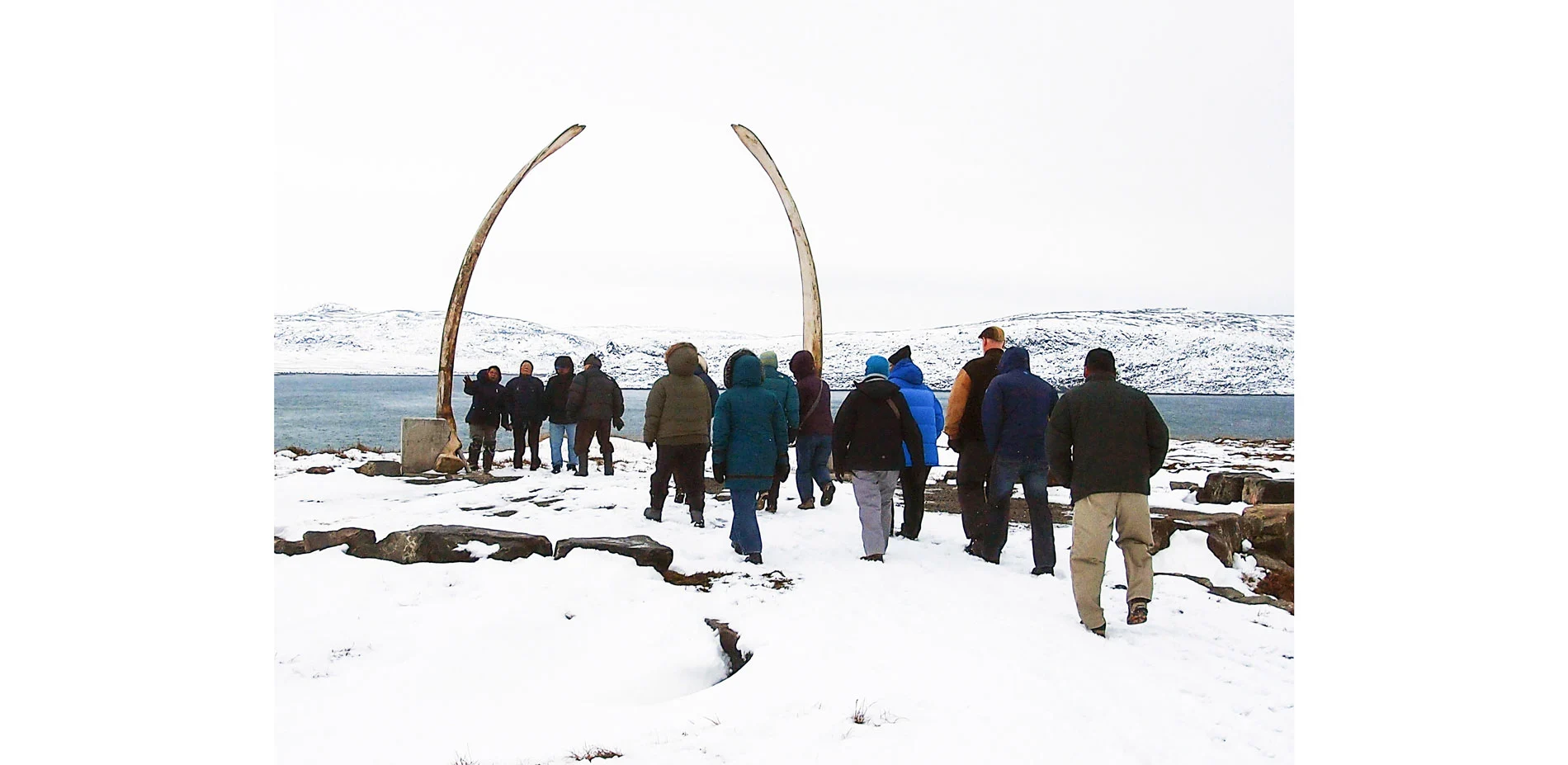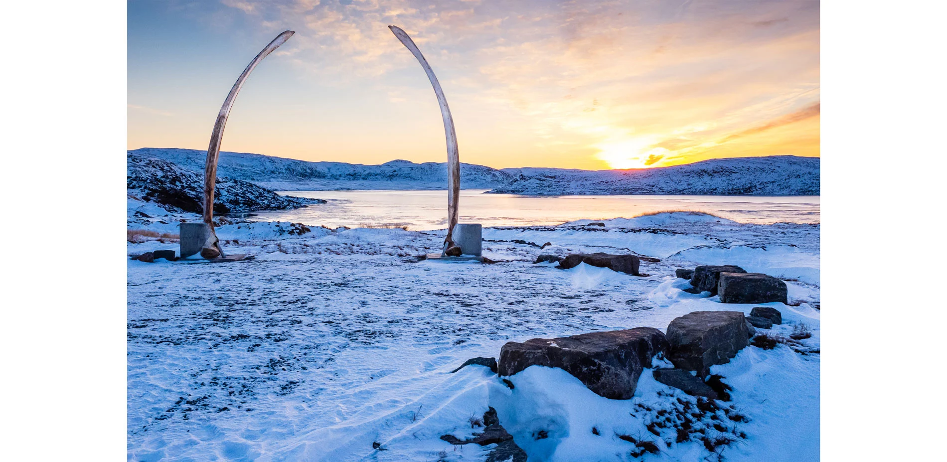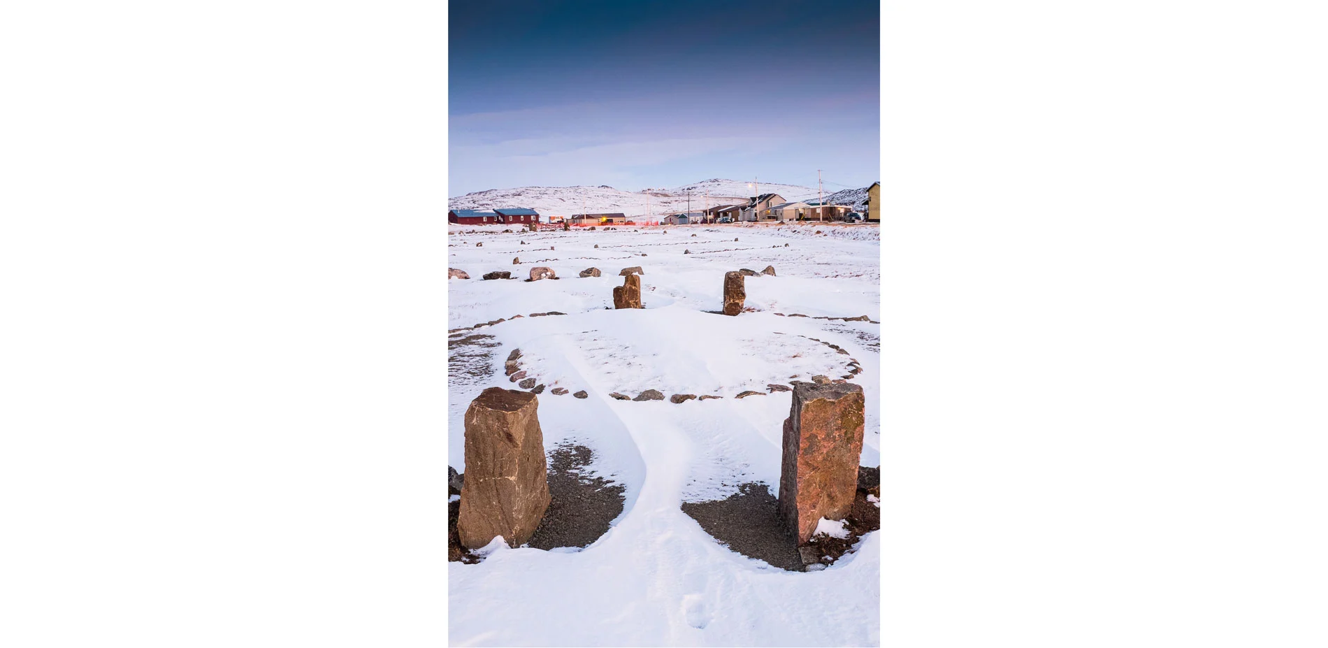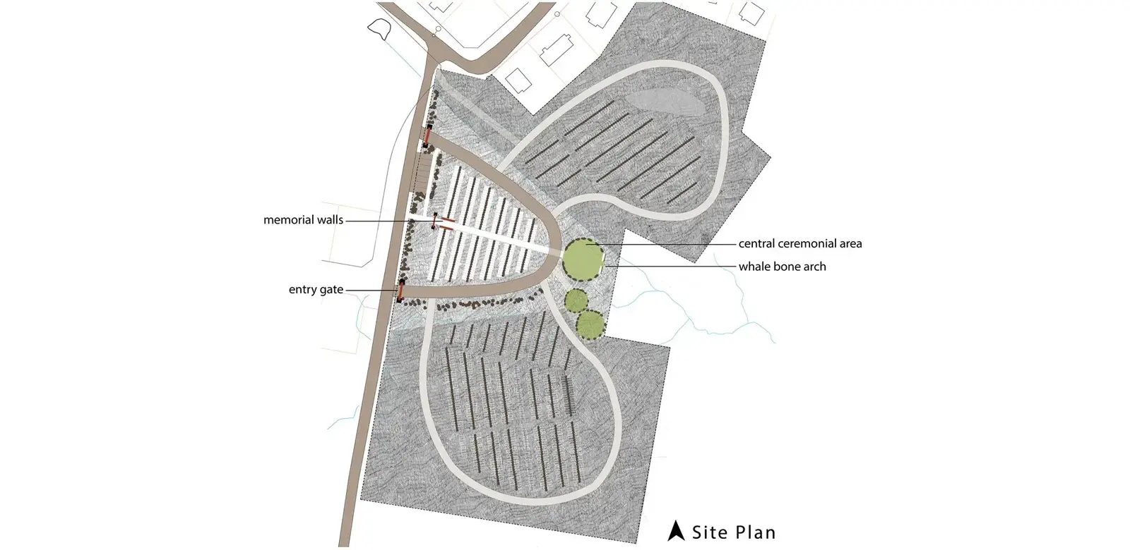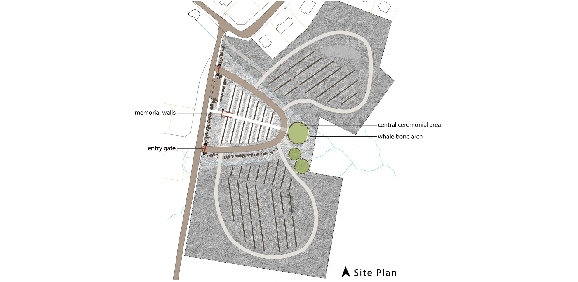 The design draws on local and traditional knowledge with a focus on locally-sourced, culturally meaningful materials and simple forms to honour indigenous traditions. Weathered boulders create a strong geometry of pathways, visible even under snow. Designed to be accessed on foot, the site's central pathway takes visitors to the ceremonial gathering space, which terminates at an archway of upstanding bowhead whale jaw bones. From the central area, the monumental bones anchor and frame the view towards the sea, symbolizing a connection to the afterlife, and honouring the community's hunters.