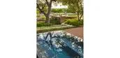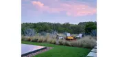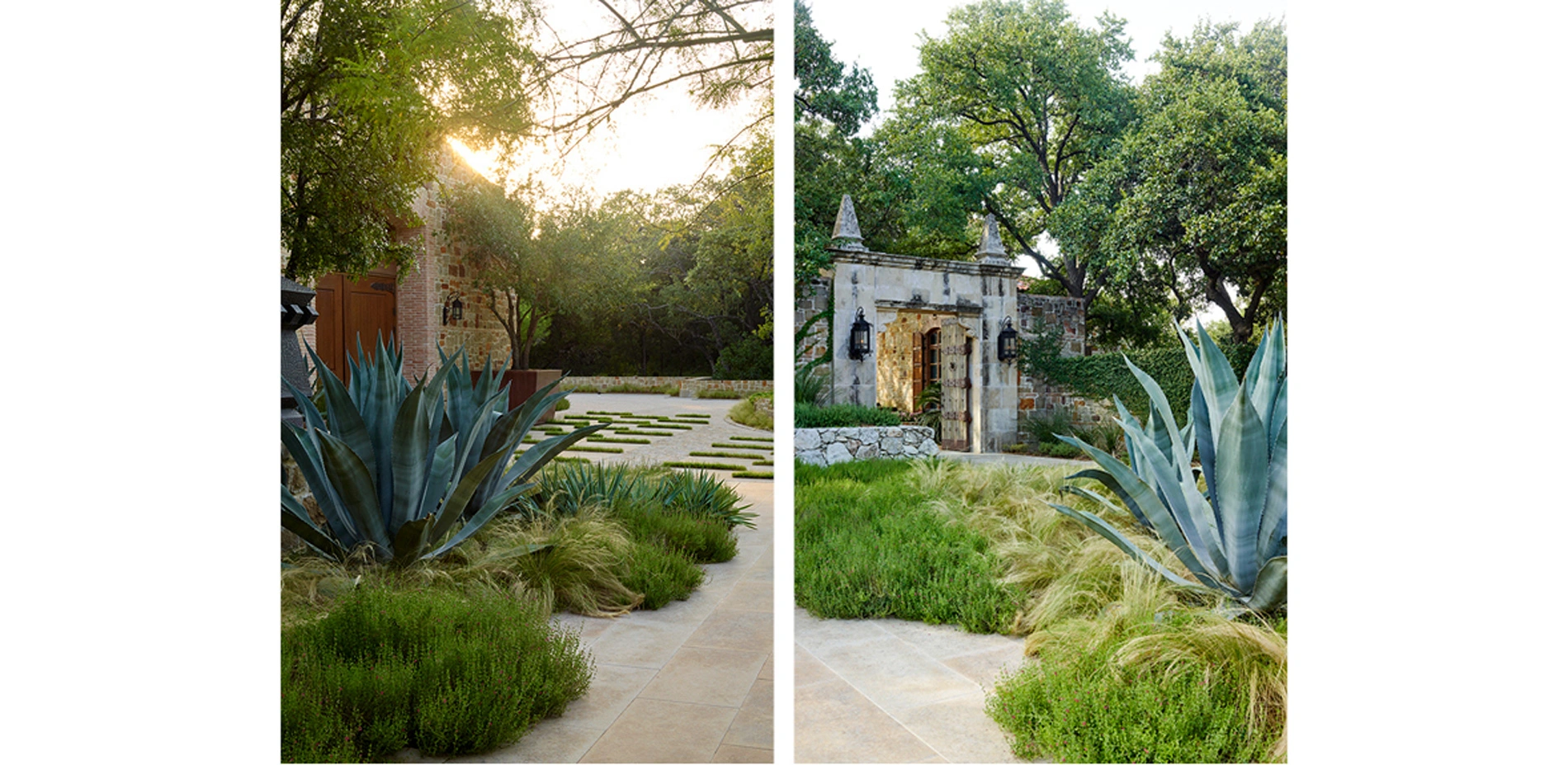 Native stone paving, lawn, and reflective surfaces define the horizontal, while trees and their canopies punctuate living spaces strategically to provide shaded respites. Landscapes intentionally amplify textural contrast of grasses and succulents, while also screening and camouflaging needed fencing and enclosures for security and safety. Equipment rooms at lower levels were designed with green roofs to minimize the visual impact of adjacent roofs near the pool. The canopy walk from the garage to the outdoor rooms and rear gardens provide differing views into trees, while providing easy access from front to rear of the residence, as there is a 6 ft. elevation differential from the arrival court to the pool.