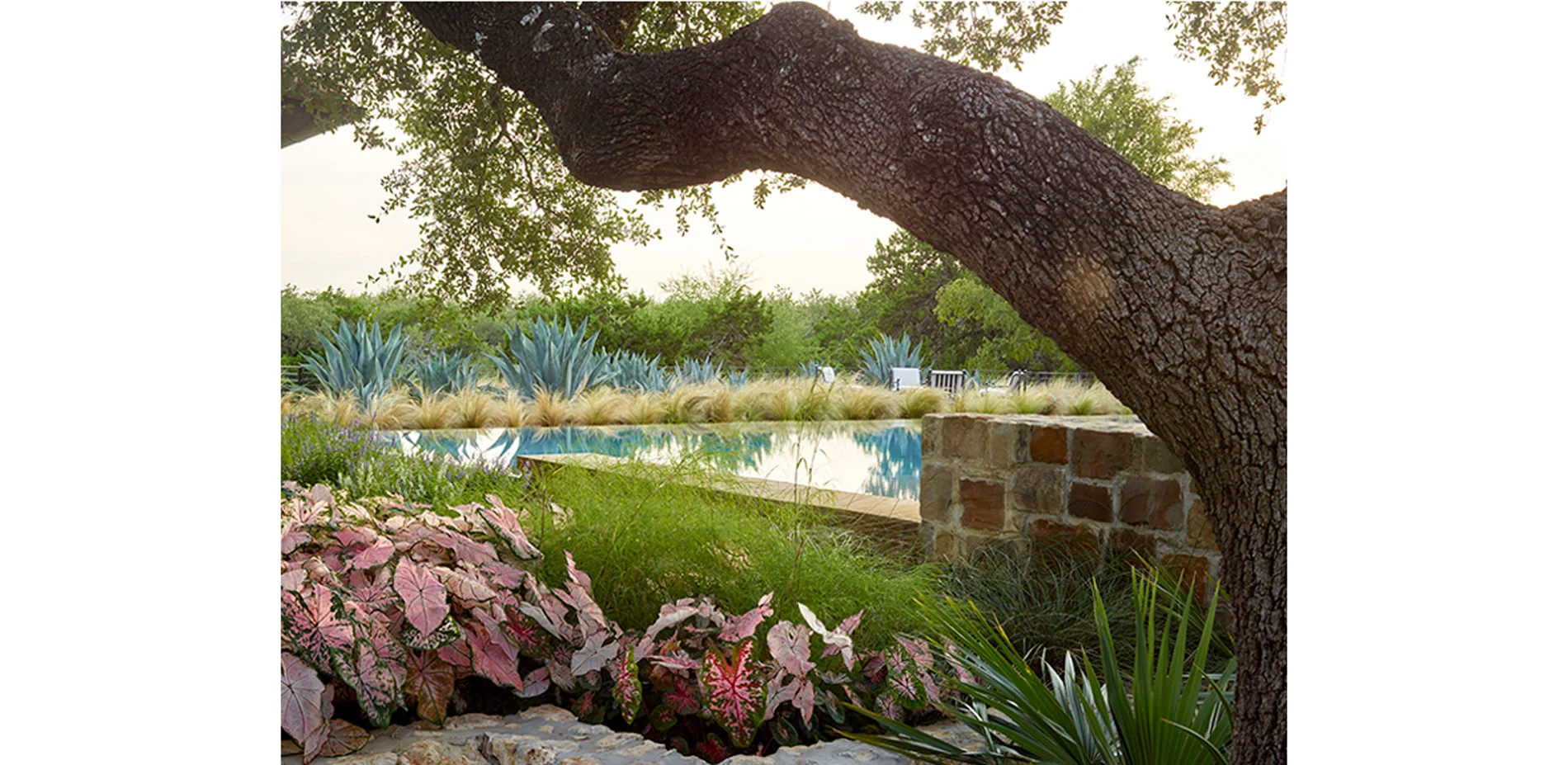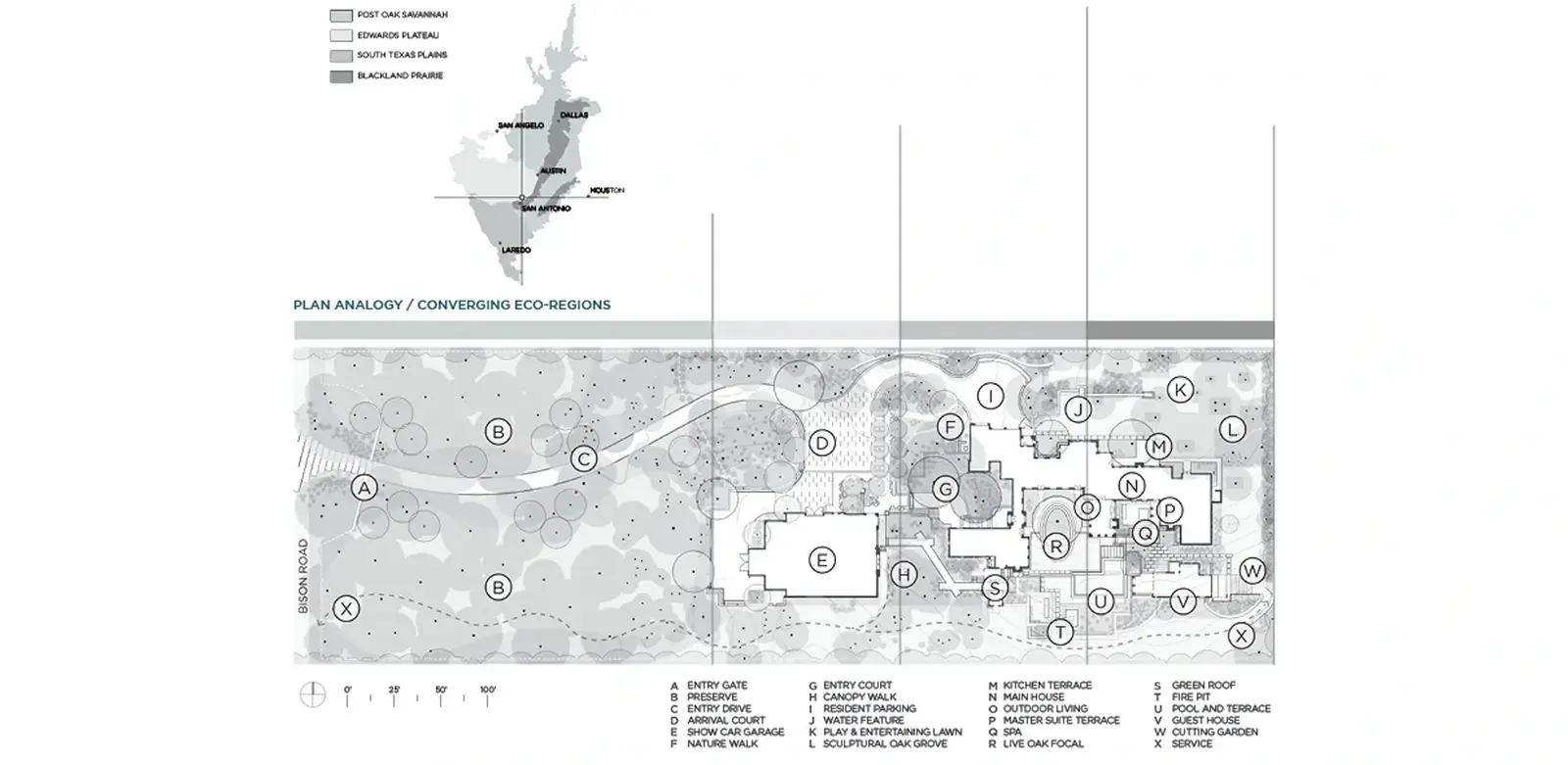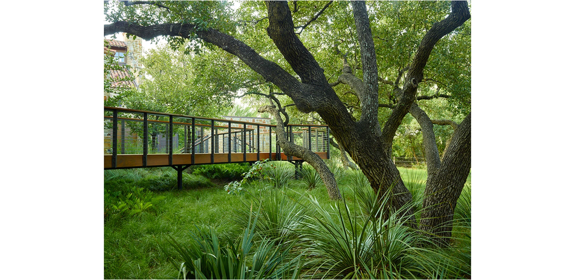This stunning residential project draws inspiration from the oak savannas, prairies, and plains of Southeast Texas. Throughout the five acres of the site, a variety of experiences have been created to bring nature to the forefront. An elevated walkway leads through a canopy of large oaks; a pool and spa reflect the sky; green roofs help hide small structures; an entry set amid native grasses, sedges, and ferns welcomes visitors; paved areas softened with natural elements facilitate drainage; and a variety of outdoor living spaces serve as evocative garden rooms. Sustainable and subtle, this home offers an immersive escape where nature takes the lead.