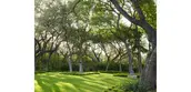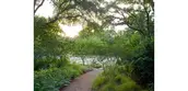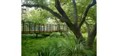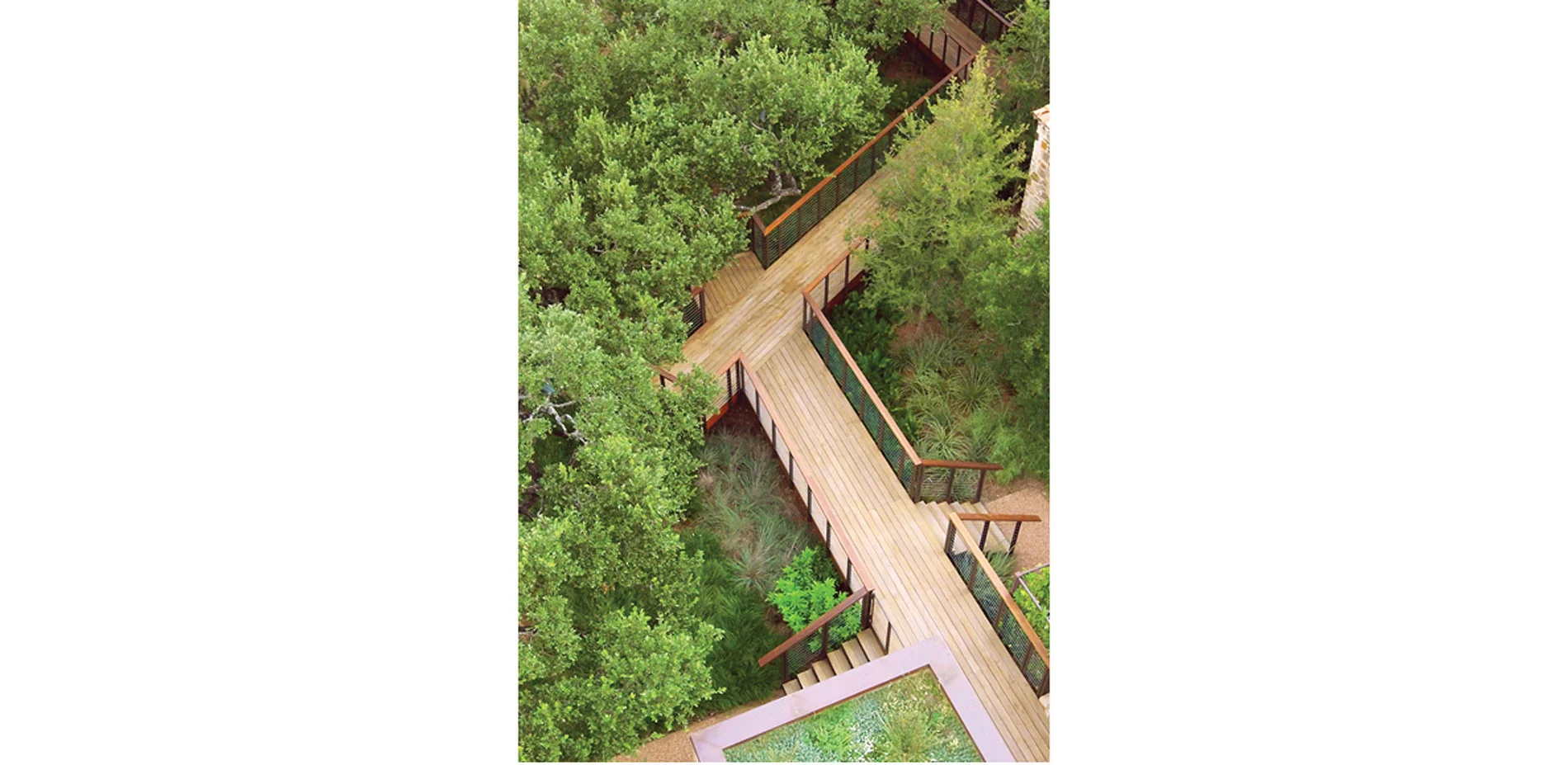 The Scrub Oak Savannah is home to many deer, rabbits, birds, and other wildlife. This area allows viewing without causing wildlife damage to the more fully developed garden rooms adjacent to the residence, with transparent fencing and plants securing the detailed garden rooms. An entry courtyard and canopy walk were developed around significant large oaks, facilitating accessible circulation to and around the residence and the garden rooms on the site's ridge at the rear. Tree canopies are viewed from within, further exaggerating and heightening the differences of this site's ecology and topography.