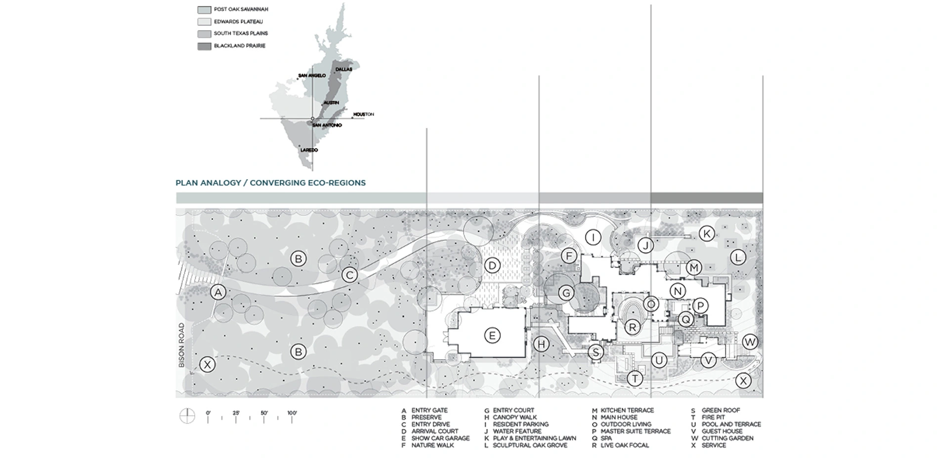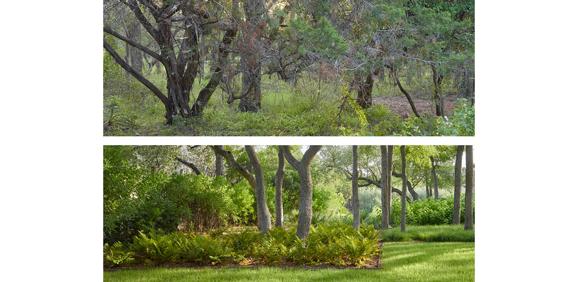 This residence is located just northwest of downtown San Antonio, Texas, in an unincorporated and undeveloped area known as Hill Country Village. Defined predominantly by larger residential parcels, Hill Country Village is home to many who work in San Antonio, and is an escape to a more rural Texas lifestyle. Our client purchased this home shortly after its initial construction. Our planning and construction efforts occurred over two and a half years. The planning goal for the residence was to amplify and exaggerate all things natural and native within this incredibly diverse ecological area of Southeast Texas. Preservation zones for wildlife with walking trails, use of mostly natives, and artful subtle interventions, so as to not distract from what is significant in realizing our ambitions for the client – a retreat to the simple pleasures of nature within the context of sustainable and artful simplicity. The site includes many subtle eco-tones which closely resemble the oak savannahs, prairies, and plains of Southeast Texas. We aspired to fully embrace it's diversity in our approach, with opportunities for experiential moments that would make this residential landscape sustainable, meaningful, and memorable.