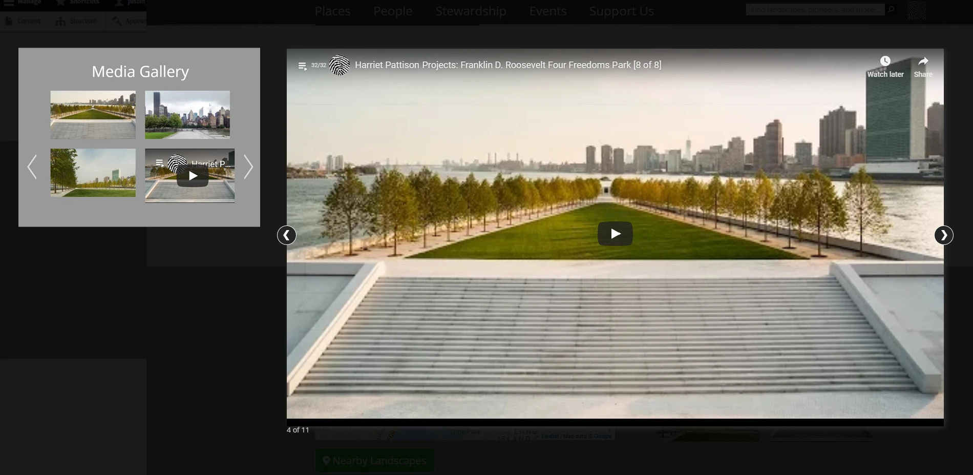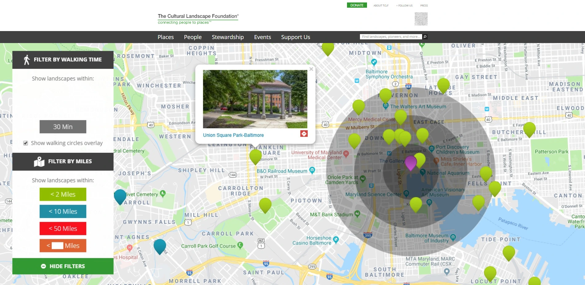 Each online guide includes essays (initially 50, but ever-growing in number) on sites and their designers, comprising a visually engaging, digital inventory of cultural landscapes searchable by type (e.g. Neighborhood Park, Scenic Reservation), style (e.g., Modernist, Picturesque), theme (e.g., Urban Renewal, Nature Conservation), and designation (e.g., National Historic Landmark, National Natural Landmark). TCLF and the NPS Northeast Regional Office have worked together closely to produce the guides, identifying, researching, documenting, and vetting a varied collection of landscapes in each subject city. Advised by NPS and TCLF staff, interns conducted field work and research in order to develop original documentary essays about the history, design, and current condition of the selected sites, as well as biographical essays about their designers. The essays (which are also fully integrated with and linked to the What's Out There database) are accompanied by contemporary photographs that illustrate the design character of the landscapes and the oeuvres of the designers. Moreover, the sites within each city are displayed on an interactive map and are linked to TCLF's recently updated What's Nearby feature, which allows users to see the landscapes within a customizable distance of their current location, with the sites presented in a color-coded display. Users can also filter the nearby landscapes according to walking time, in increments of 10, 20, or 30 minutes, roughly corresponding to distances of 0.5, 1, and 1.5 miles. This functionality is an essential enhancement to the guides, encouraging exploration of the urban environment on foot.