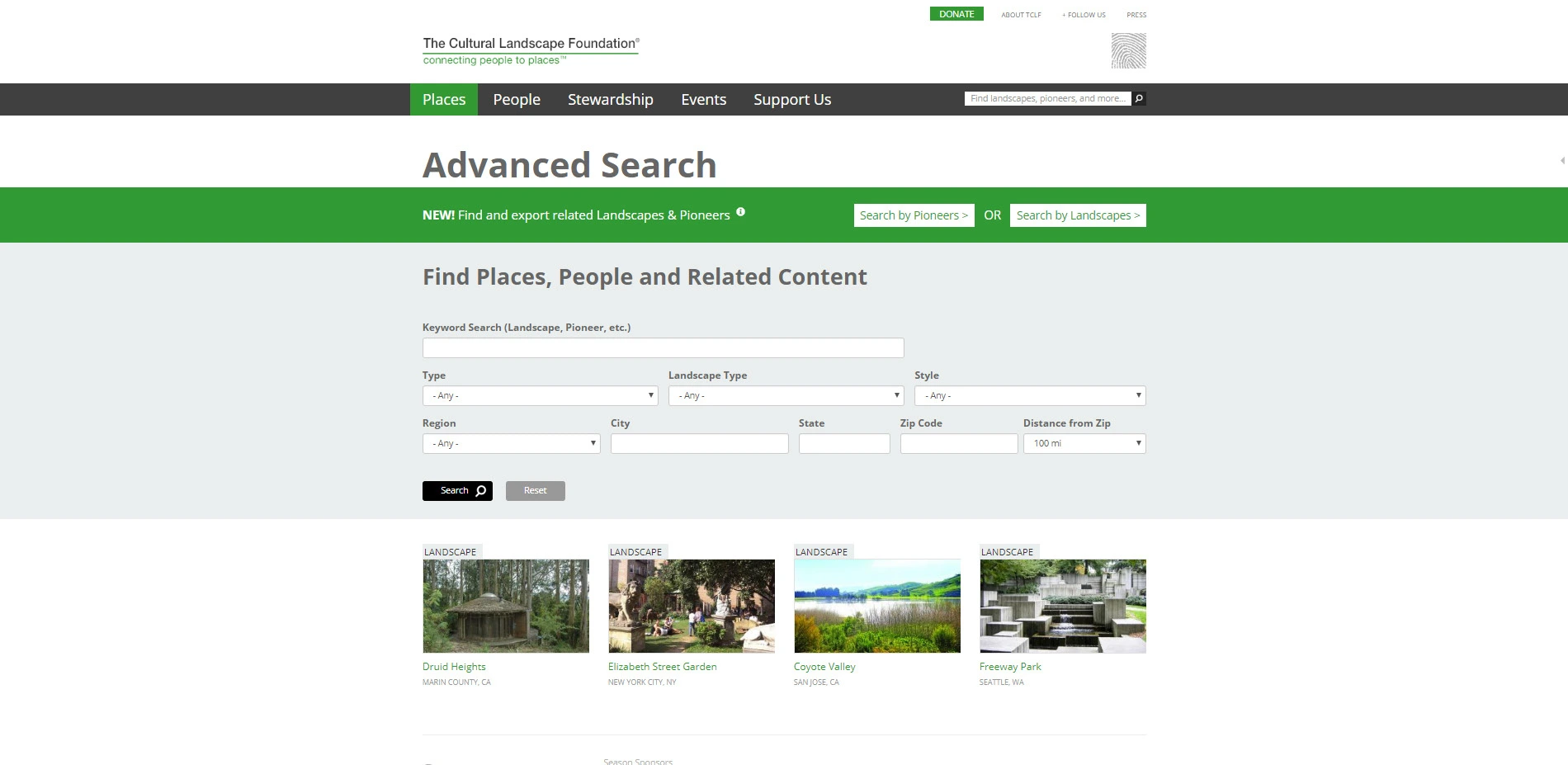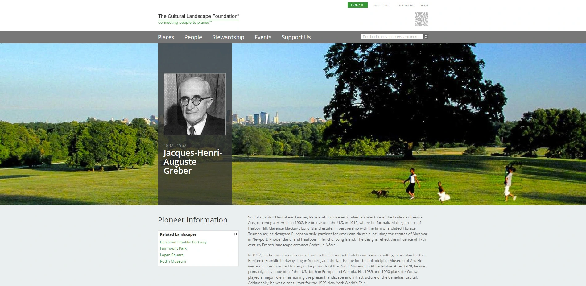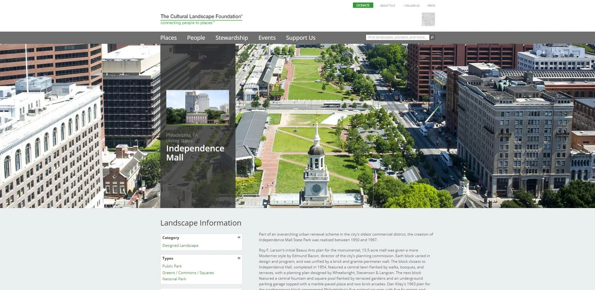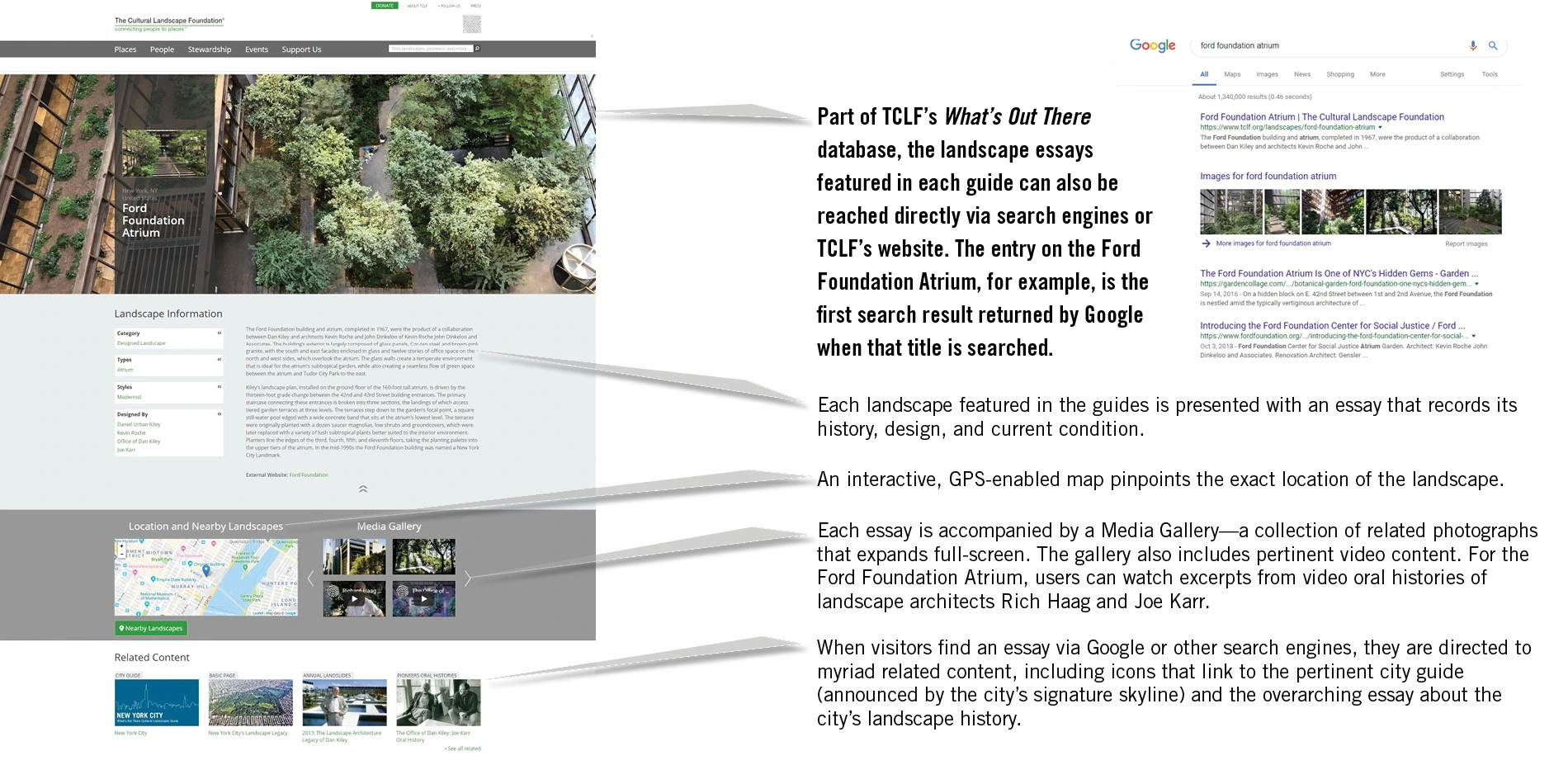 An outgrowth of The Cultural Landscape Foundation's What's Out There database, the What's Out There Cultural Landscapes Guides artfully present the landscape legacy of five of the nation's great East Coast cities. Produced in partnership with the National Park Service and offered free to the public, each online guide includes essays on scores of sites and their designers, comprising a visually engaging and constantly expanding digital inventory of landscapes searchable by type (e.g. Neighborhood Park), style (e.g., Modernist), theme (e.g., Urban Renewal), and designation (e.g., National Historic Landmark). Meant to broaden the traditional audience for landscape architecture, the guides allow the sites to be grouped and understood through new interpretive lenses, highlighting their connections to larger cultural and historical themes. The guides are also seamlessly linked to myriad related content on TCLF's website and are integrated with GPS-enabled, interactive maps, making them especially useful to digital-native users and encouraging exploration of the urban environment on foot.
