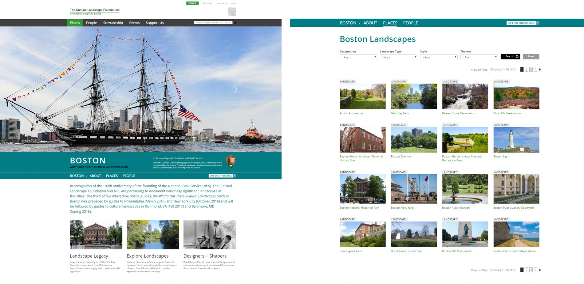 In addition to their interactive features, each guide also includes an overarching essay that spans multiple centuries and chronicles the city's cultural landscape legacy, richly illustrated with maps, archival images, and contemporary photographs. These introductory essays frame the history of the city from its earliest origins and chart its growth to the present. The guides also present a brief history of the NPS and identify several themes that communicate the breadth of cultural landscapes within its purview. The list of sites can then be sorted to reveal the landscapes associated with each theme (i.e., Nature Conservation, Lifeways and Cultural Associations, Transportation and Industry, City Shaping and Urban Planning, Urban Renewal, Patriotism, Historic Preservation, and Recreation). The sites can also be sorted according to several designations recognized by the NPS, such as their listing in the National Register of Historic Places, as a National Historic Landmark, or as a National Natural Landmark, etc. These designations and their importance are explained on a separate web page within each guide.