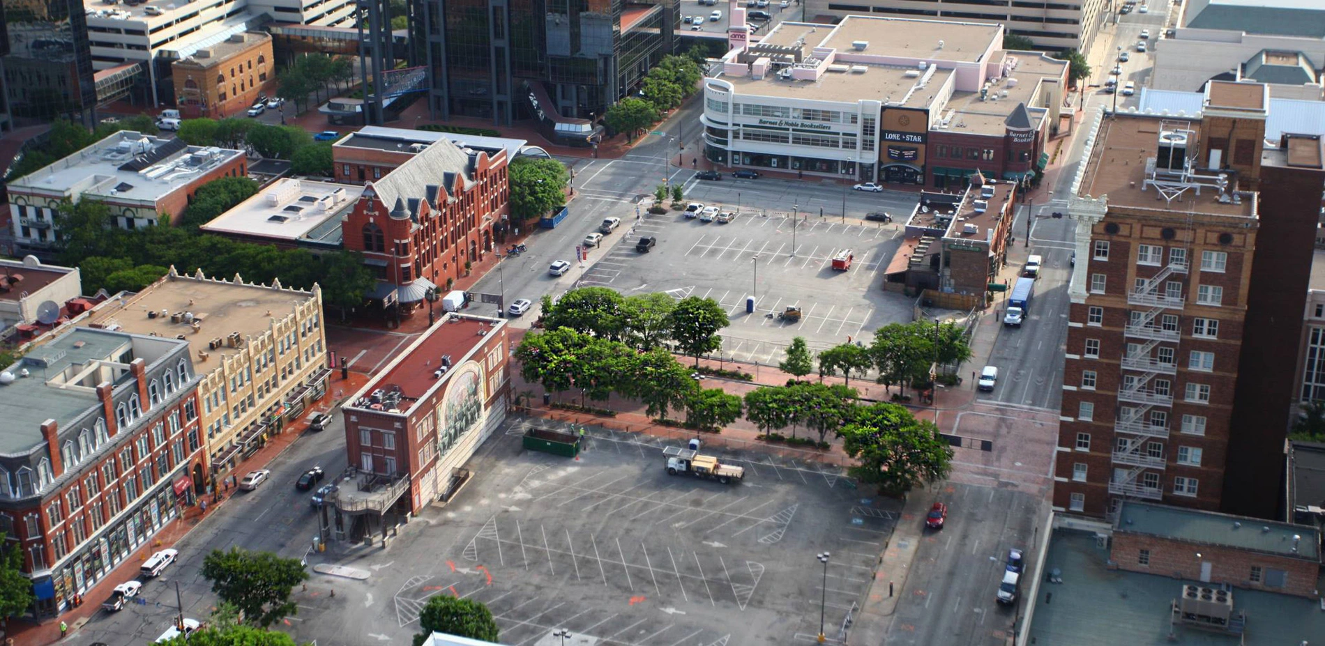 Sundance Square Plaza is the capstone of a 30-year endeavor to regenerate the historic core of Fort Worth, Texas. For decades the downtown civic center was a pair of parking lots bisected by Main Street. With a rapidly growing populace and community-centric roster of events, city officials had nowhere else to host holiday parades, art festivals, and other gatherings. During that time, several successful projects catalyzed the site's transformation into a vibrant commercial, business, and entertainment district. However, the historic core lacked a center until the Plaza was built.