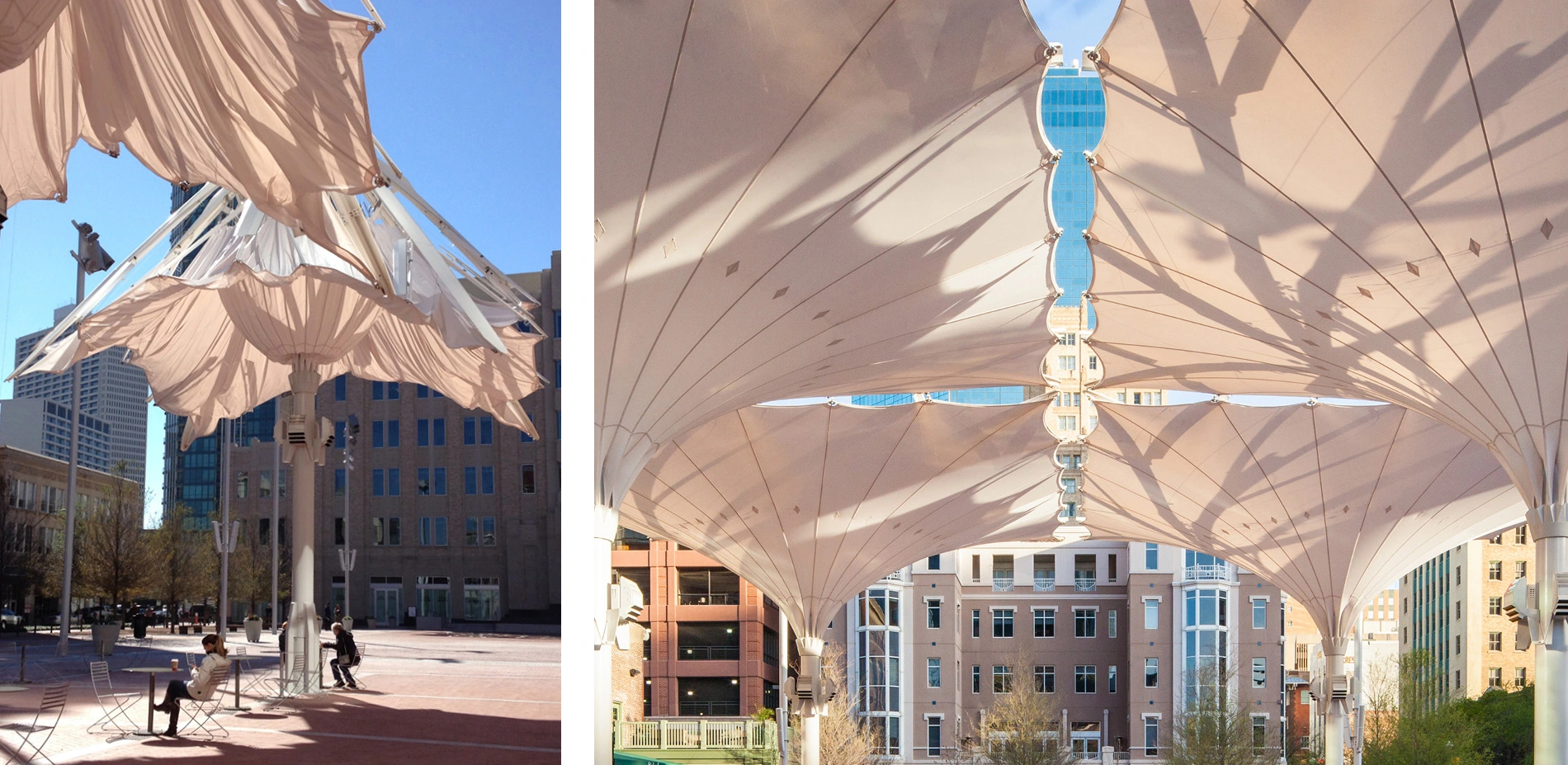 Primary among these is a grouping of landmark, operable umbrellas, the first of their kind in the United States. Reaching 32 feet high and spanning 40 by 40 feet, they create a collective 6,400 square feet of shade and reduce mid-day pavement surface temperatures by 22 degrees Fahrenheit. Visitors are known to stop and watch the Teflon fabric unfurl from their telescopic masts in the mornings, although this can be retracted if cool temperatures entreat sunlight to warm the rich brick pavers. In the evenings, the umbrellas are illuminated by color-changing LED lamps that engage the entire Plaza in a brilliant light show.