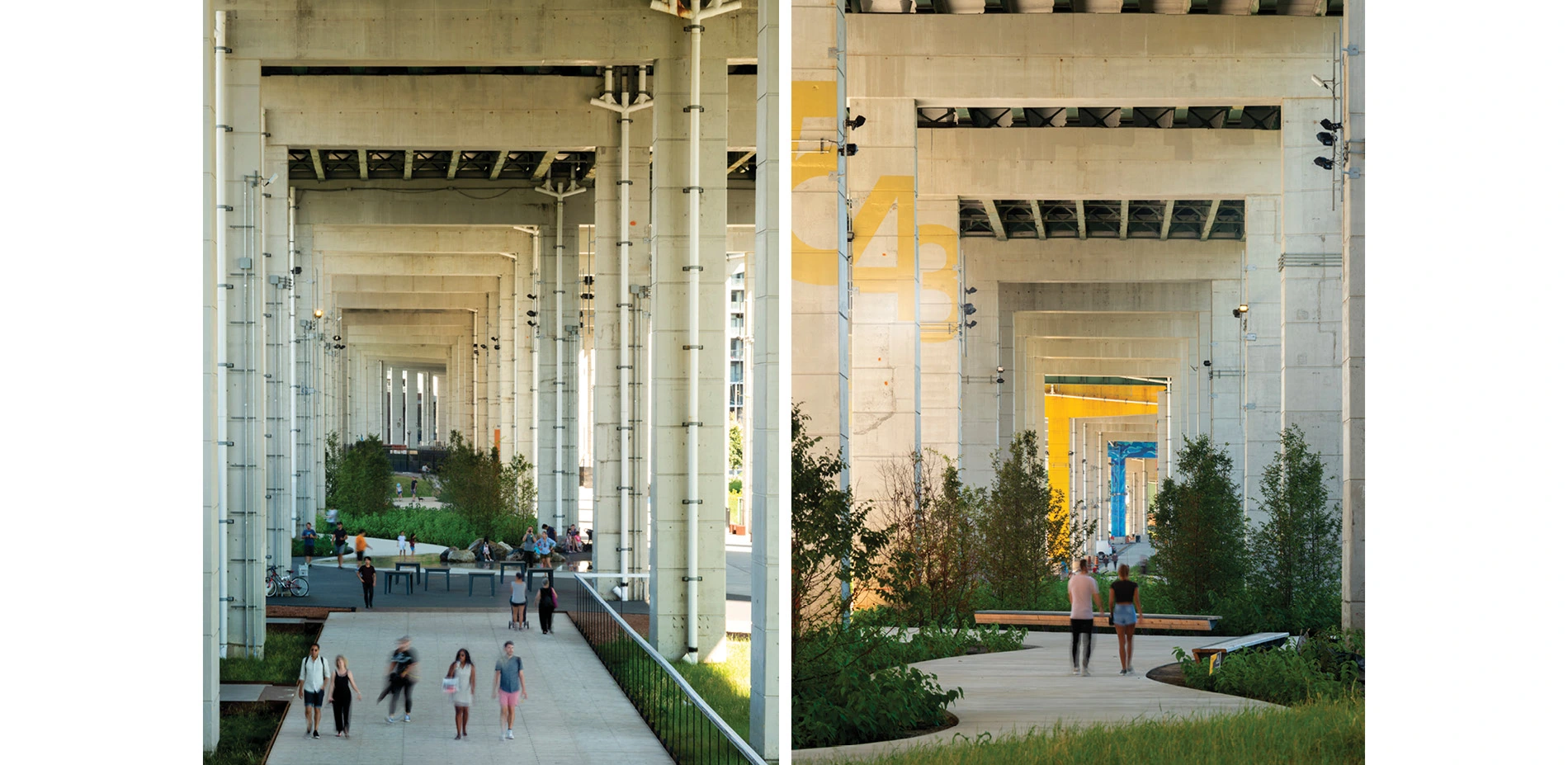 The project stitches together seven neighbourhoods, expands access to key areas such as Fort York National Historic Site and the Central Waterfront, and creates a new gathering place for Toronto's growing population. The starting point for conceptualizing the project was the structure itself. The expressway's series of supportive concrete columns - "bents" - create a series of 'civic rooms' that can function collectively or on their own to offer spaces for a diverse range of programming, events and public life. The underside of the expressway, varying in height from intimate to a majestic 15-metres, is re-cast as a metropolitan-scaled piece of public equipment with the bents offering structural support for clamps, cables, power and lighting to support everything from day to day public life through to large scale community or civic gatherings.