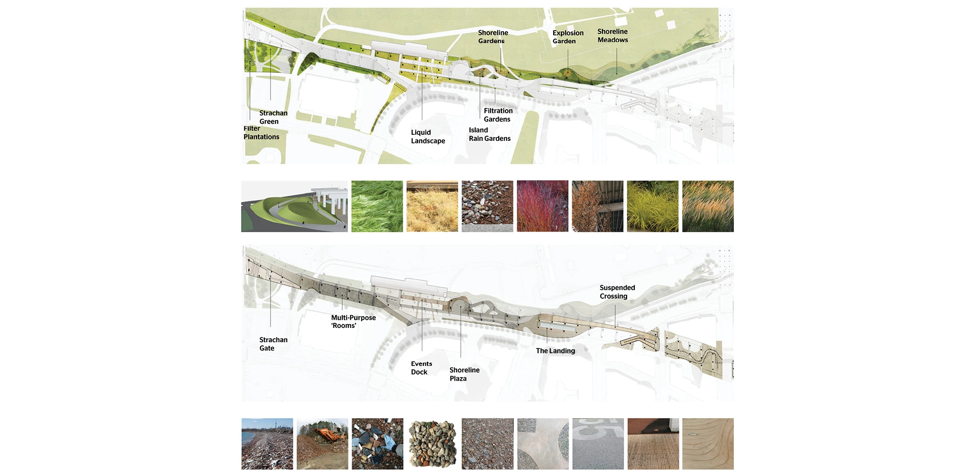 Strachan Gate includes a highly flexible open-air theatre and balcony overlook with cascading yellow cedar timber bleachers and a series of rotating backdrop panels to screen from adjacent road noise. The public space is integrated with public washrooms and a green room to serve performers below. Directly adjacent and using fill entirely from excavated on-site materials, a sloped amphitheatre lawn expands seating capacity for large performances and events. A 72m long cedar "wharf" in front of the Fort York Visitor Centre offers another event space, adjacent to a "liquid landscape" of native grasses and rain gardens to treat stormwater run-off.